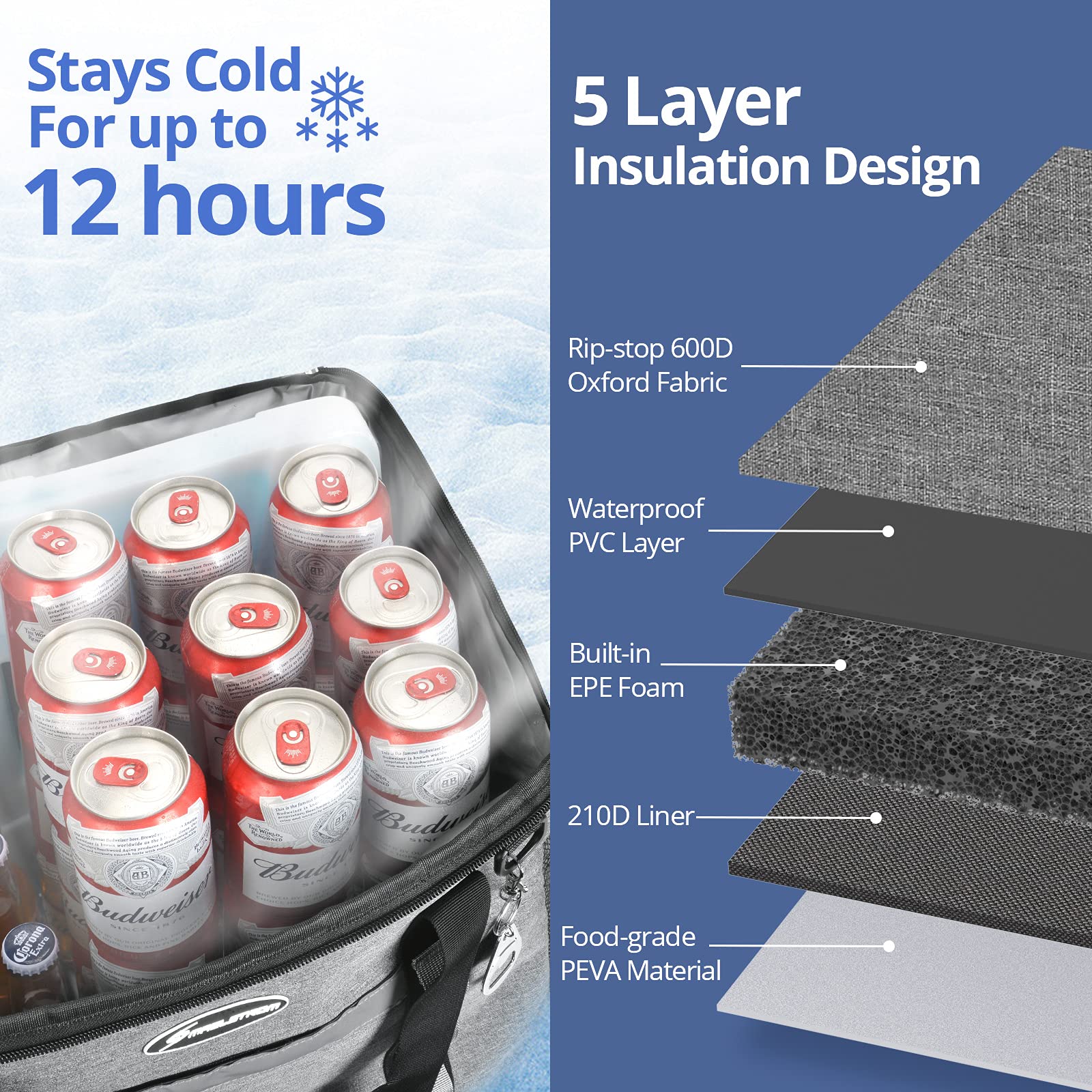 EXTRA LARGE CAPACITY - Extra-large size yet weighs only 1.65 lbs. The Maelstrom Icy Hollow Soft sided cooler will hold up to 75 cans of your favorite drinks plus 2-4 ice packs; or with 60 cans you can add 15 lbs. of ice for long lasting coldness. Whether it's camping, hiking, picnicking, or a BBQ party, the cooler bag easily packs a lot of food, fruits, beer, meat, or even seafood together. It’s large enough to carry all picnic essentials for the whole family!