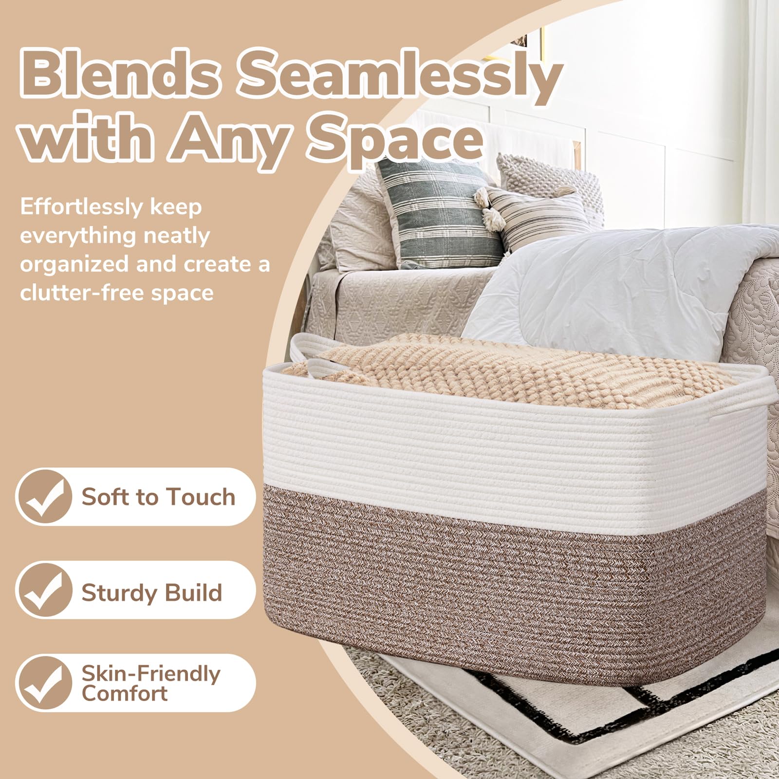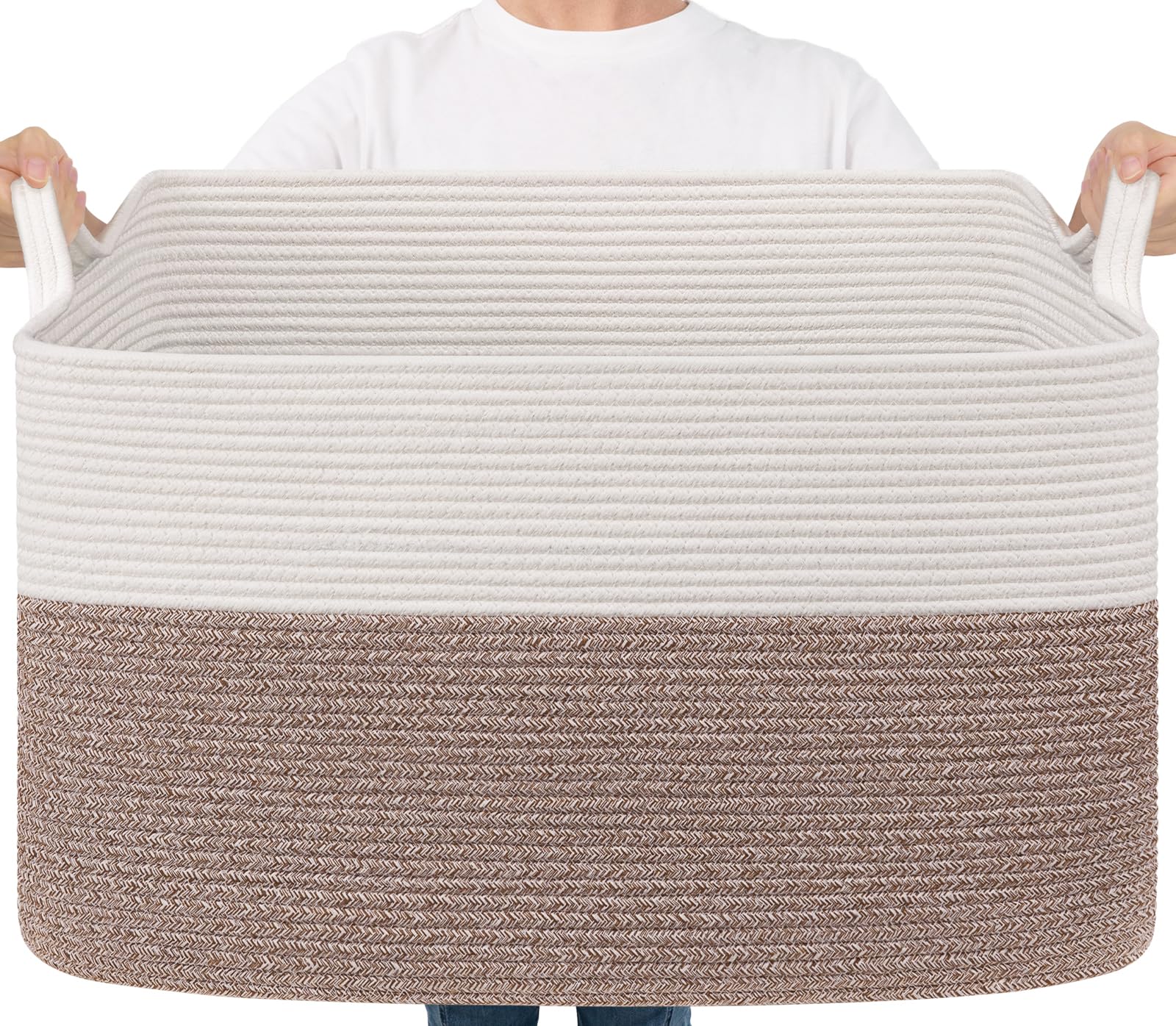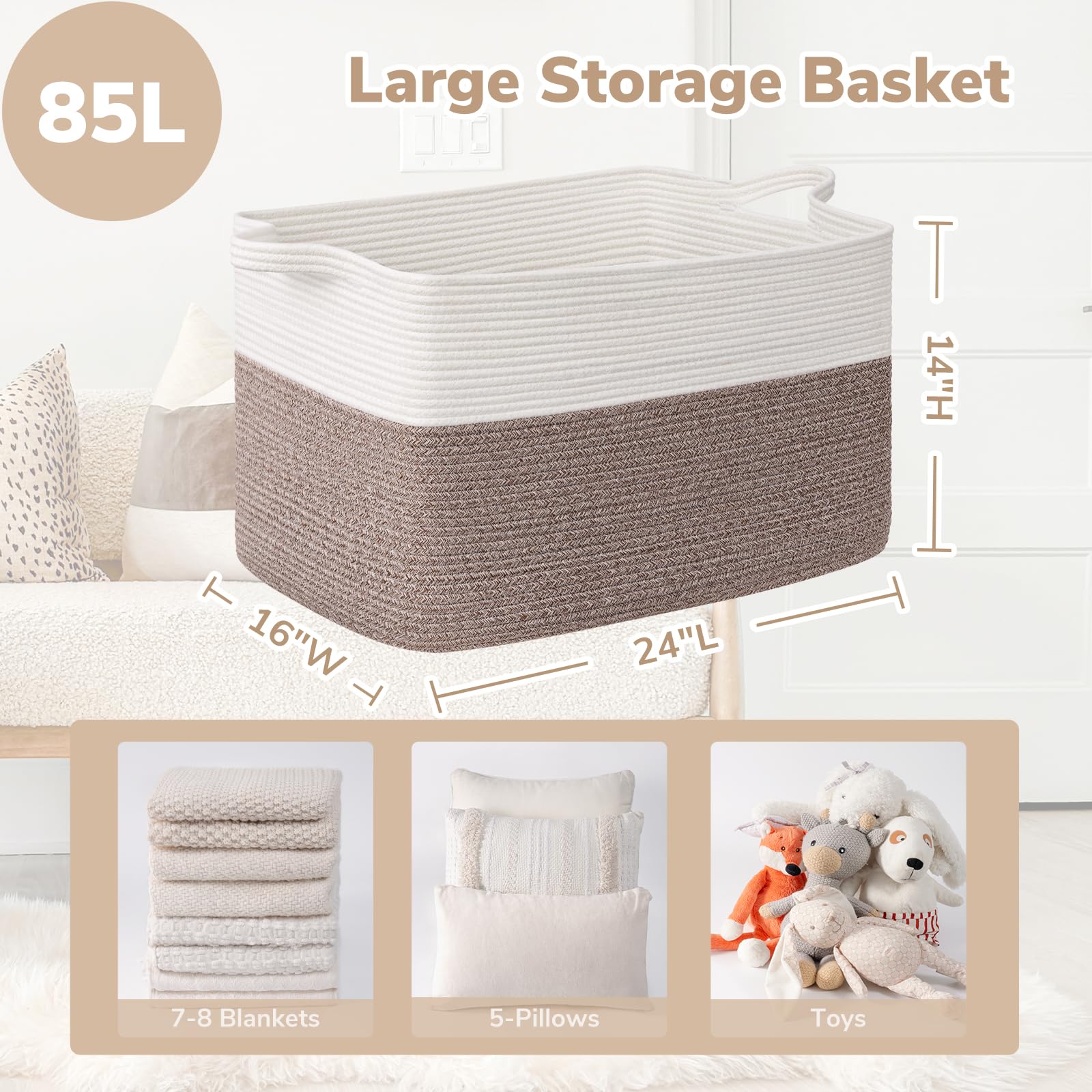Large Capacity: 23.6"L x 15.7"W x 13.8"H, this large rectangle basket with 85L capacity is perfect for storing throw blankets, pillow, cushions, clothes, towels and stuffed animals