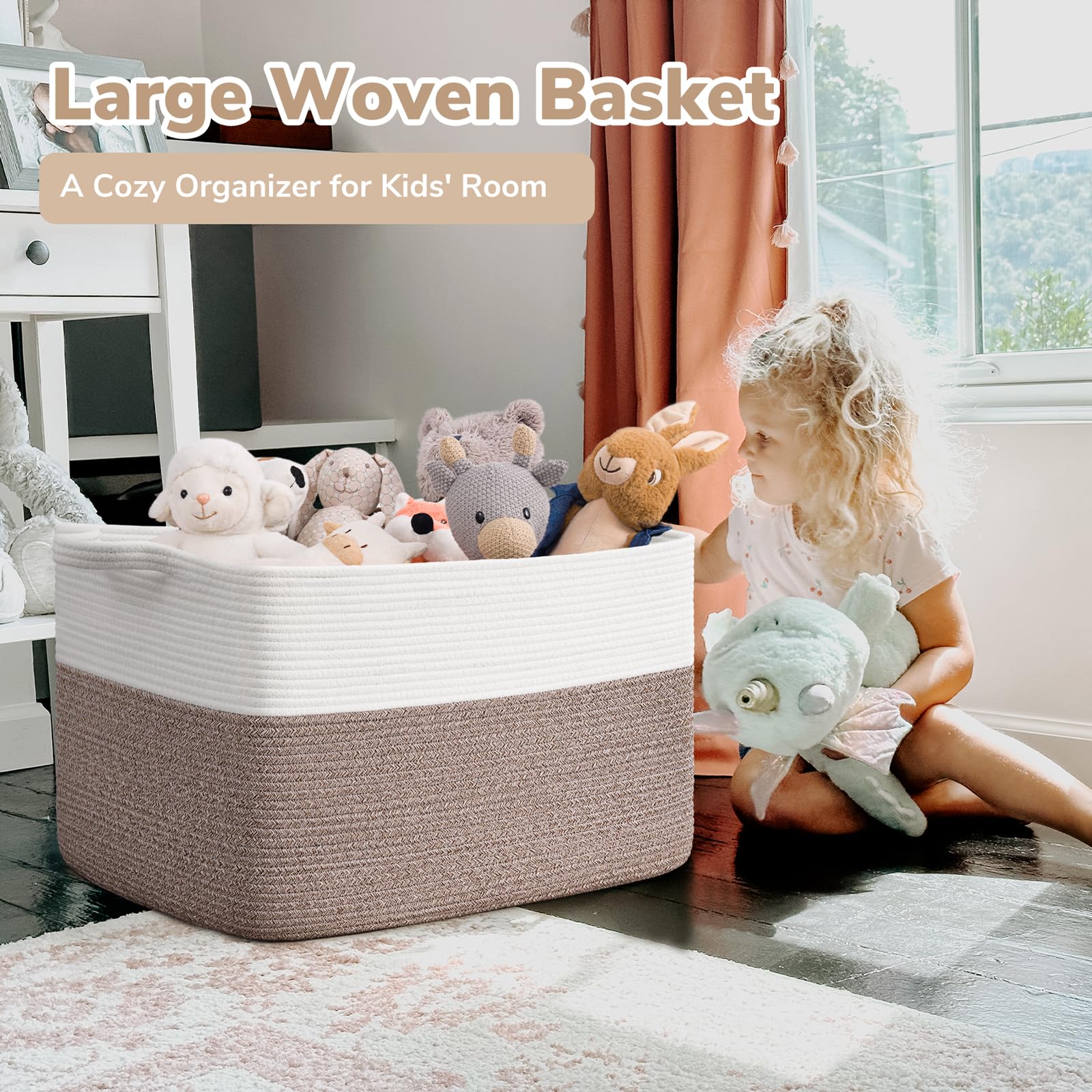 Toy Basket for Nursery Home Decor - Material: Cotton - Size: 23.6 x 15.7 x 13.8 inches - Multiple Use: You can have the storage basket in nursery, living room, bedroom, bathroom or laundry room to hold your clothes, blankets, toys storage etc. - Machine Wash: You can put the basket in a laundry bag to wash it by machine or hand wash.