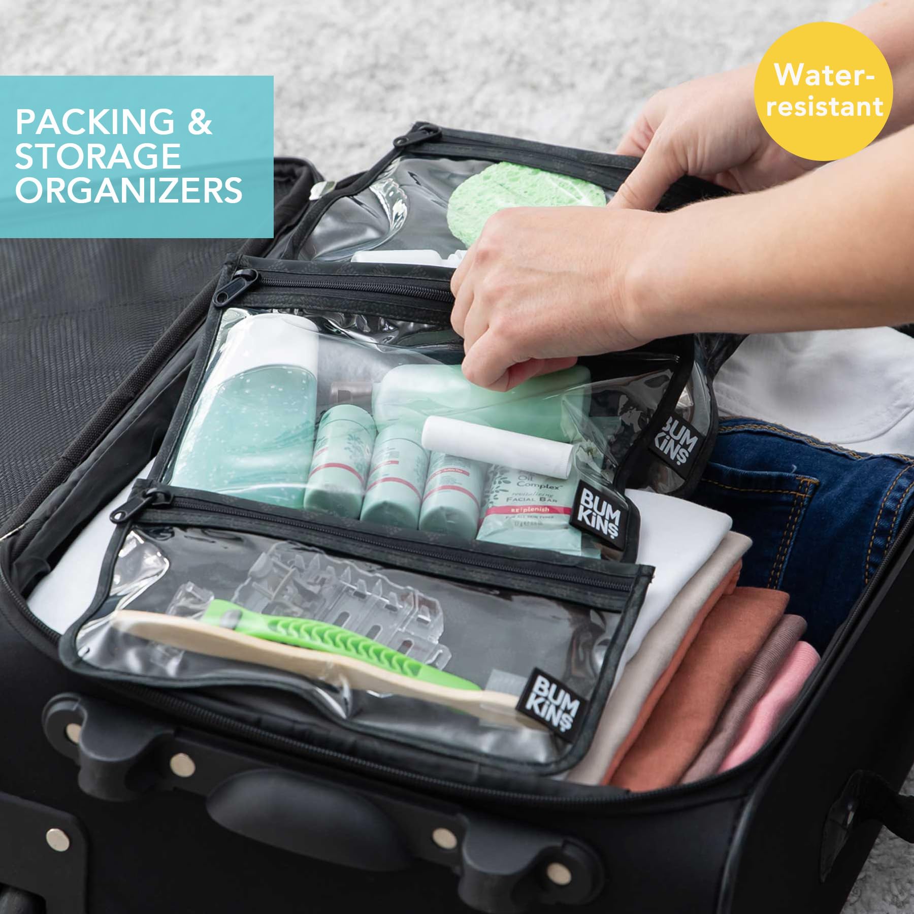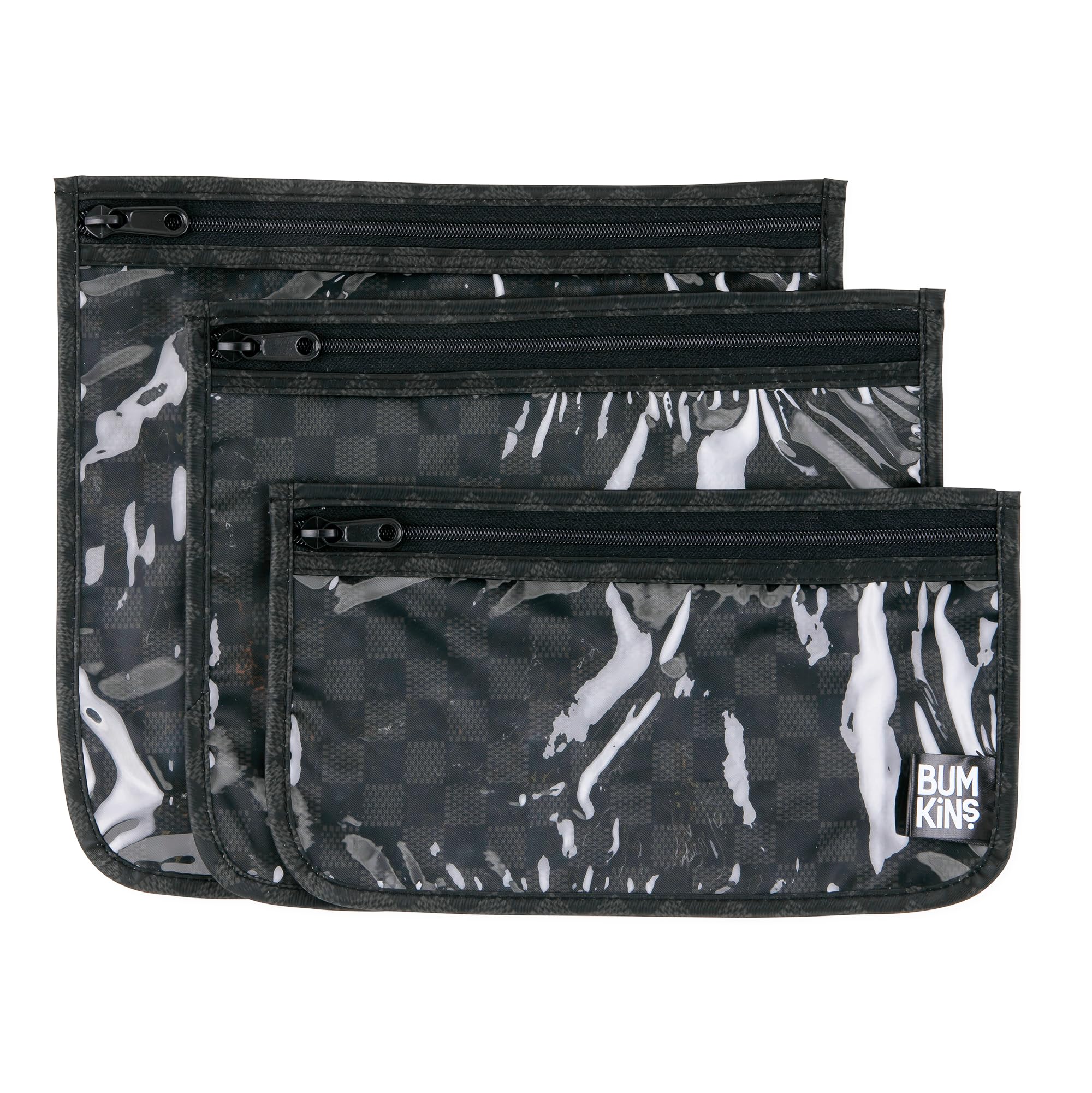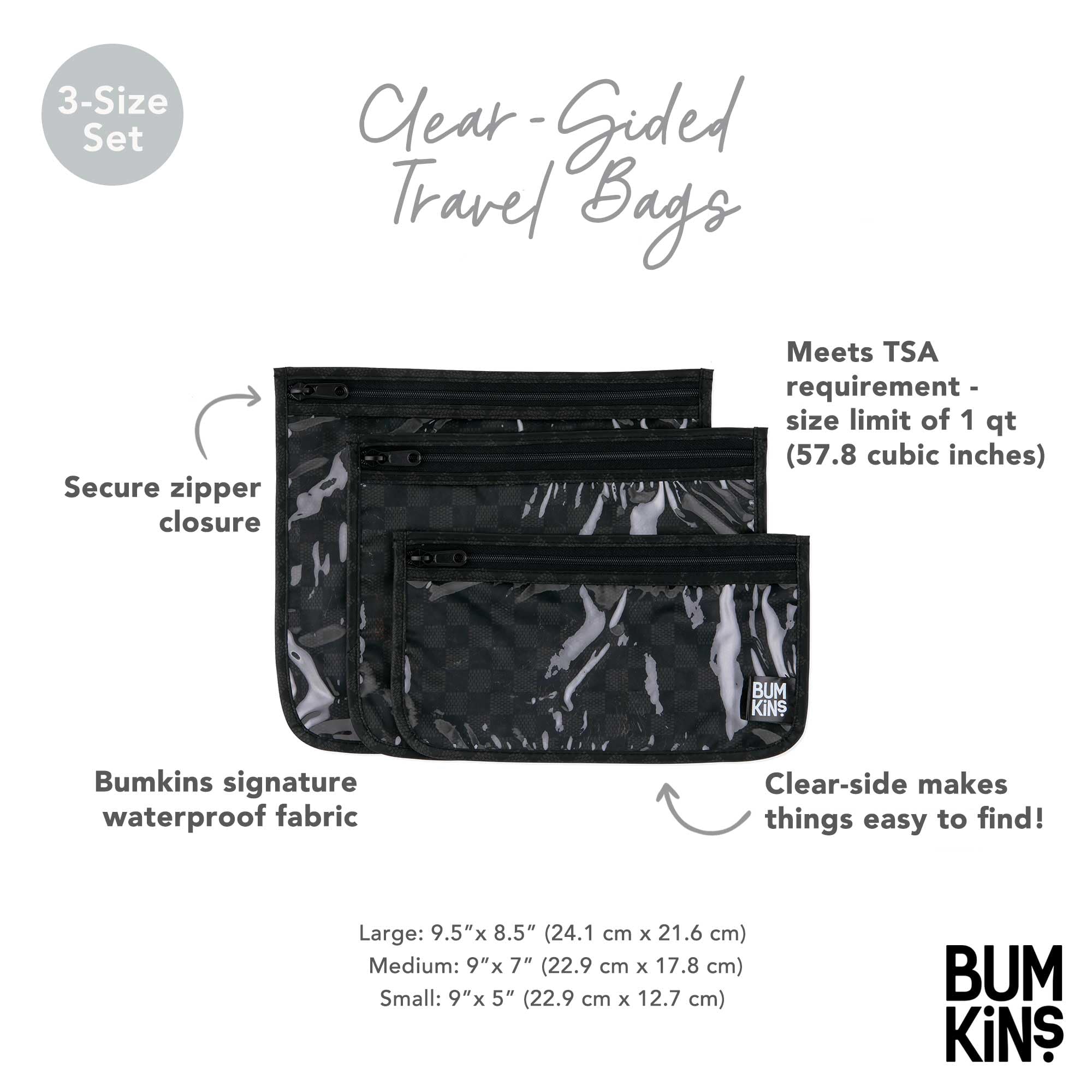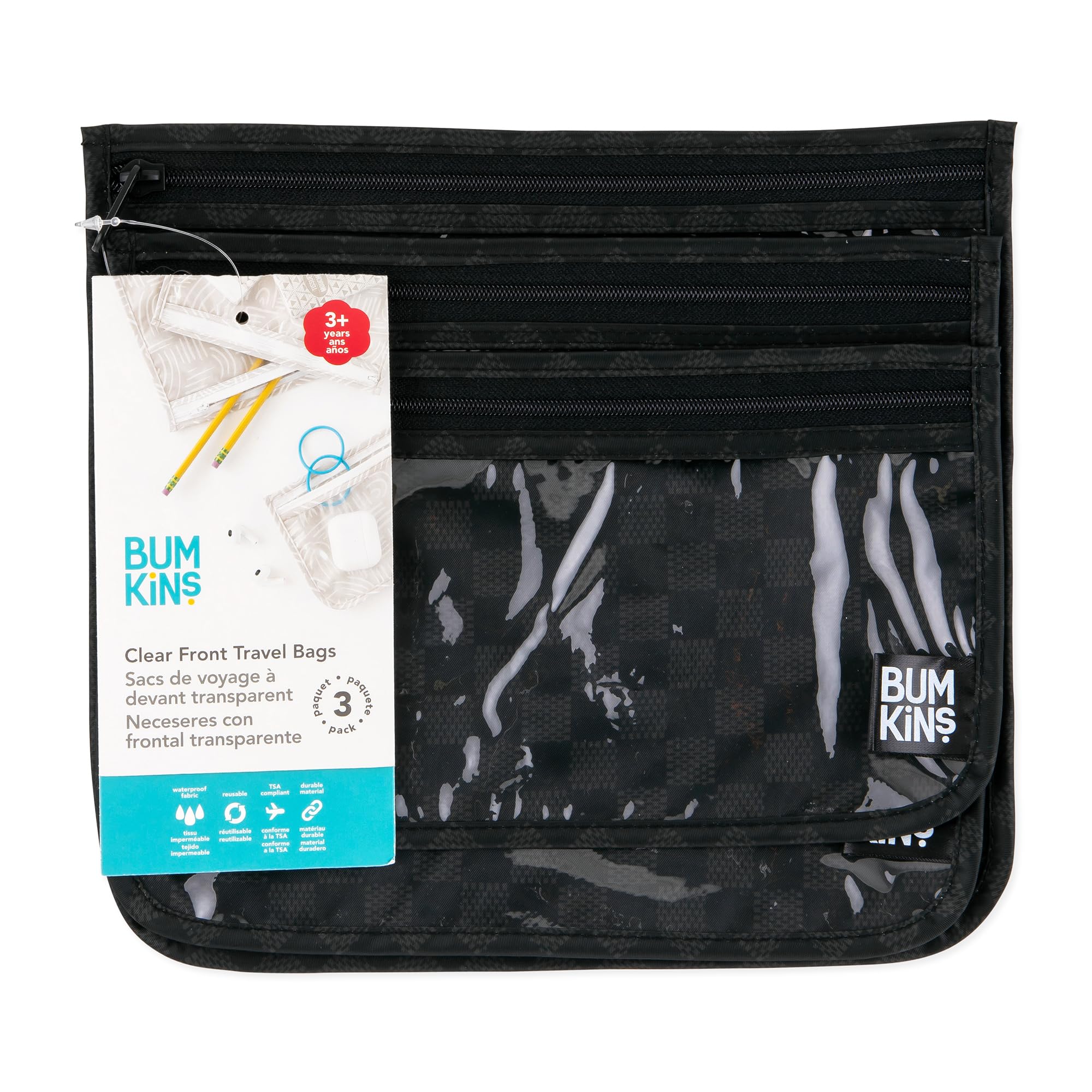 A smart alternative to single-use plastic bags to keep things organized, our clear-sided 3-pack reusable travel pouches are TSA compliant, making it easy to go from your day-to-day and then through security. Not just for airplane travel – these travel bags make excellent organizers for toys, accessories, cosmetics, electronics, and more. Pack and stash inside your purse, travel bag, diaper bag, tote bag or backpack. The bags are lightweight and lay flat, so when traveling they take up less space when empty than other containers and cubes. With a strong and durable zipper closure, our bags keep your items secure. Bumkins uses third party labs to ensure the products we manufacture comply with CPSC and CPSIA standards for BPA, Lead, and Phthalates. The set includes 3 sizes: large: 9.5in x 8.5in; medium: 9in x 7in; small: 9in x 5in. Meets TSA requirement for size limit of 1 quart-sized bag (57.8 cubic inches). For over 30 years, Bumkins has been creating thoughtful and responsibly made essentials for babies and kids, making parenting easier so families can cherish those special moments. Designed in Arizona, responsibly made in China.