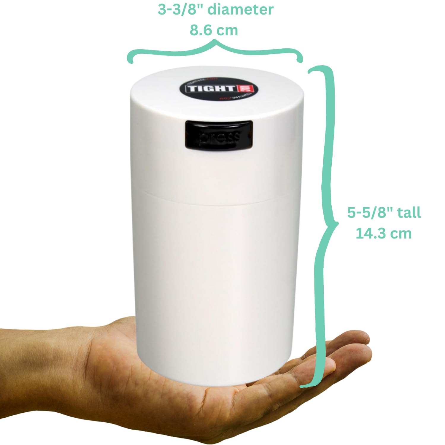 Tightvac TV3 dimensions are 5-5/8" tall x 3-3/8" diameter (14.3 cm x 8.6 cm). Our airtight containers are available in different sizes to ensure lasting freshness for all your storage needs.