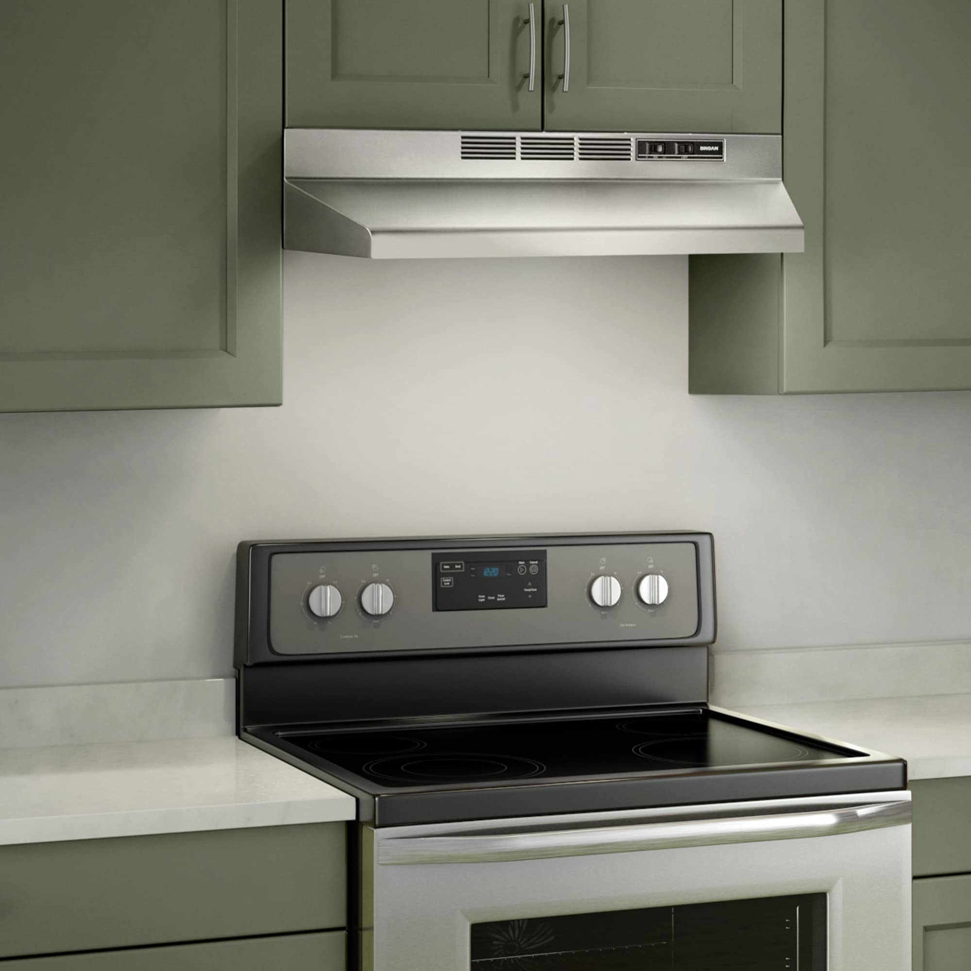 Product Description Upgrade your kitchen with the Broan Ductless Range Hood Insert and Incandescent Light! This versatile insert is the perfect solution to your ventilation needs serving as both an exhaust fan and overhead light for your stove. The stainless steel unit is designed to fit neatly underneath your cabinets to provide quality airflow in your kitchen. It installs as a non-ducted range hood with a charcoal filter that effectively removes smoke and odors from your cook space. The protective lamp lens distributes light evenly over the cooktop and accepts up to 75W bulb (not included). It's designed with smooth surfaces that clean easily and quick-release filters that can go in the dishwasher. Install the insert at least 18" above cook top. The sides are mitered and the bottom edge hemmed, with no sharp edges for safety and good looks. The unit has a two-speed fan switch and separate light switch and the motor is permanently lubricated. For your convenience, this range hood can work in an ADA-compliant application and includes a 1 year limited . Enhance your home today with the Broan Ductless Range Hood Insert and Light! From the Manufacturer The 41000 series of non-ducted under cabinet hoods are made to exacting Broan standards, providing effective filtration, high quality and value. The range hood comes in a variety of appliance matching colors and widths, and includes a removable combination grease-charcoal filter for cleaner indoor exhaust recirculation, a fan designed for years of trouble free service, a protective lamp lens that distributes light evenly over the cook-top and control switches for fan speed and light activation. Installs as non-ducted only with charcoal filter. Accepts up to 75-watt light. Bulb not included. This range hood can work in an ADA-compliant application.