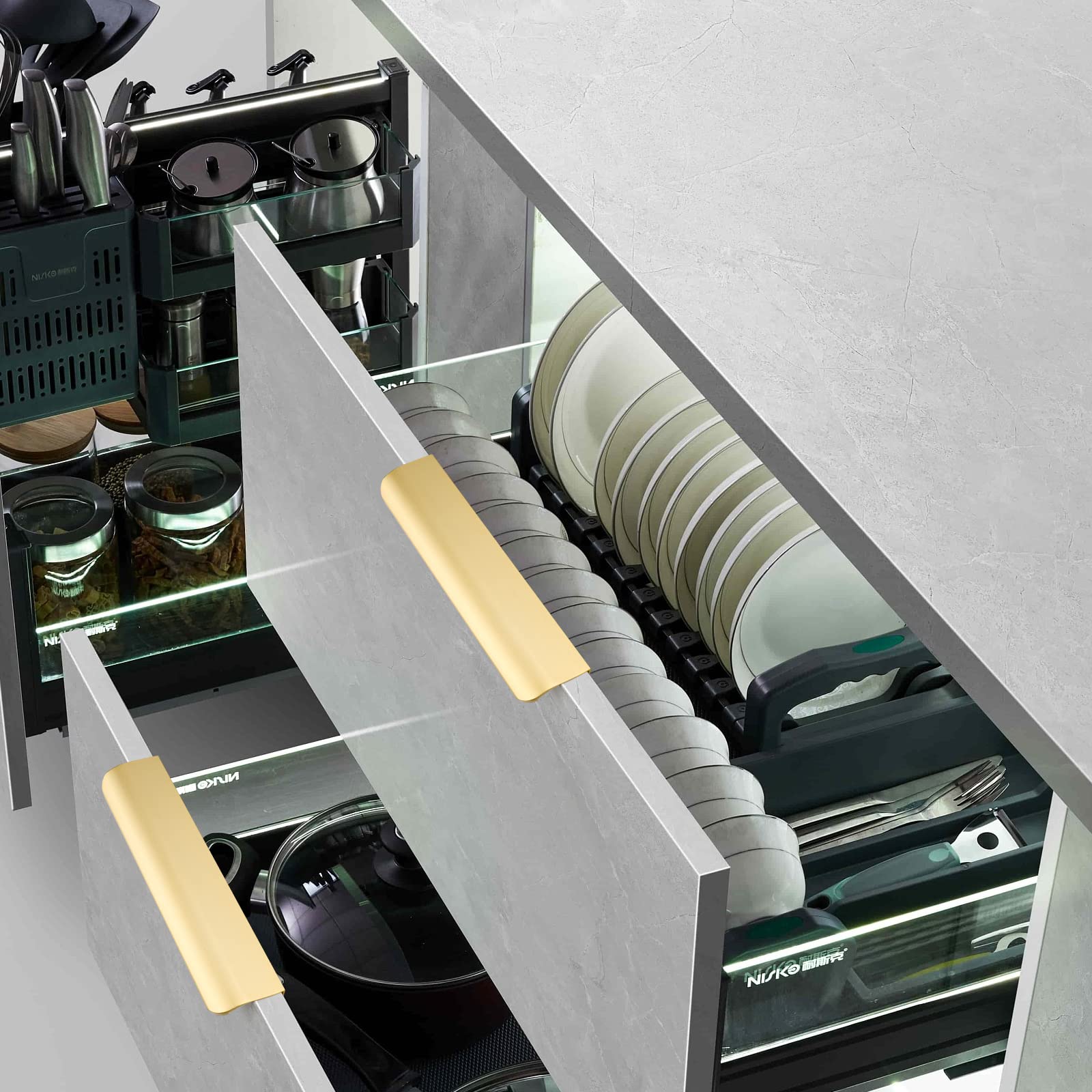 MATERIAL: The champagne gold cabinet pulls are crafted with premium-grade Aluminum Alloy. Thanks to electroplating process, pulls will not easy to fade, offering long-term durability & strength for all-purpose use.