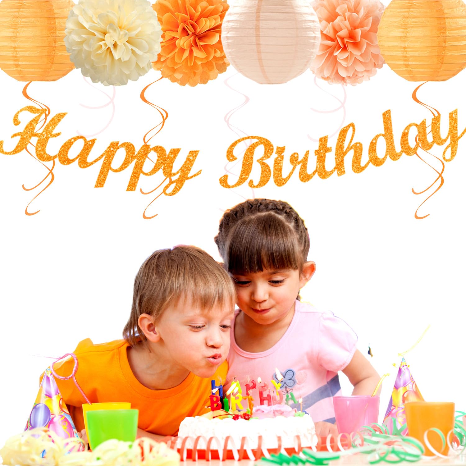 【Orange beige peach pink Birthday kits】This kits include 1pcs happy birthday banner, 1pcs circle dots paper banner, 4pcs tissue pom poms: 3pcs 10" and 1pcs 12" , 3pcs 8inch paper honeycom ball, 2pcs 8inch paper lantern, 4pcs 12inch paper flower fan, 6pcs Paper swirls hanging streamers