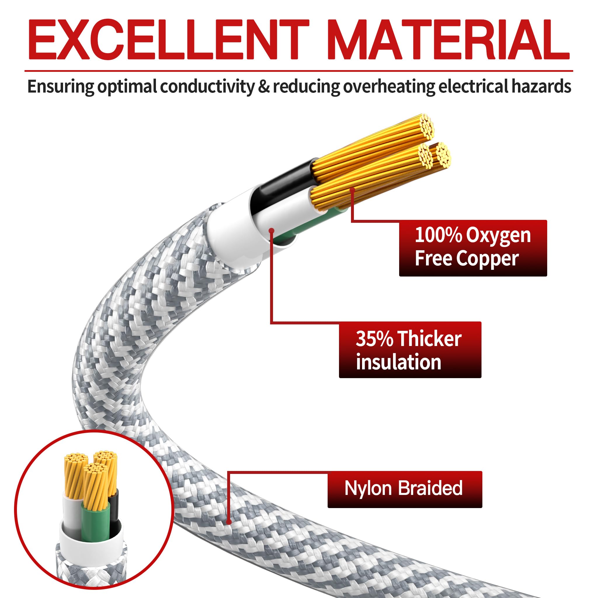 Durable Construction: 10 foot braided extension cord made of 3 strands of pure copper; 3 prong extension cord 10 feet provides efficient power supply; Reliability and efficiency indoor extension cord are capable of meeting most electrical needs