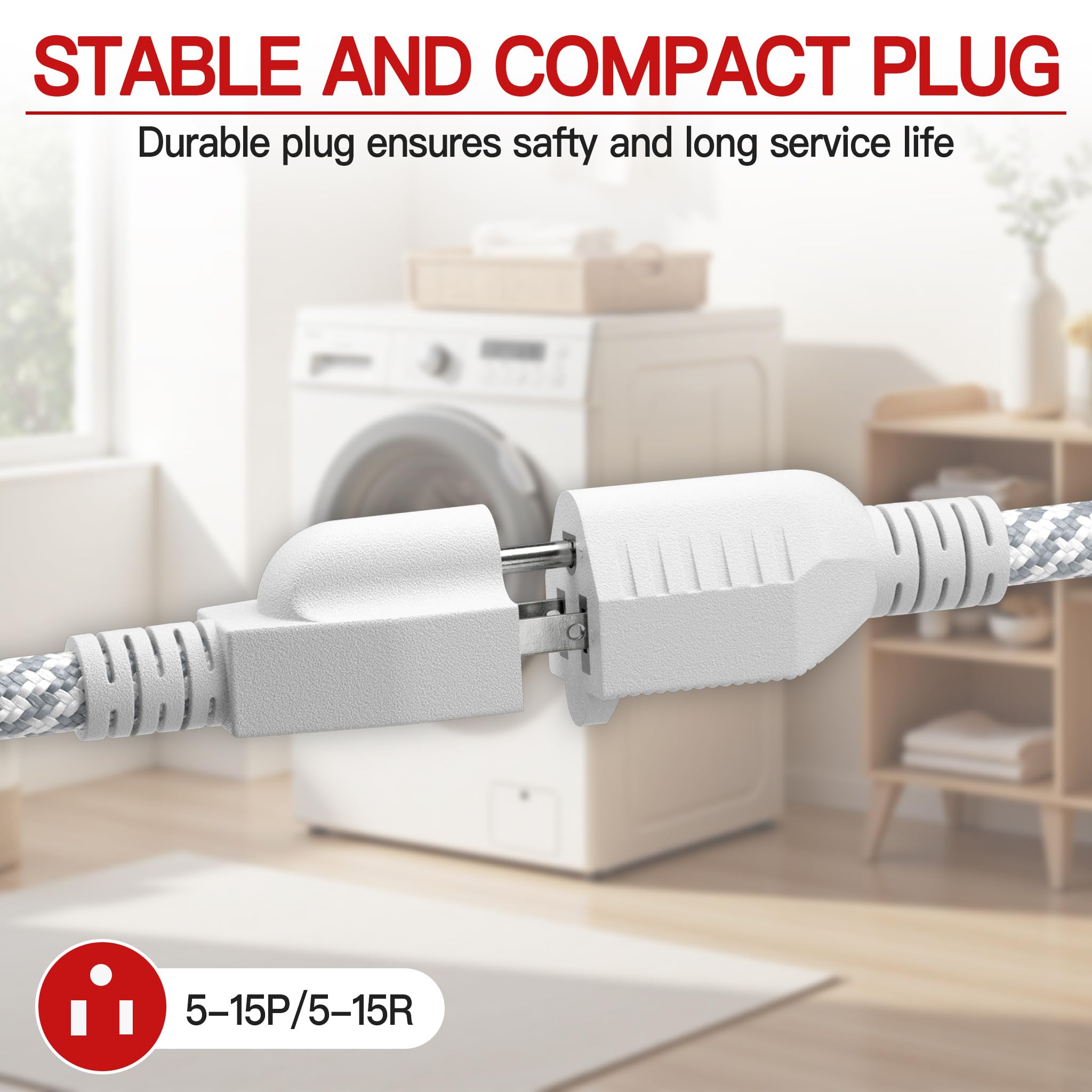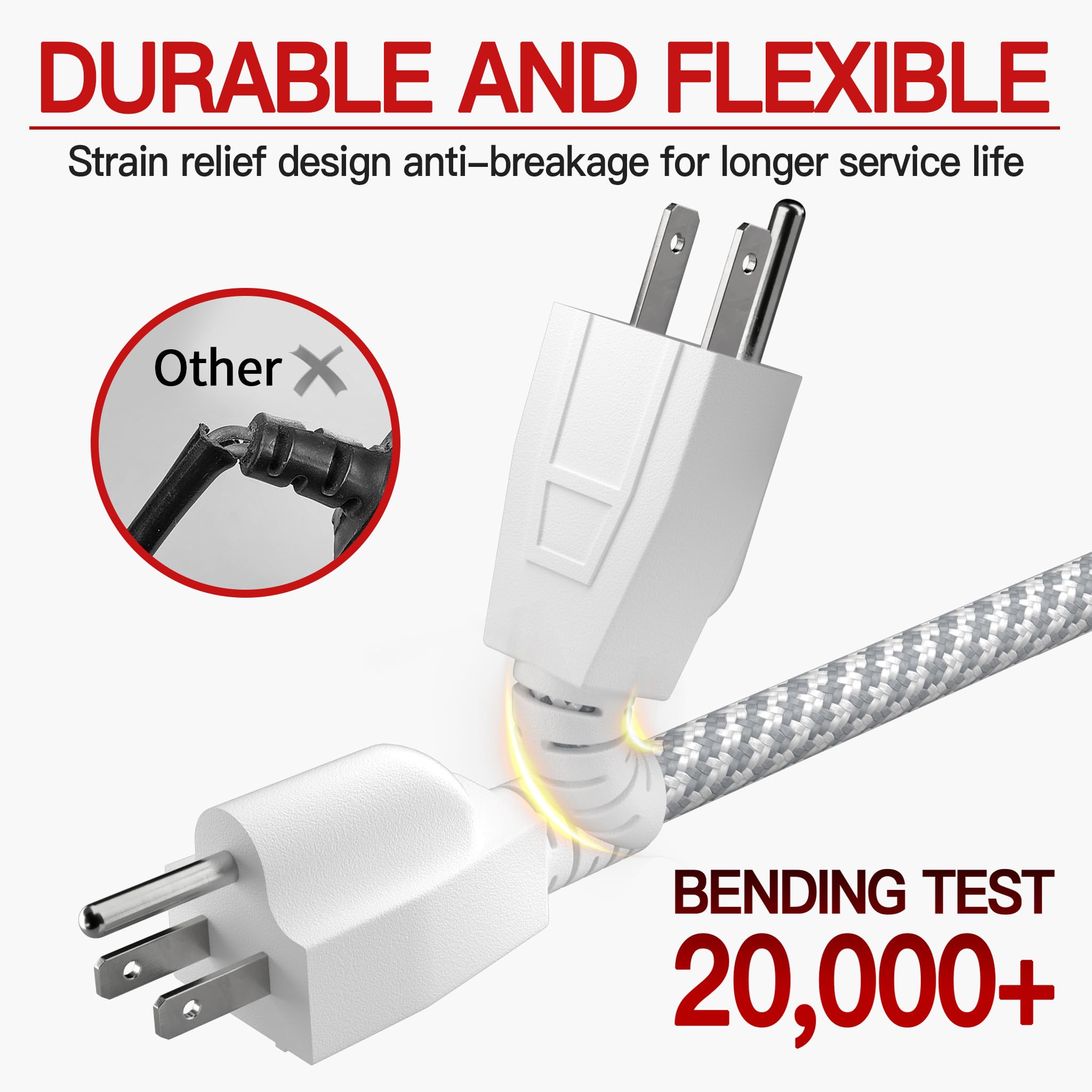 Flexible & Tangle Resistant: Braided 10ft extension cord Plug and socket are designed with long strain relief at the end; Braided extension cord 10ft pass 20,000 large-angle bends without breaking prolonging service life; Small extension cord provides flexible mobility for small appliances and sockets after use it can be easily stored to avoid clutter