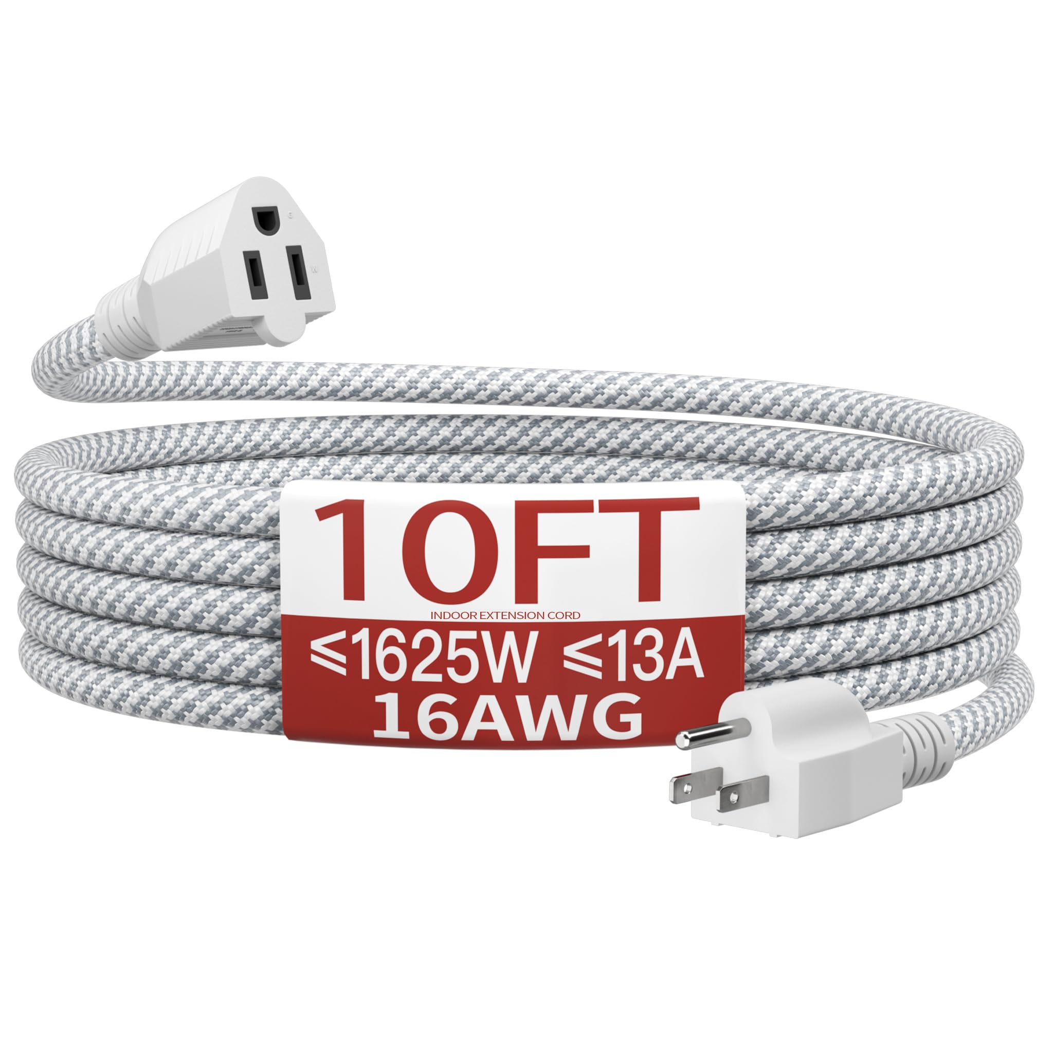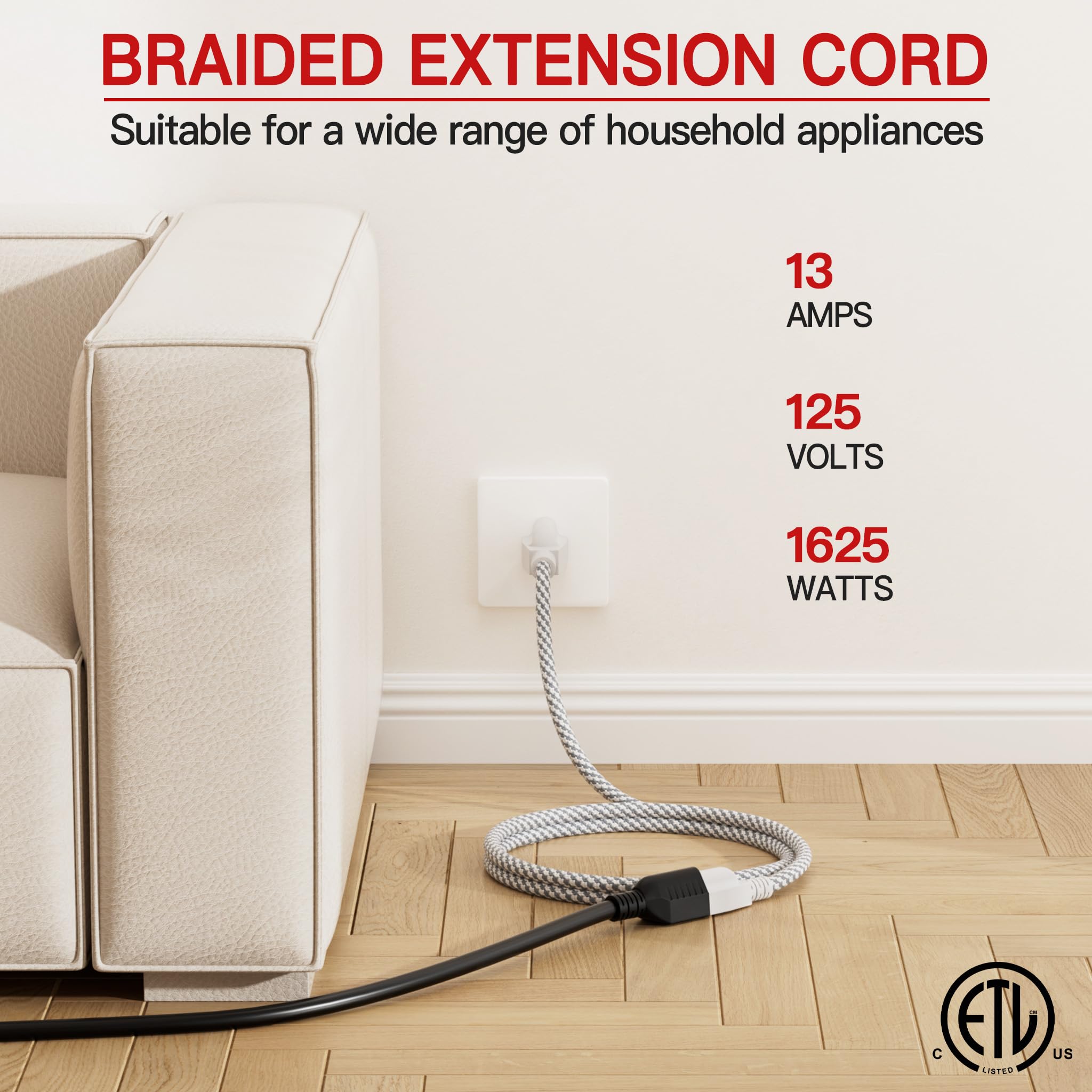 ETL Listed and Trusted: 10 ft braided extension cord rated 13 Amps, 1625 Watts and 125 VAC; Male NEMA 5-15P and female NEMA 5-15R; It is ETL/cETL Listed; Ensuring its compliance with strict safety standards; Each braided extension cord 10ft passes a 1500V high voltage test before leaving the factory to ensure safety