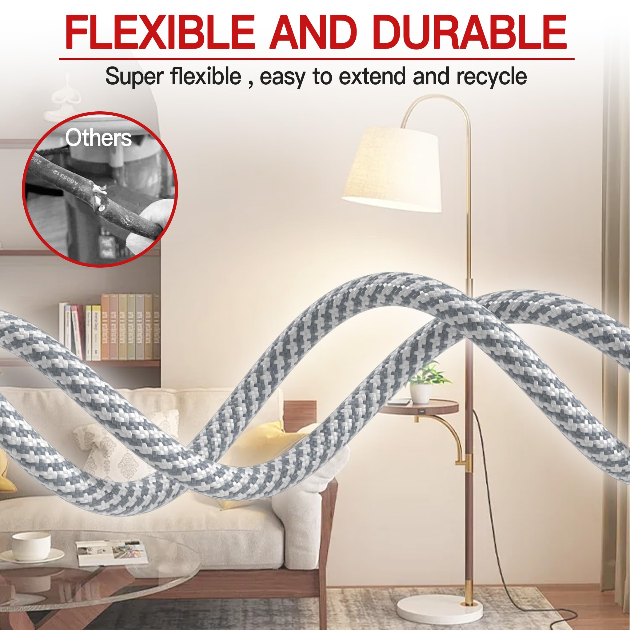 Versatile Indoor Use: Indoor extension cord 10ft are ideal for home offices, living rooms, bedrooms and studios; Braided extension cord safely power lamps, computers, printers and small appliances; Short extension cord 10 foot should be kept away from moisture, high temperatures, and direct sunlight