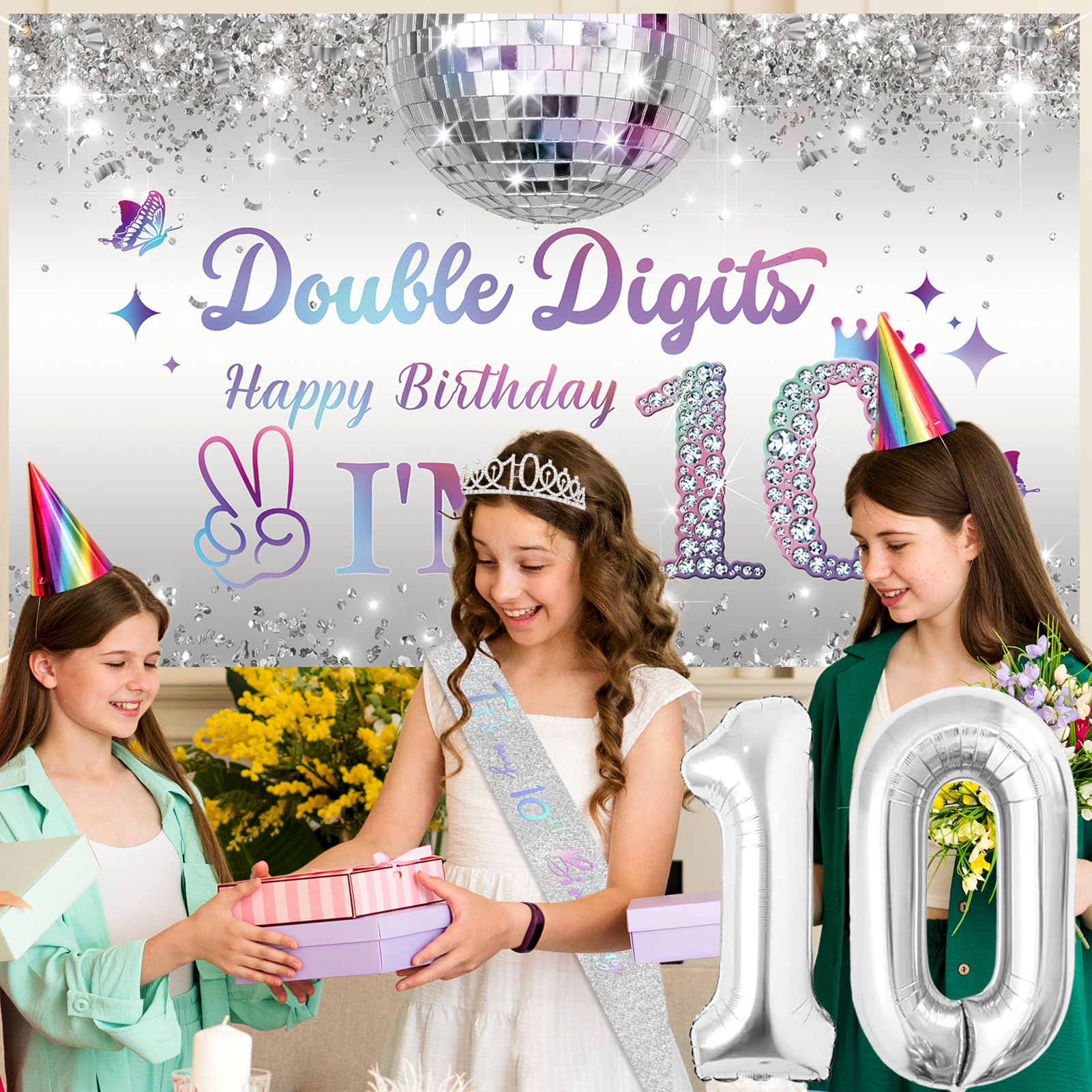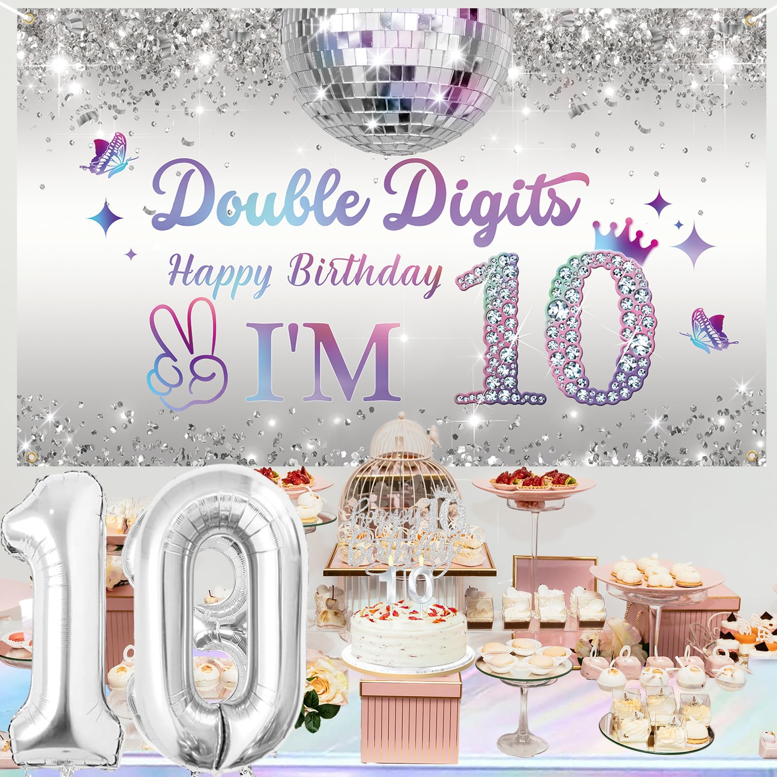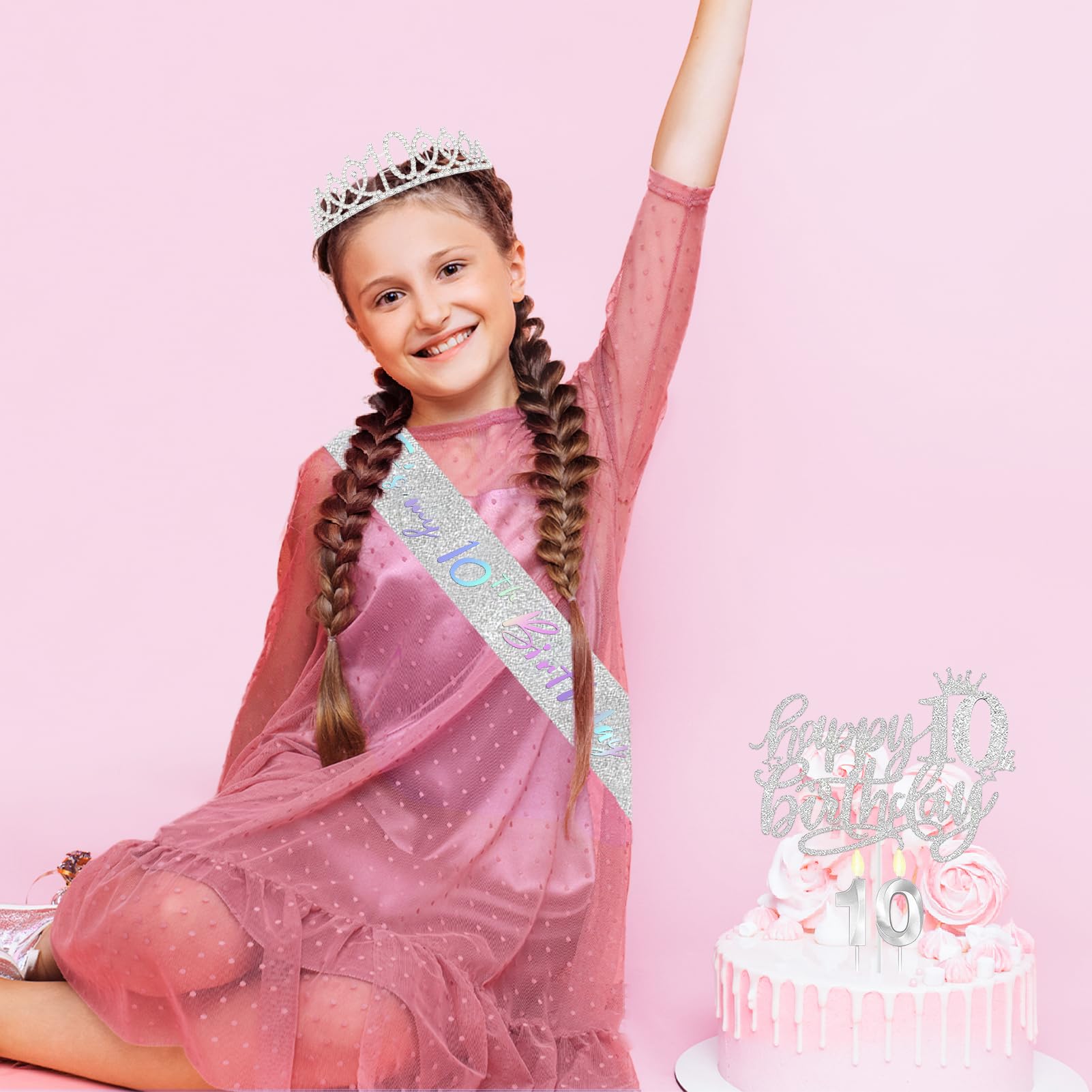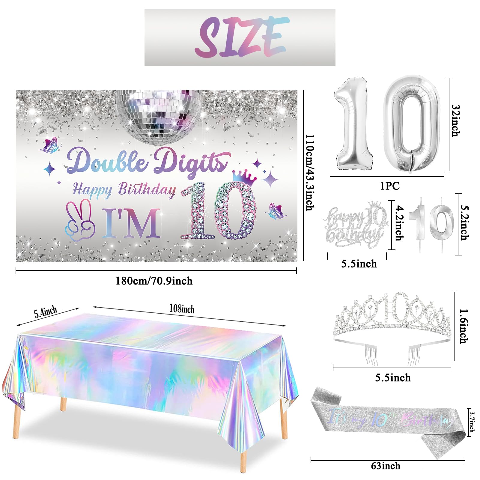 [10th Birthday] Package IncludedοΌ1pc 10th party banner, 1pc silver 10 birthday crown, 1pc sash and a pearl pin, 1pc happy 10th birthday cake topper, number 10 balloons 32inches, 1pc rose gold tablecloth. The 10th birthday decoration set will heighten the excitement of the girls 10th birthday party.