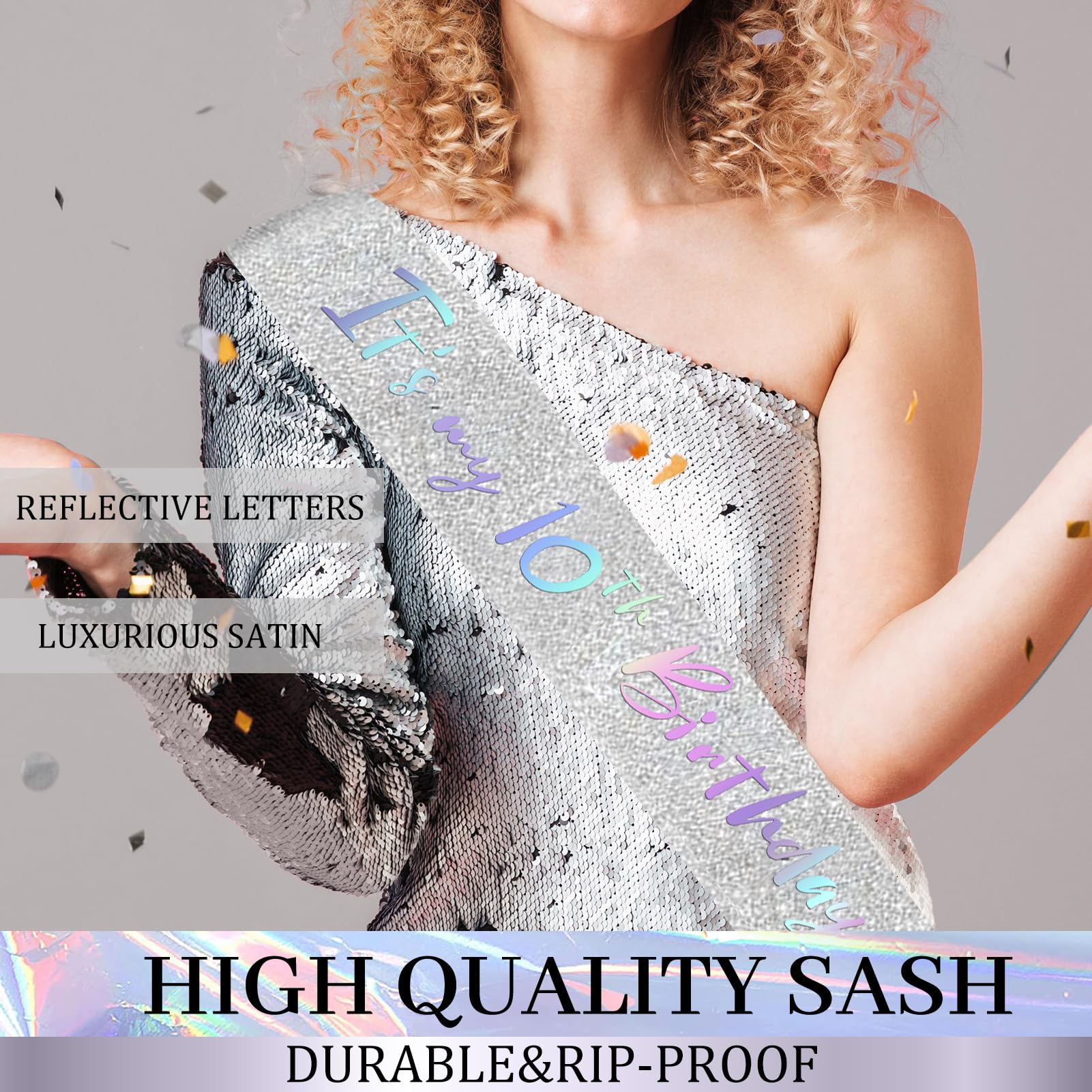 [10th Sash for girls] The silver birthday sash is made from high quality glitter fabric and printed with colorful foil words. Elegant and gorgeous! The sash is in 63inch length and comes with a pretty pearl pin. You can adjust the length by using the pearl pin in the package. Th pin also put the perfect finishing touch on your party outfit.