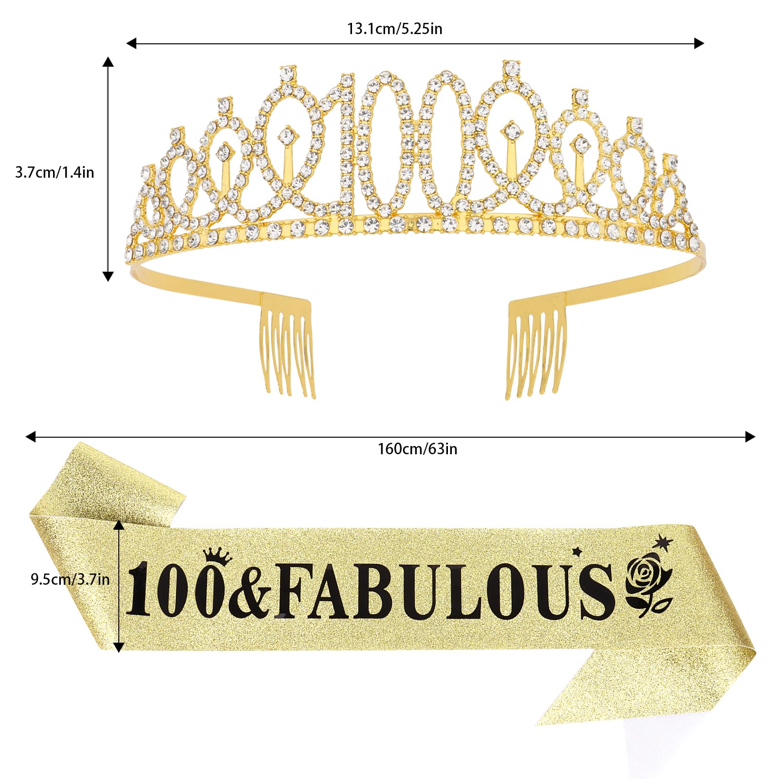 100 & Fabulous Birthday Sash: The tiara is made of glitter fabric and printed with black foil words reads "100 & Fabulous". The sash is 63 inches long (31.5 inches when folded in half) and 3.7 inches wide