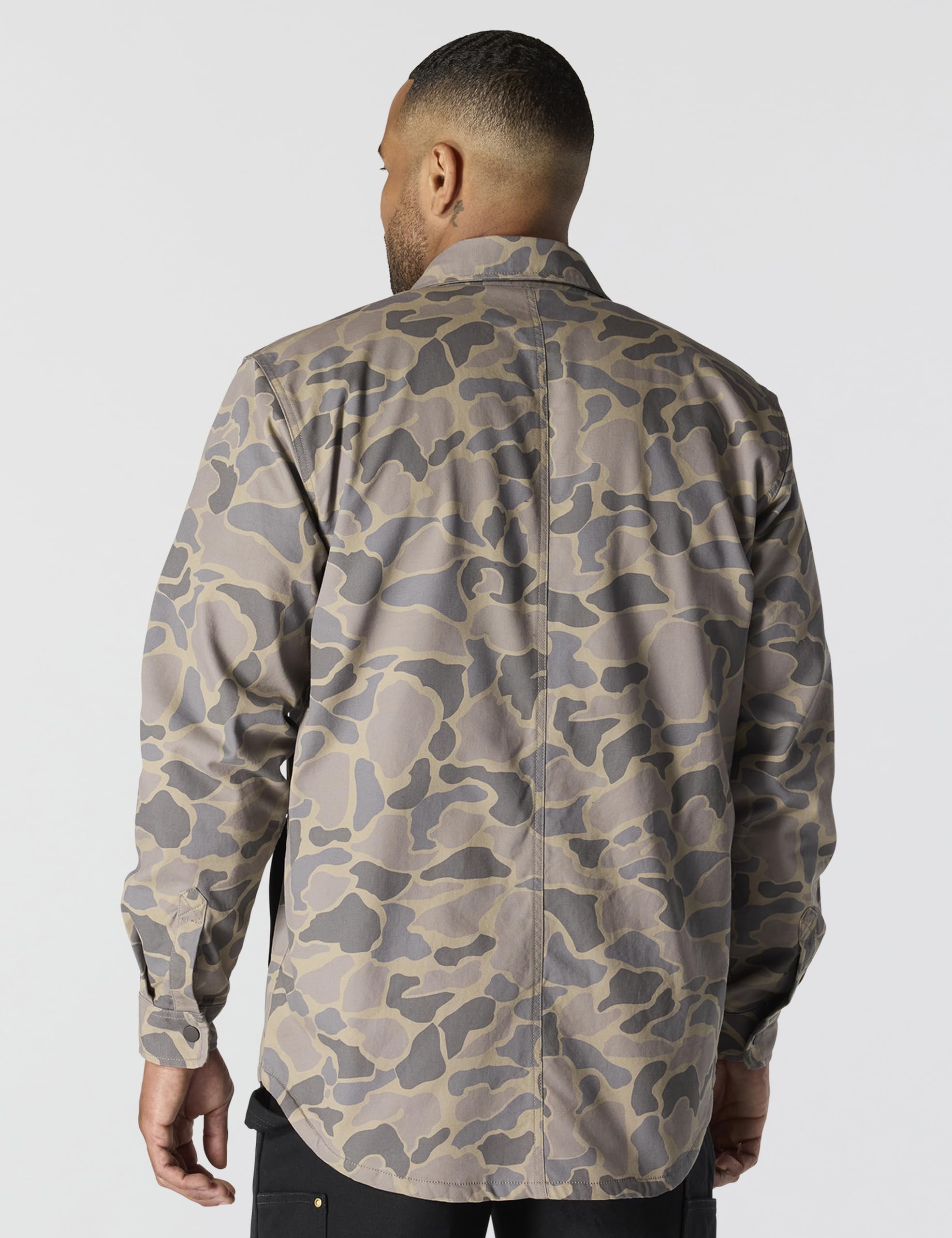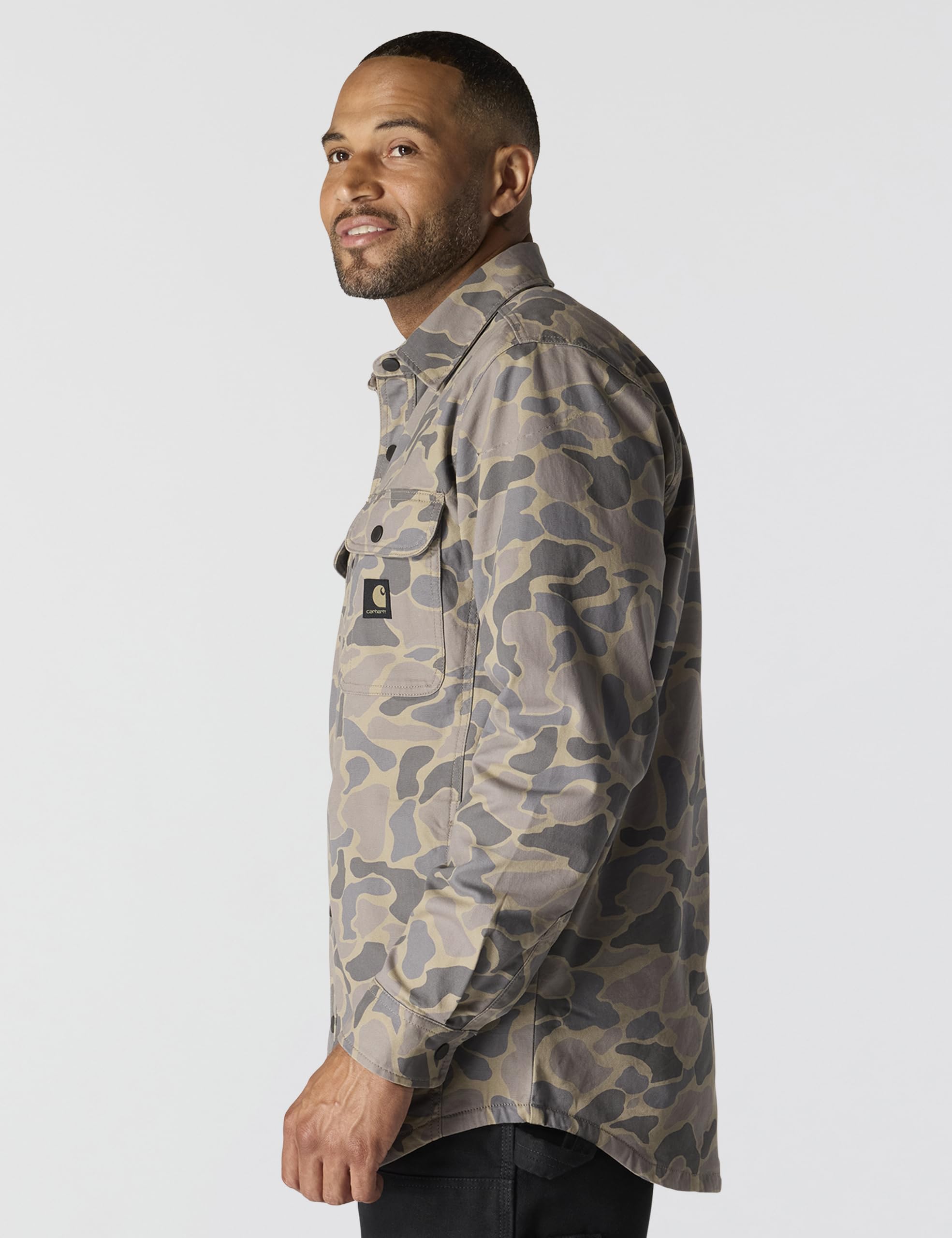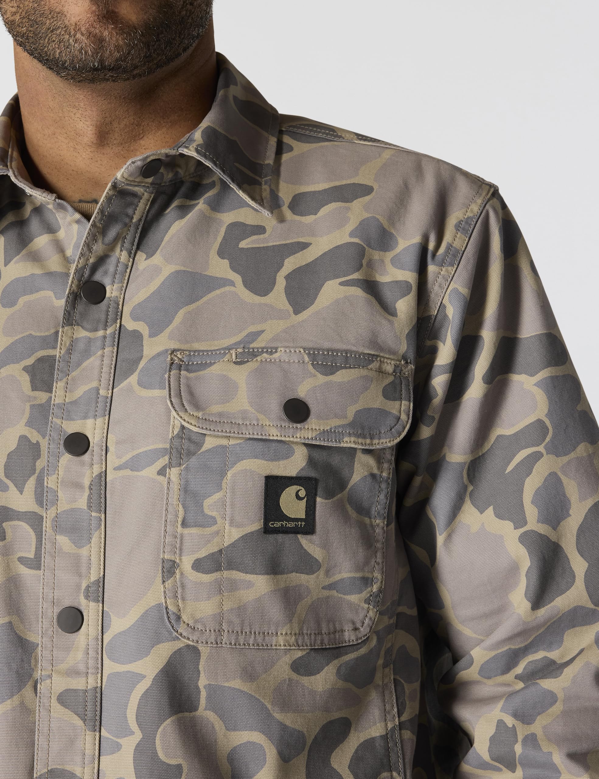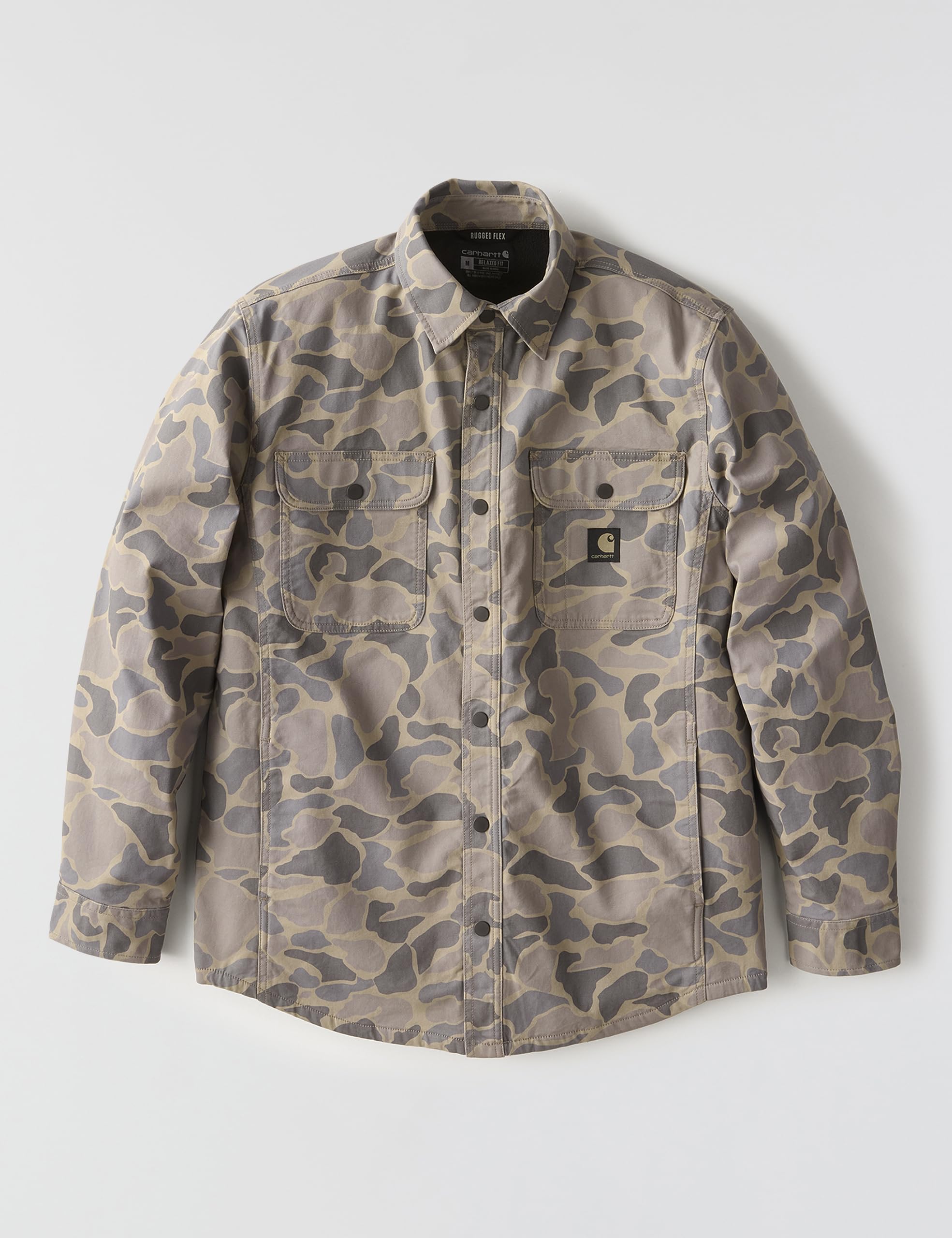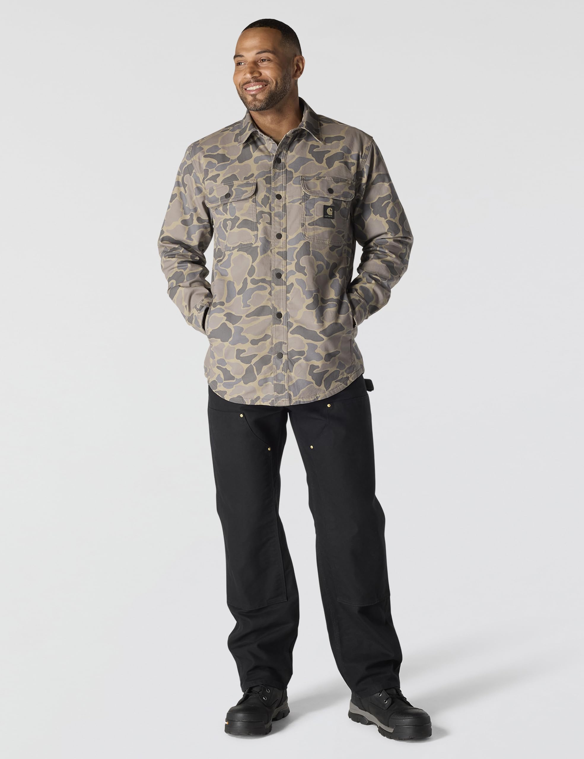 Description A workwear go-to, this men's Carhartt shirt jac is ready for cold days on the job. A fleece lining adds comfort and extra warmth. The roomy relaxed fit and durable stretch canvas give you the range of motion needed to stay working.