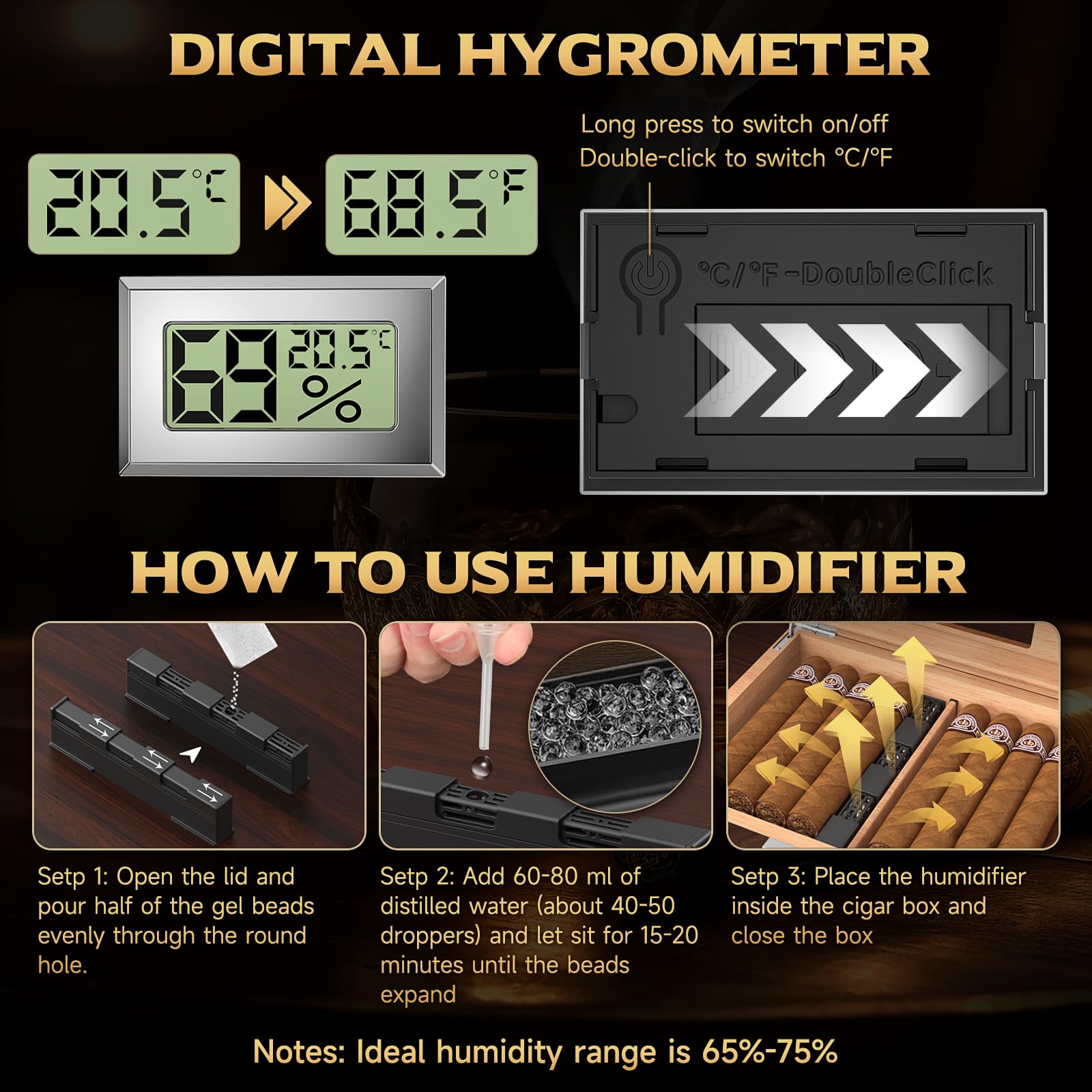 [Precise Humidity Control]: Equipped with a precise digital hygrometer, it ensures accurate and easy monitoring of humidity levels, creating the perfect environment for your cigars. The included gel humidifier can steadily release moisture from three directions to maintain humidity between 65% and 75%, ensuring that cigars remain fresh and delicious, preserving their rich aroma and taste for a long time