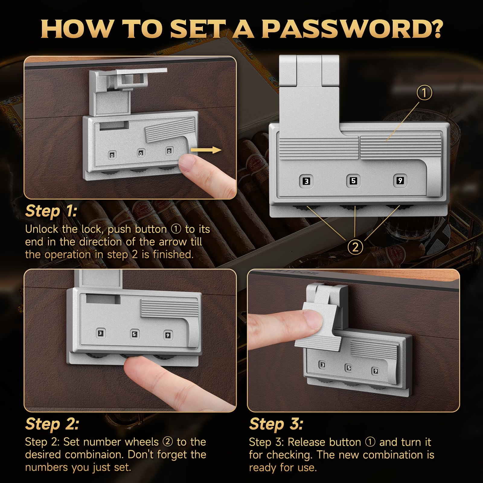 [Secure Combination Lock]: Designed with a user-friendly combination lock, the humidor offers a safe storage solution for your valuable cigars. The sturdy stainless steel hinges allow the cigar humidor to be opened and closed smoothly