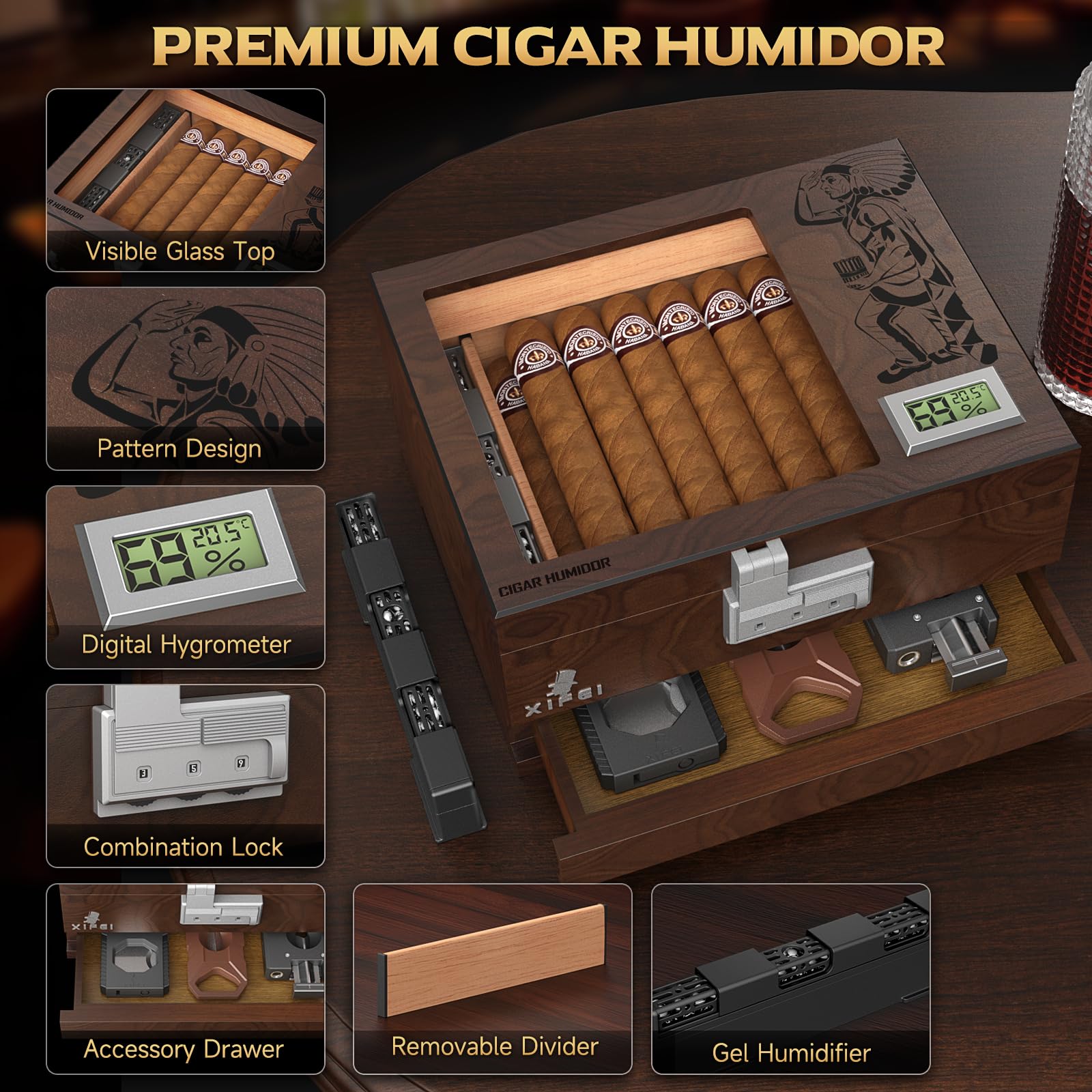 [Elegant Display and Unique Design]: XIFEI cigar humidors are made of natural cedar wood, which preserves the flavor and aroma of the cigars. The glass top allows you to display your cigar collection without opening the humidor, while the personalized pattern adds a touch of uniqueness to the humidor box