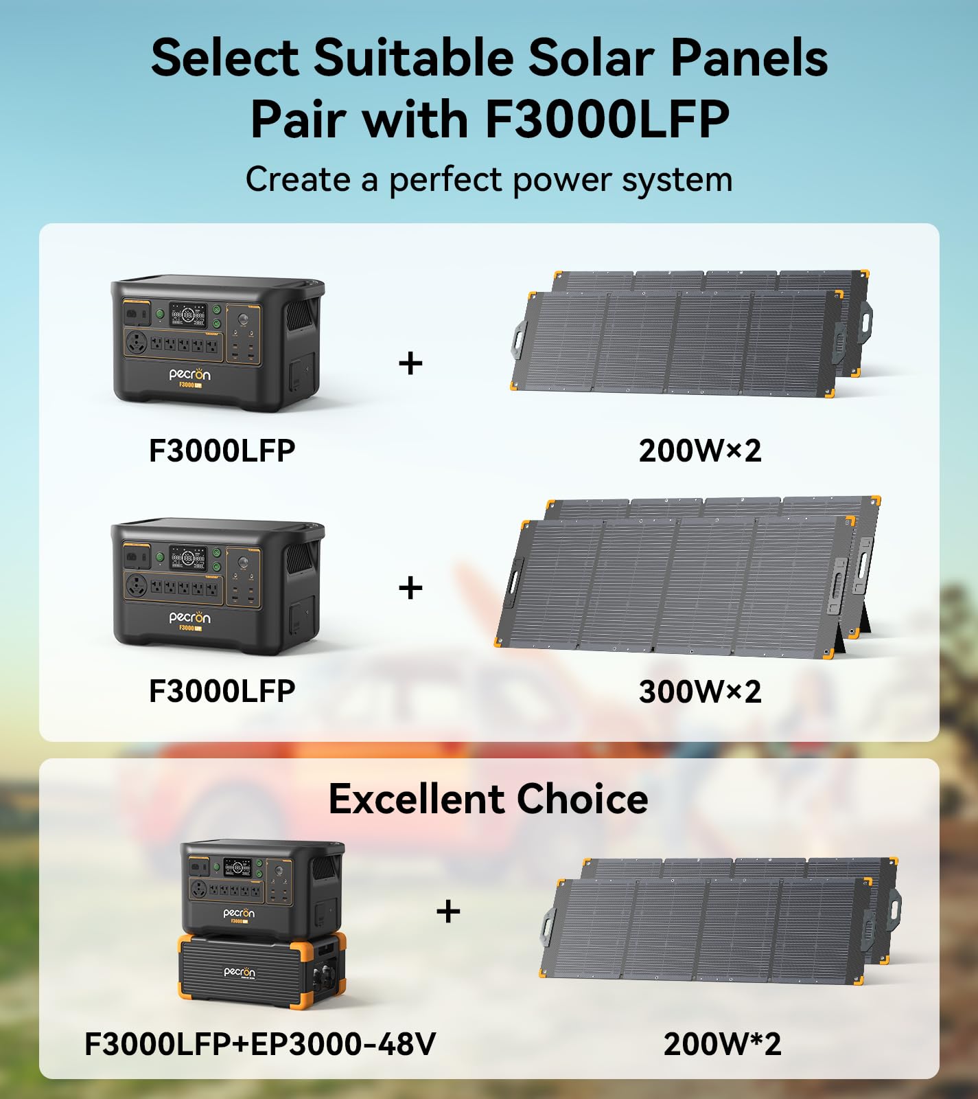 【1800W Fast Charging】 This Pecron portable power station can achieve fast AC charging in 2 hours(0 to 100%), which is 30% faster than similar solar power stations! Three charging methods----AC input: 1800W fast charging, eliminating the need to wait; Car charging(need 500W smart car charger): suitable for a trip; Solar charging: The F3000LFP solar generator can handle a solar input of 1600W. Combined with our 200-watt/300-watt solar panels, it can be recharged at any time during camping
