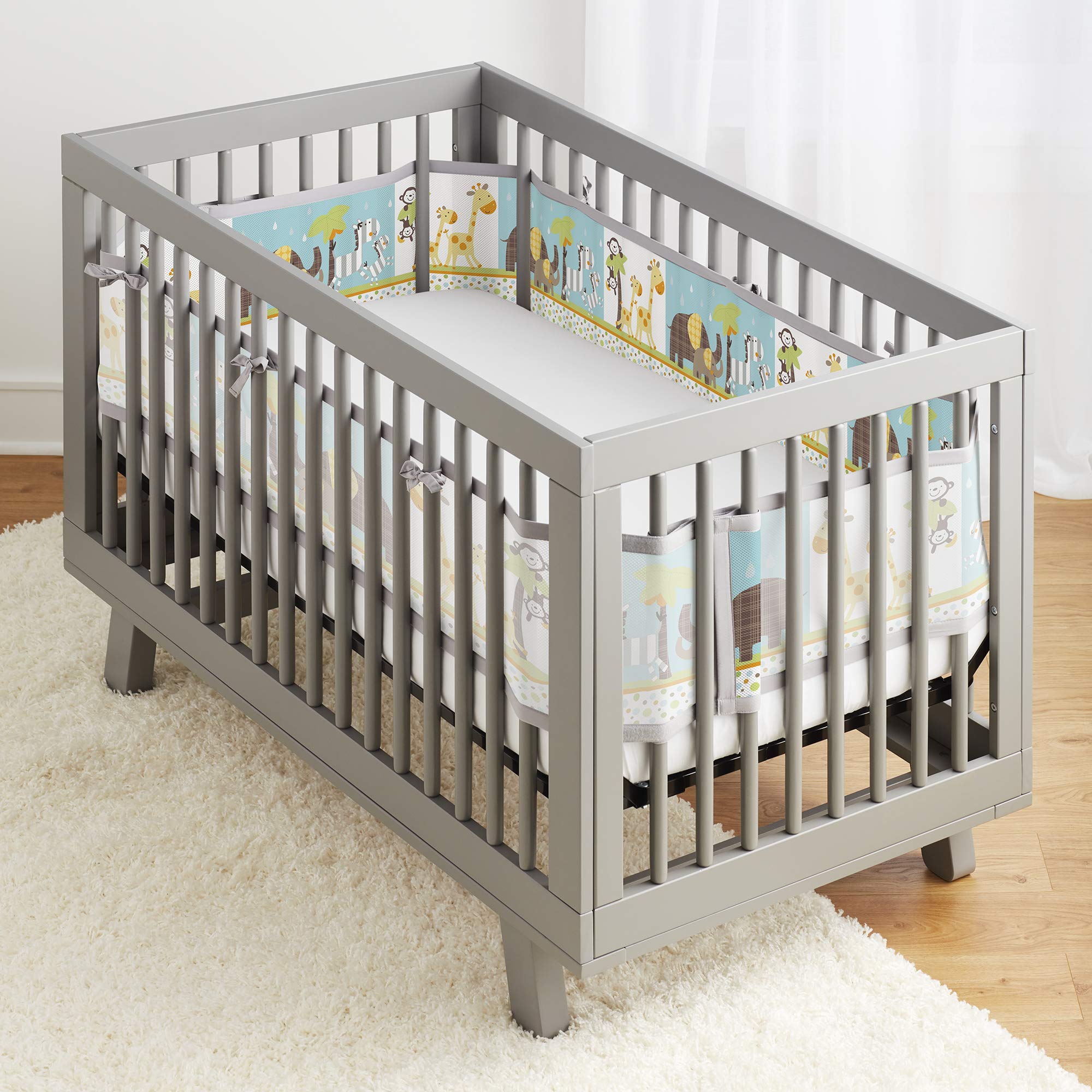 HELPS KEEP ARMS AND LEGS SAFELY INSIDE WITHOUT THE RISK OF RESTRICTED AIRFLOW: A single layer of breathable mesh allows exhaled air to pass through the fabric and mitigates risks associated with padded "crib bumpers" (banned in the US in 2022).