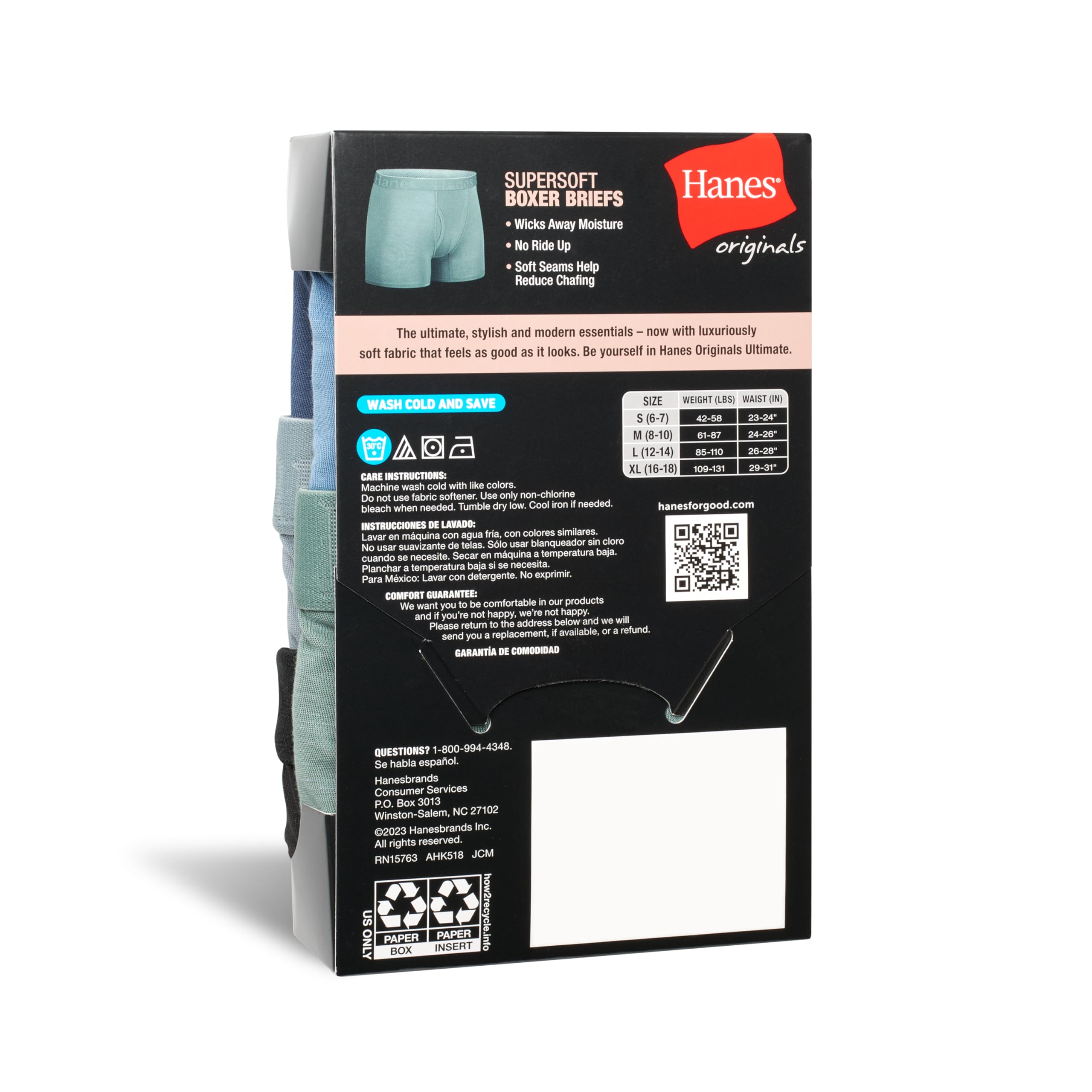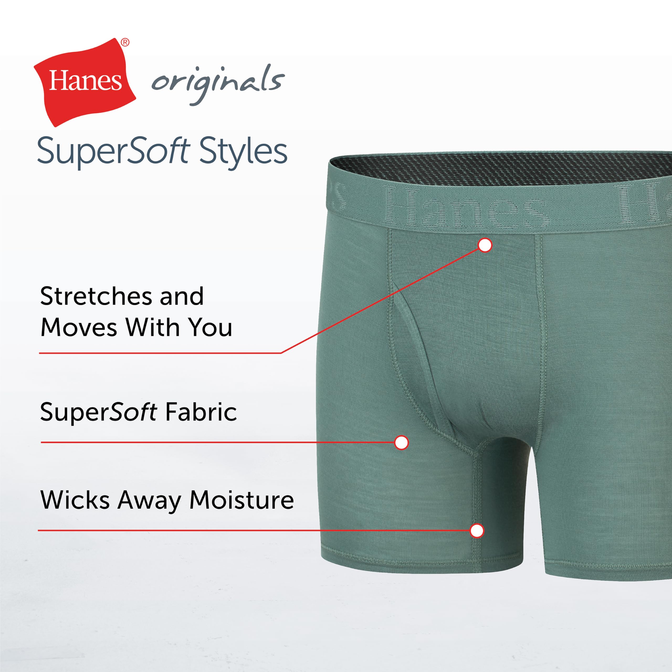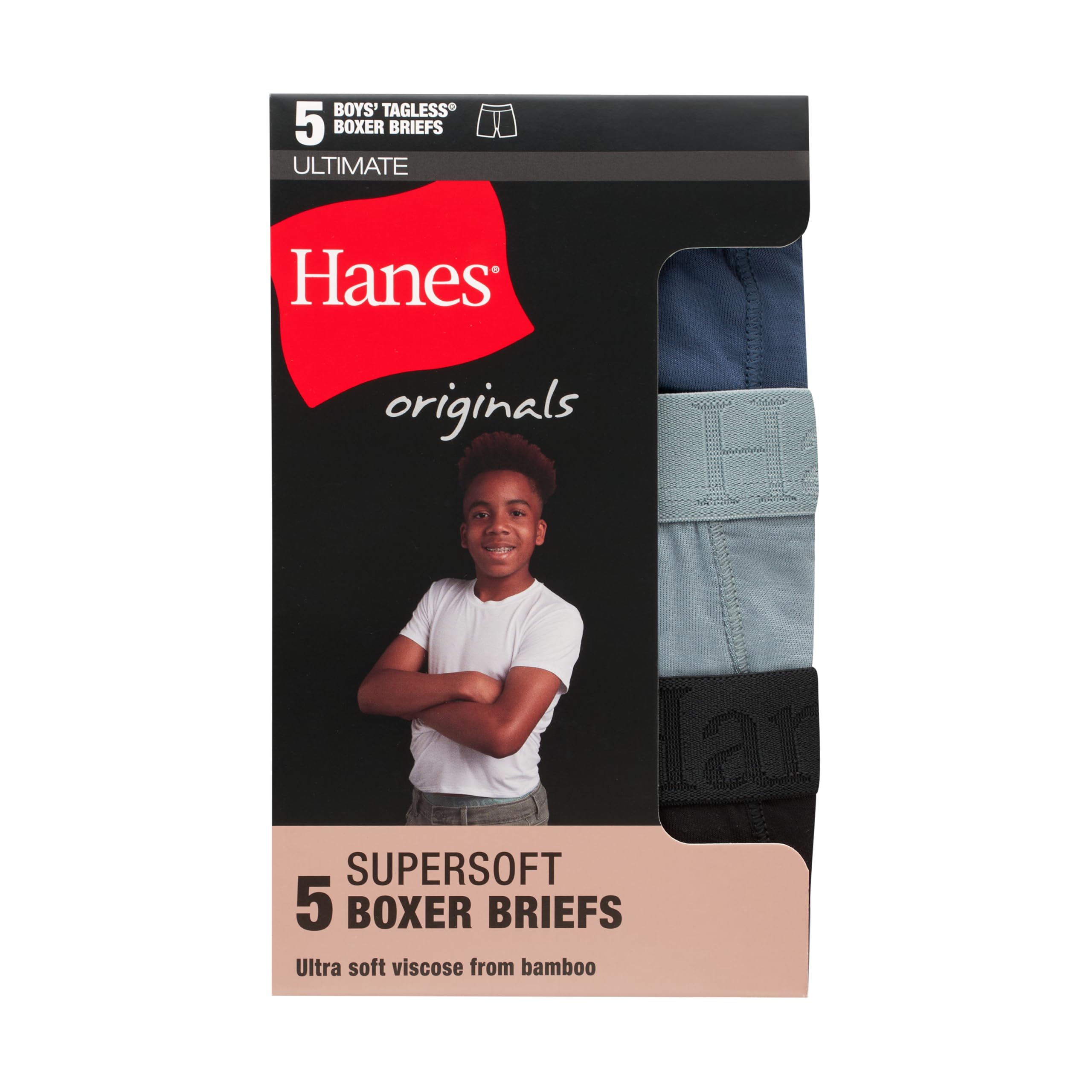 Description He'll love the incredible softness of these Hanesยฎ Originals Ultimate Boys' SuperSoft Boxer Briefs, while you'll appreciate the exceptional quality. This boys' underwear is designed with cozy, breathable viscose from bamboo fabric - delivering a fit and feel heโll totally love. The comfy boxer briefs offer soft seams to help reduce chafing and 4-way stretch fabrication for better movement. Lightweight, moisture-wicking fabric keeps him cool, while no-ride-up leg bands allow him to take on the day without worrying about his underwear moving and shifting. Complete with a tag-free interior, you can grab these boys' boxer briefs in an all-black 5-pack with assorted waistbands so he can choose his own style. Hanes Originals. Soft just got an upgrade.