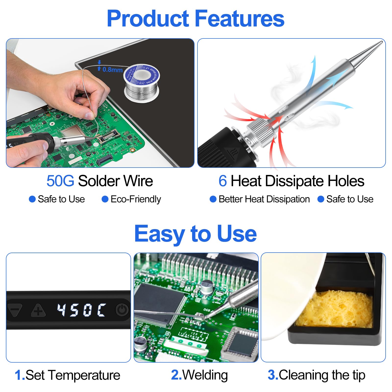 Smart Dual-Chip Technology for Safety & Consistency: Our professional 120W soldering iron is built in Industrial-grade MCU chip and Gravity sensor chip. MCU precisely controls the constant temperature and our soldering iron is perfect for who wants professional quality for heavy-duty applications that require fast heat.