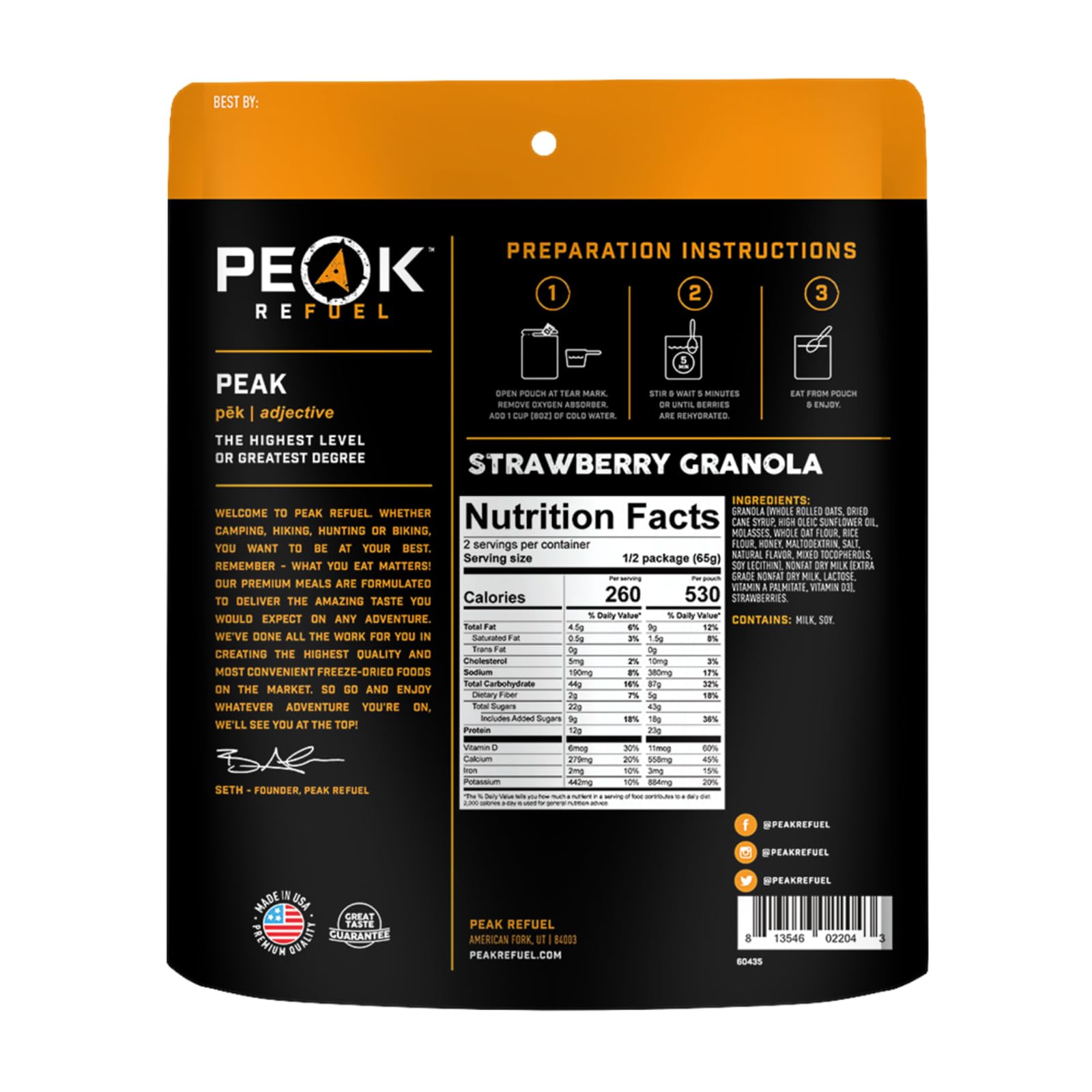 MADE IN THE USA – All Peak Refuel meals are freeze-dried and packaged in the USA. If you are not satisfied with your purchase or have any other questions, contact us directly and we will make it right!