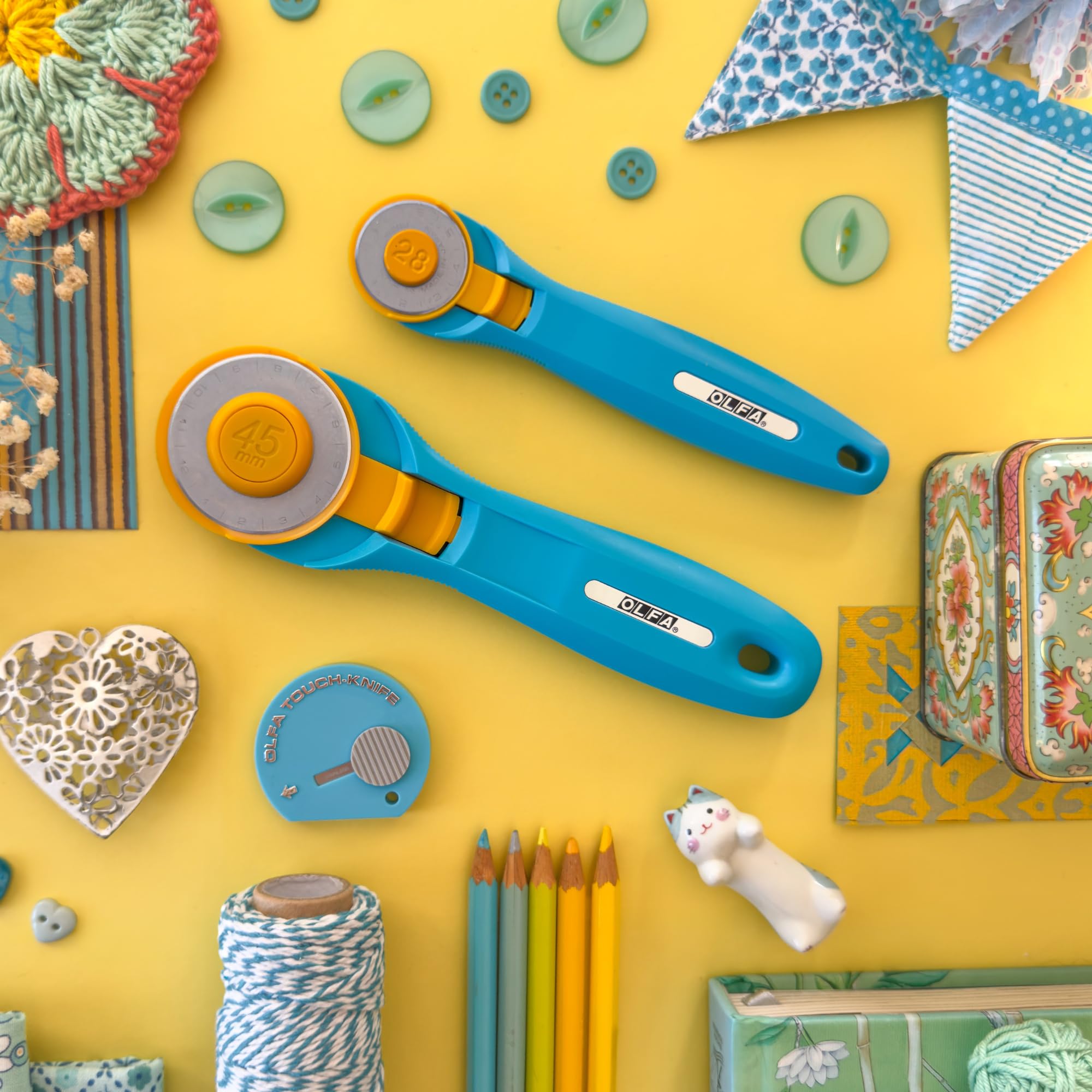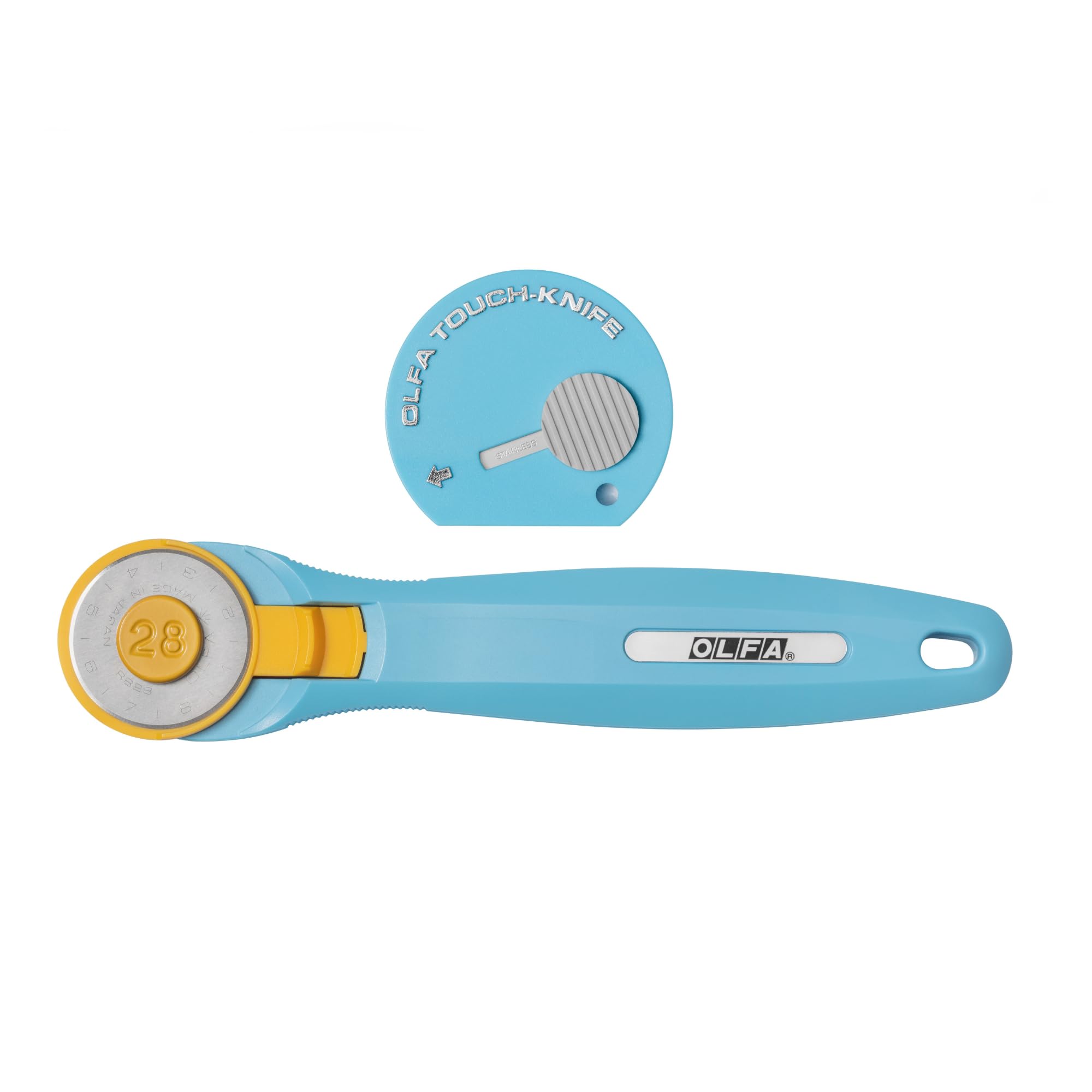 About the OLFA 28mm Quick-Change Rotary Cutter (RTY-1/C): The OLFA 28mm Quick-Change Rotary Cutter is the answer for intricate cuts and detailed shapes. This rotary cutter comes pre-loaded with an RB28 Tungsten Steel Rotary Blade manufactured from high-quality tungsten tool steel. It easily cuts through multiple layers of fabric and paper. The built-in blade cover enhances user safety. Compatible with OLFA's 28mm Replacement Blades (RB28-2). Our rotary cutter will manage sharp curves with precision for small additions to your quilt or scrapbook pages. Matching Art Knife and Touch Knife included.