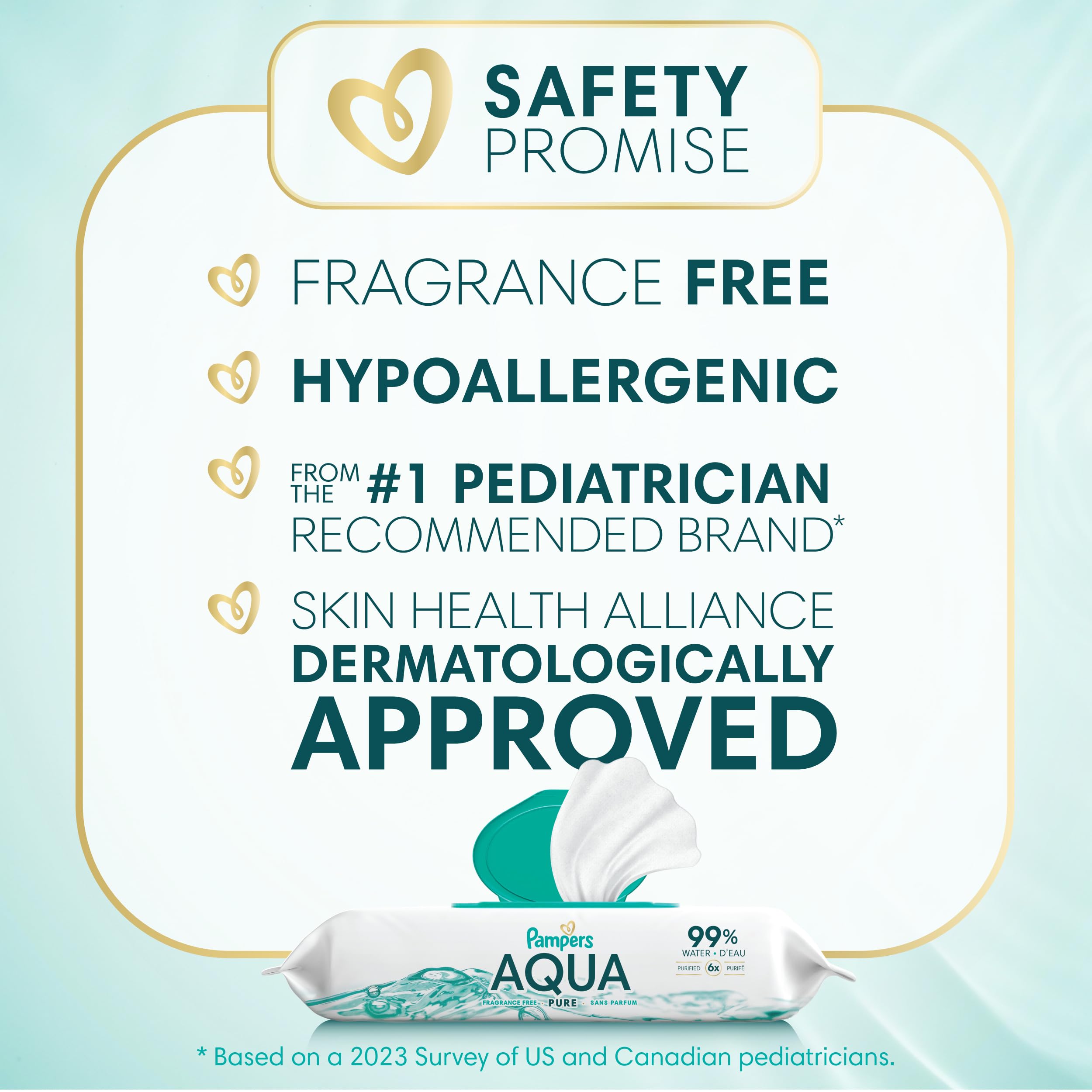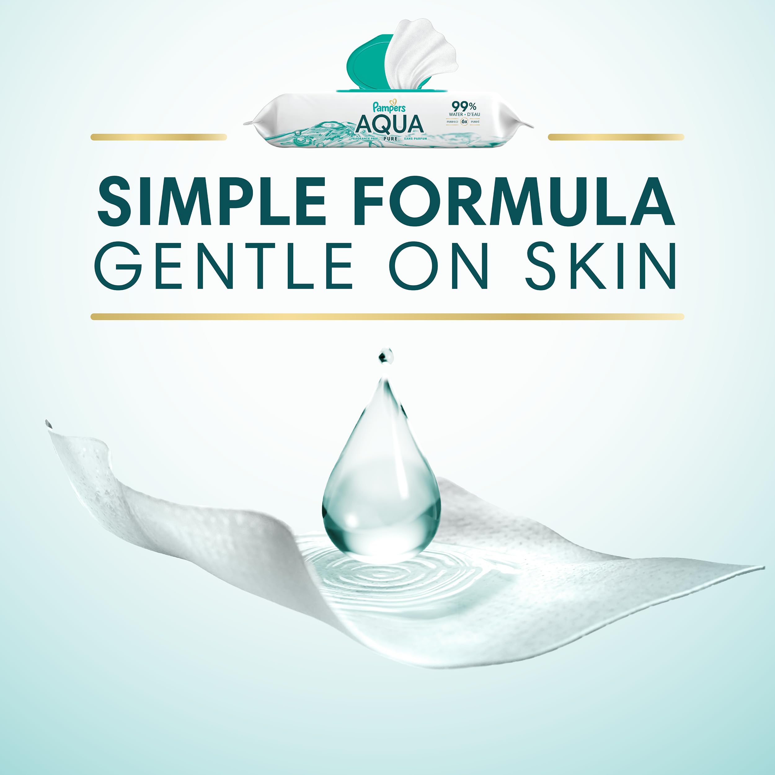 Pampers Aqua Pure baby wipes are made with 99% purified water and 1% dermatologically-tested, gentle ingredients. Aqua Pure 99% water wipes are hypoallergenic and made without alcohol*, suflates, parabens, dyes, phthalates, fragrance (*no ethanol) for a soft and gentle clean. Pampers Aqua Pure 99% water based wipes are clinically proven mild, meaning they are safe for newborn babies’ skin and are gentle enough for babies' bottoms, hands, and delicate faces. Aqua Pure 99% water based wipes are also endorsed by the leading pediatric dermatologists as being as mild on skin as a water and washcloth. They are dermatologist approved by the Skin Health Alliance. Aqua Pure 99% water based wipes help support healthy baby skin because they contain pH balancing ingredients to help protect baby's delicate skin. Pampers Aqua Pure 99% water based wipes are proven to help restore skin’s healthy pH better than the leading super-premium baby wipe brand. Plus, each pack includes our convenient 1-Wipe POP-TOP, which keeps our wipes from drying out and is designed to dispense one wipe at a time. Aqua Pure 99% water based wipes are from Pampers, the #1 pediatrician recommended brand. For purely healthy skin, use Pampers Aqua Pure 99% water based wipes together with Pampers Swaddlers diapers. *no ethanol