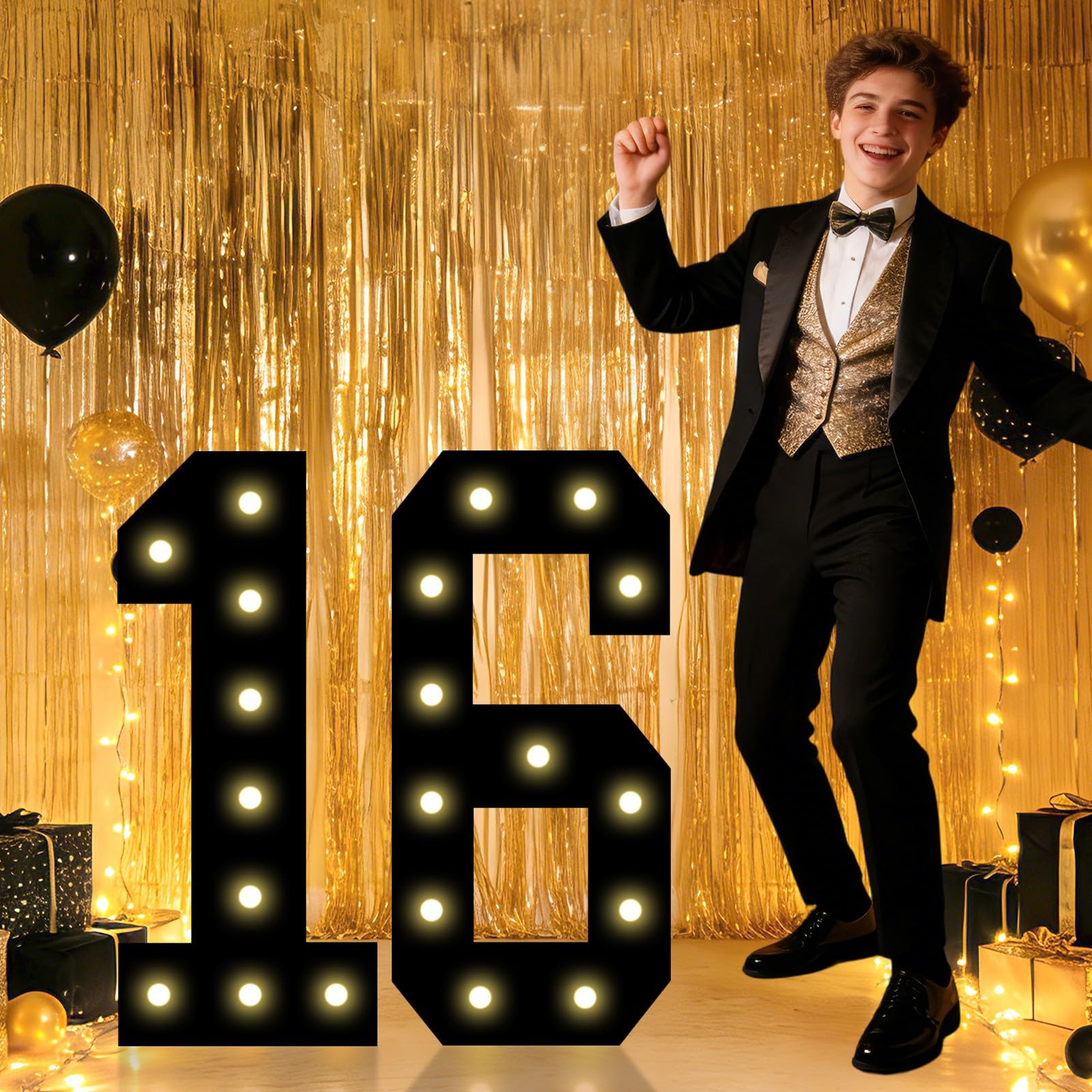 Giant Black 2.4 Feet Marquee Numbers with LED Lights: Mosaic numbers designed with warm white LED string lights. Giant LED numbers can be powered by 3 AA batteries (Not Included), convenient for all kinds of party decoration