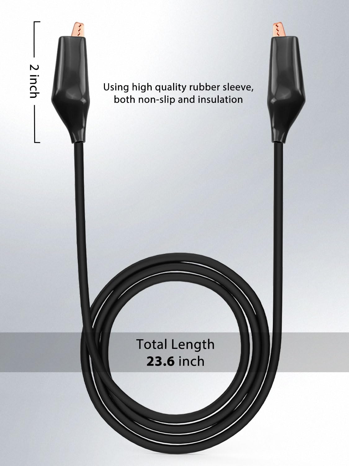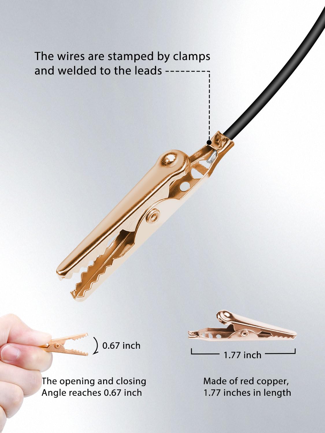 Length: The total length of the test lead and clips is 23.5 in.(60cm).The clips soldered and stamping to the wires. More robust and durable.