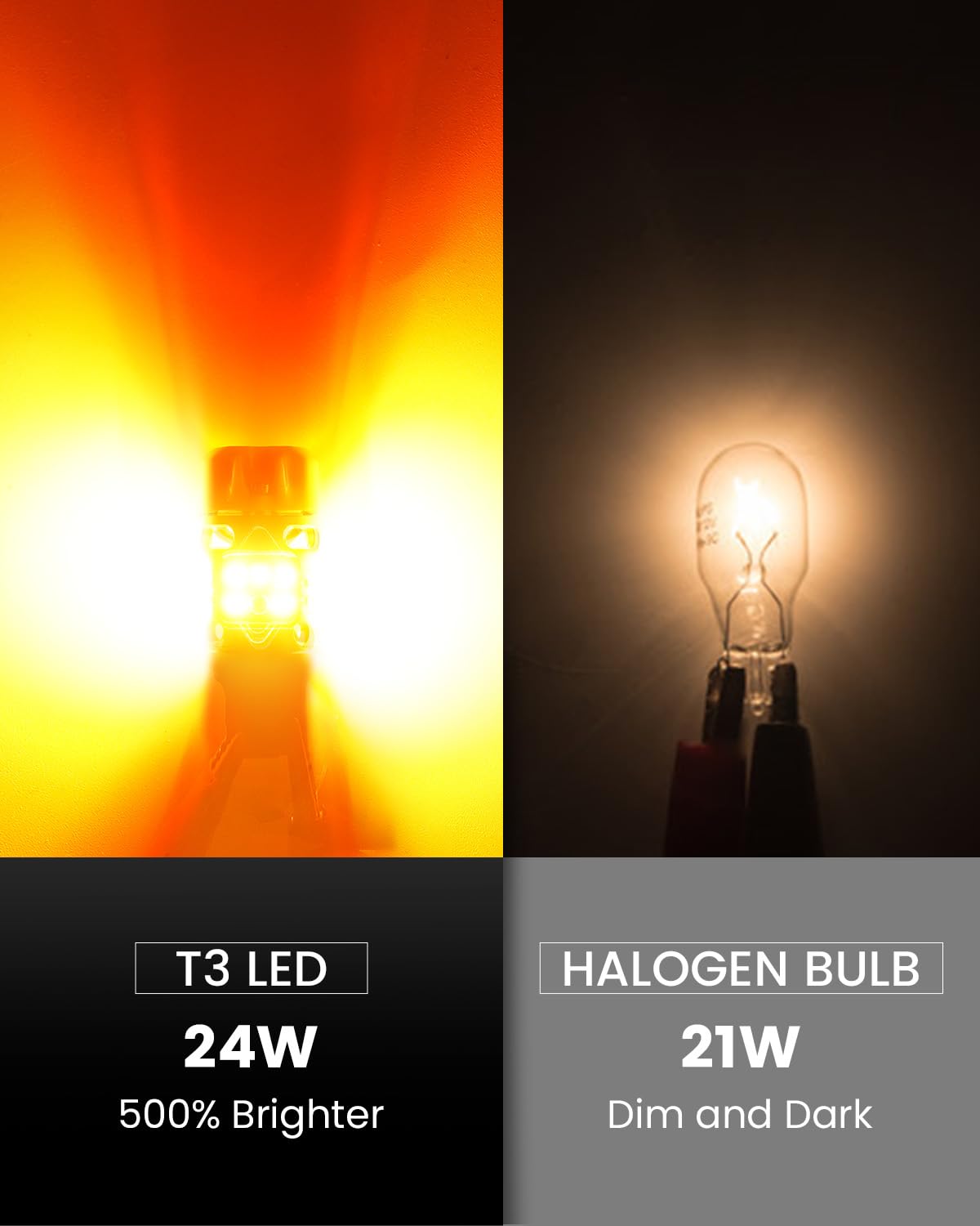 🔆【500% Super Bright & High Visibility】: LASFIT T3 7440 7443 LED turn signal amber bulb will upgrade your vehicle’s turn signals with 500% brighter compared to stock halogen. Featuring 20 premium 3030 LED chips, these bulbs deliver 4000LM and 48W output for ultra-vibrant, 360° full lighting—ensuring maximum visibility and safety.