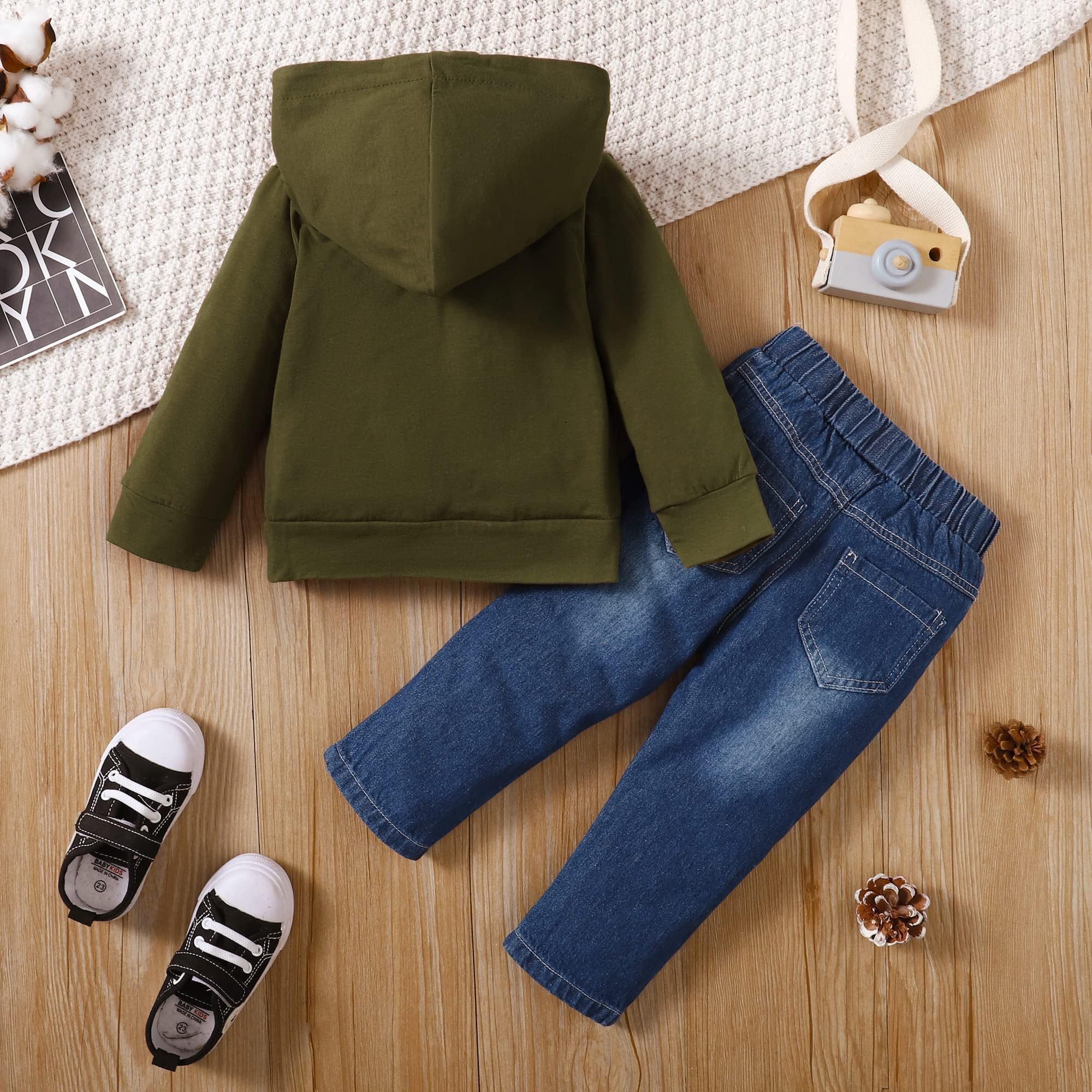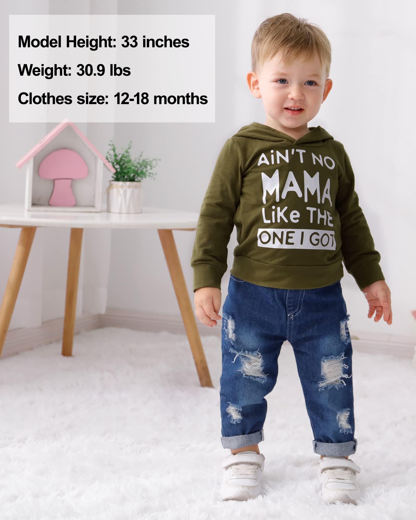 Stylish toddler fall outfits: Pullover design, letter pattern printed long sleeve hoodie top, and ripped jeans pants. Build your little guy a trendy look now!