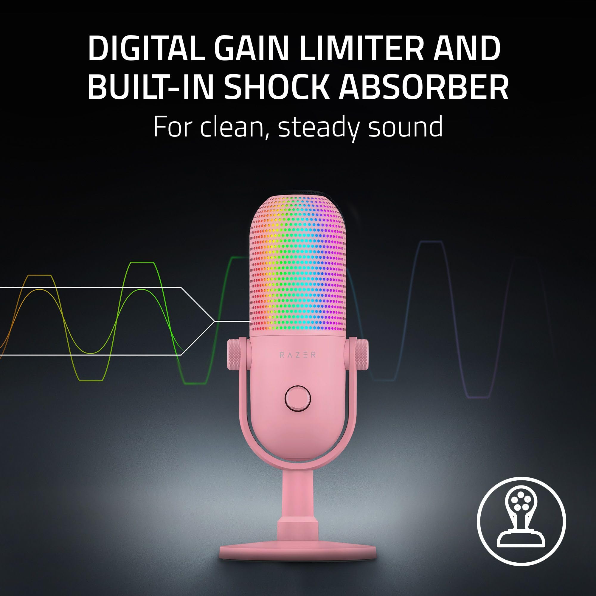 Bring your voice to life with the Razer Seiren V3 Chroma—an RGB USB microphone designed for vibrant streaming and pro-level control. Equipped with stream-reactive lighting powered by Razer Chroma RGB, it enhances your setup with dynamic effects that respond to in-game events, alerts, and emotes. The intuitive tap-to-mute sensor provides instant control, letting you prevent audio mishaps on the fly. Capture crystal-clear sound with the supercardioid condenser mic, designed to reduce background noise while emphasizing your voice. Featuring a digital gain limiter and built-in shock absorber, this mic maintains a steady, clean audio output even during intense moments. With a simple plug-and-play USB design, the Seiren V3 Chroma is ready to go in seconds—ideal for use with Discord, OBS Studio, and XSplit. Tailor your experience further with Razer Synapse for lighting customization, sound adjustments, and stream mix management.