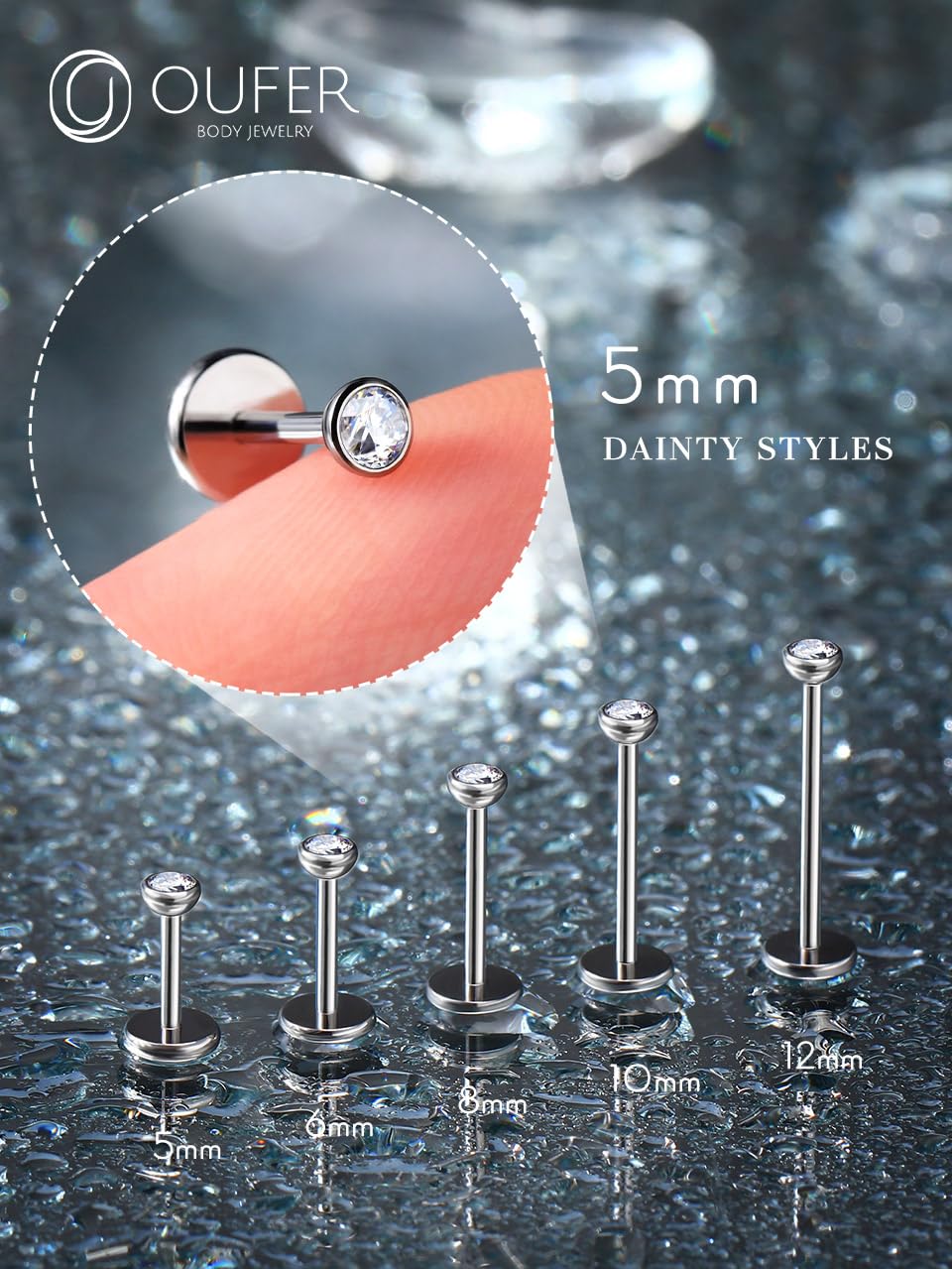 【Standard Flat Back Studs Size】: Gauge = 20g(0.8mm), bar length = 5mm(13/64''), diameter of CZ = 2.5mm. The flat back studs are normal and standard size for helix cartilage labret piercing jewelry.