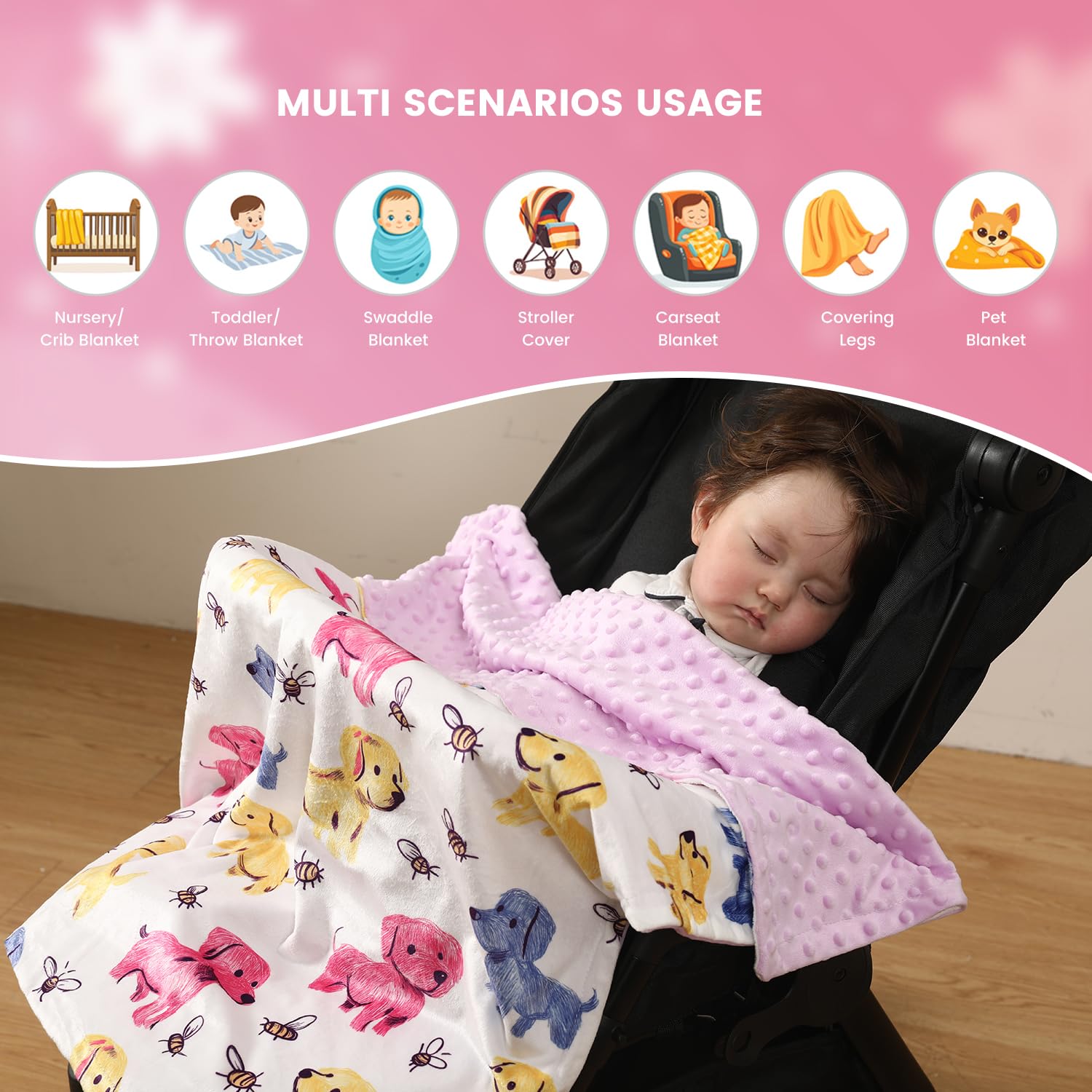 MULTI SCENARIOS USAGE: For babies it can be used as a crib blanket, swaddle blanket, play blanket, carseat blanket or stroller cover. For adults it can be used for covering legs in office or traveling. It also can be used as a pet blanket.