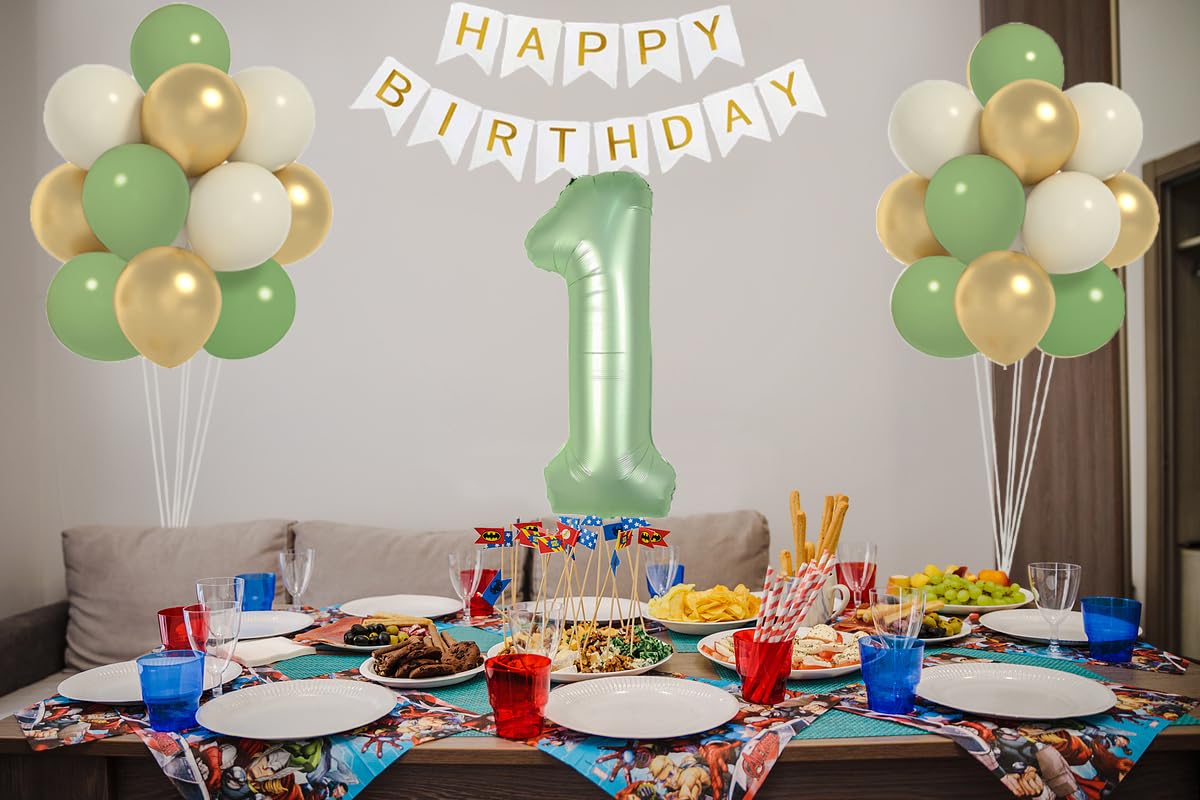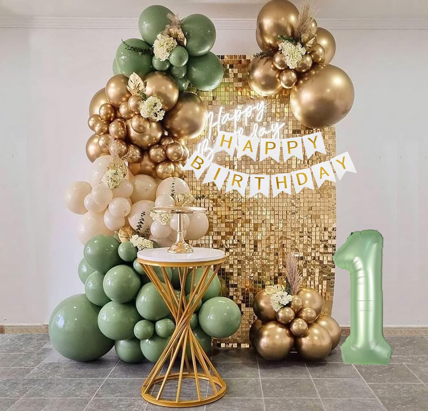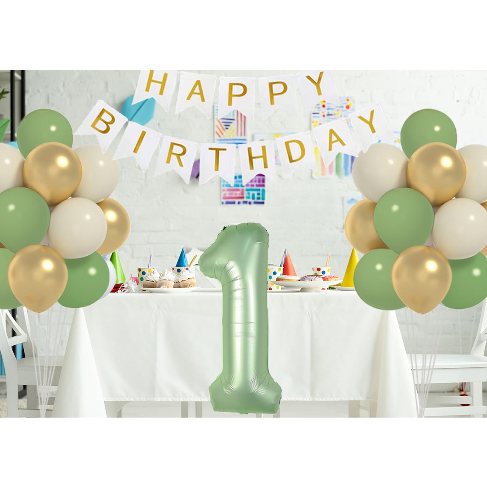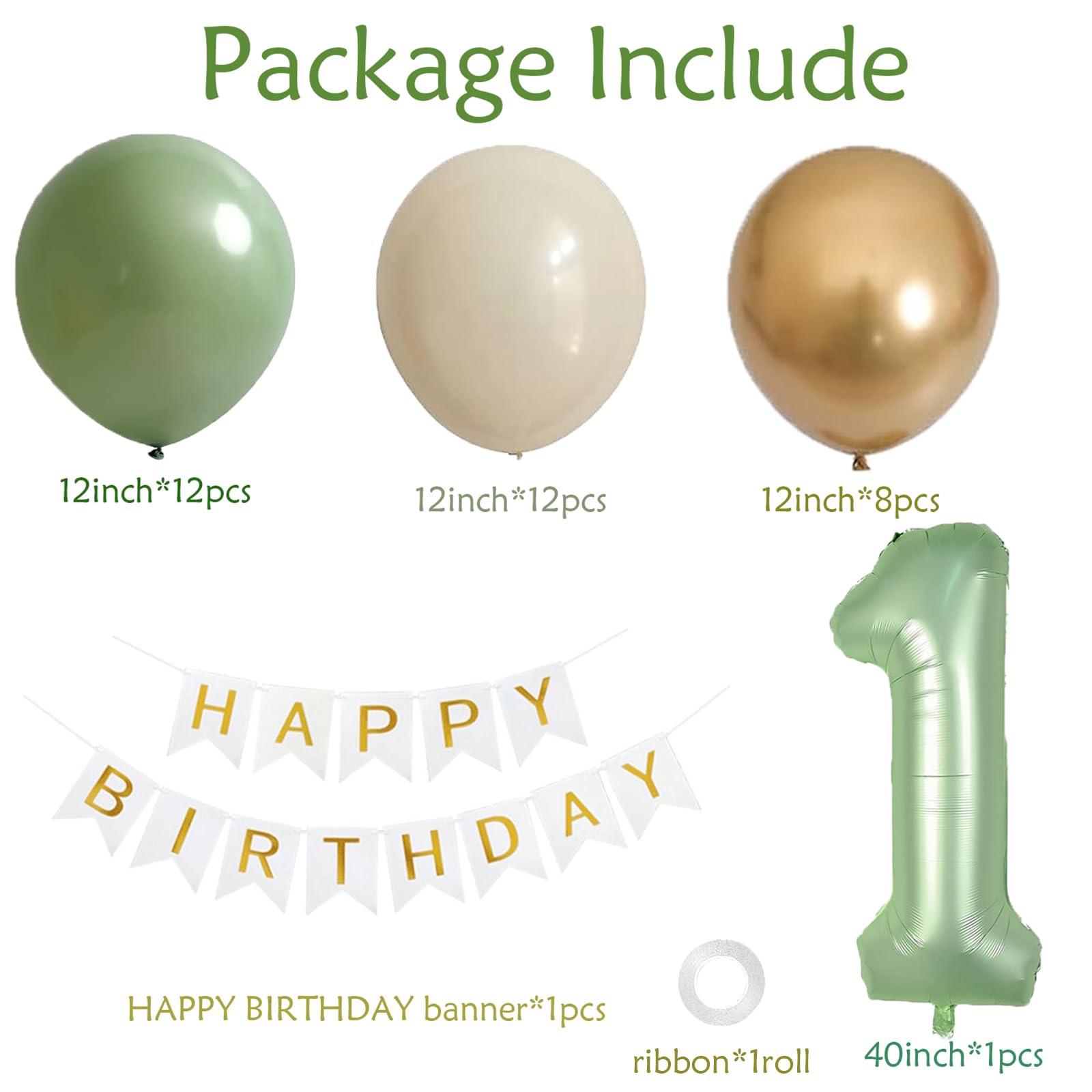 【VALUABLE PACK】32pcs One Balloon for First Birthday Kit include: 40inch sage green 1 foil balloon,gold white HAPPY BIRTHDAY banner,12pcs 12inch sand white balloons, 12pcs 12inch sage green balloons, 8pcs 12inch gold balloons.