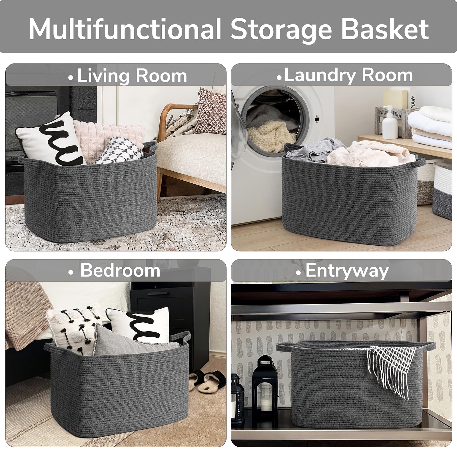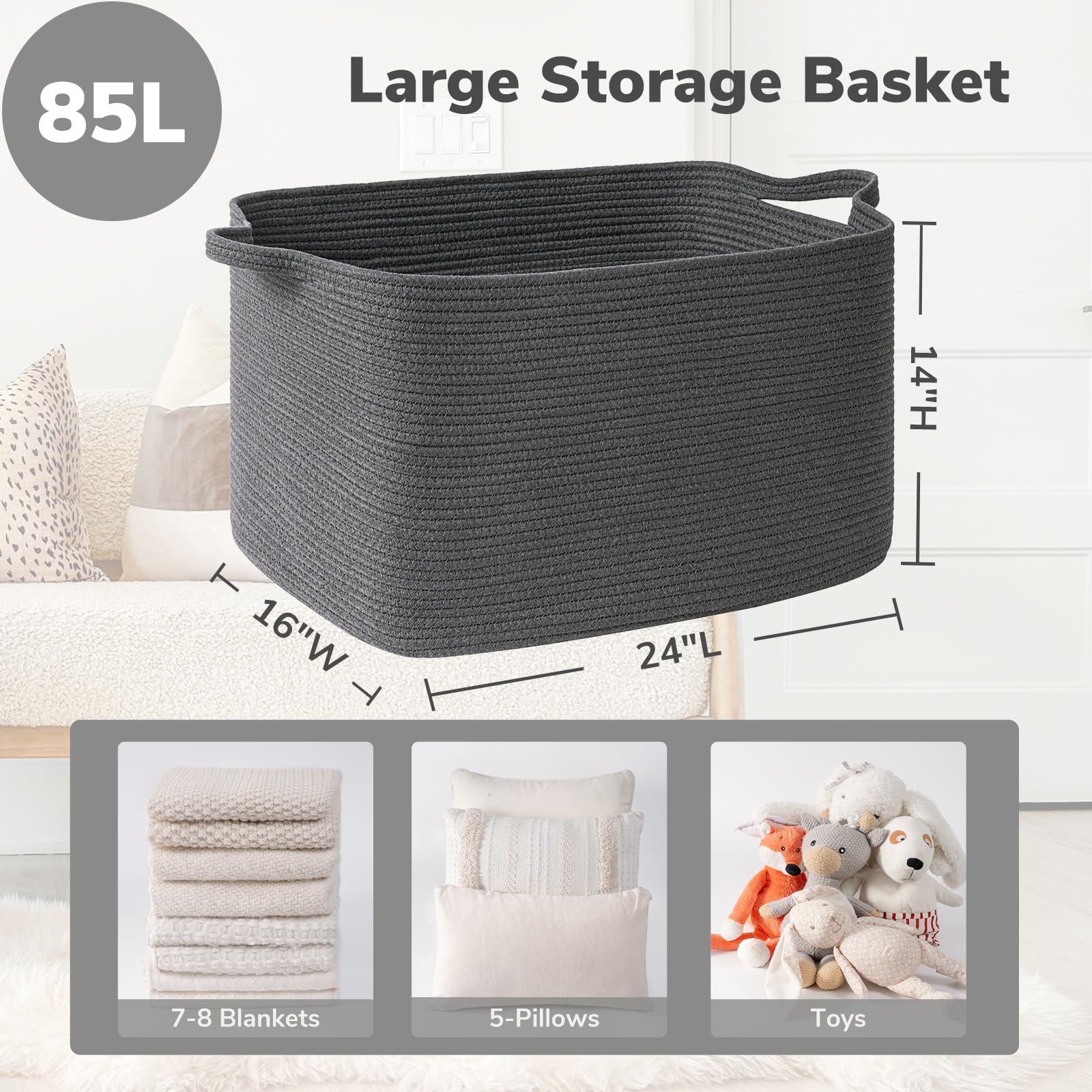 Spacious and Versatile: Measuring 23.6"L x 15.7"W x 13.8"H with a 85L capacity, this large rectangle basket is perfect for storing blankets, pillows, clothes, towels, toys, and more in the living room, helping you maintain a tidy living space