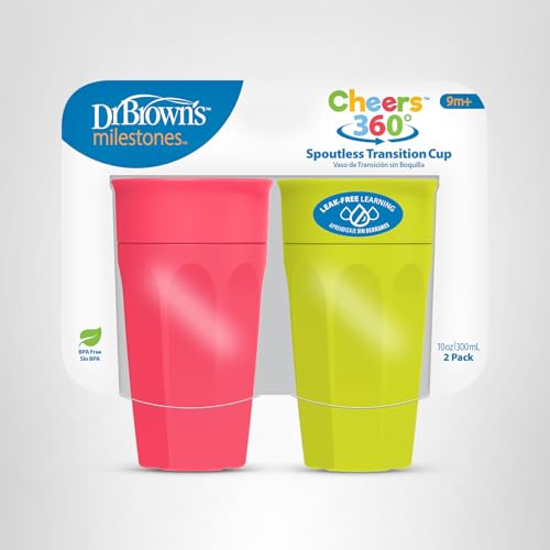 Dr. Brown's Milestones Cheers 360 Training Cup for Toddlers & Babies, Leak-Free Sippy Cup, Pink & Turquoise, 10 oz/300 mL, 9m+, 2 Pack (Colors May Vary)