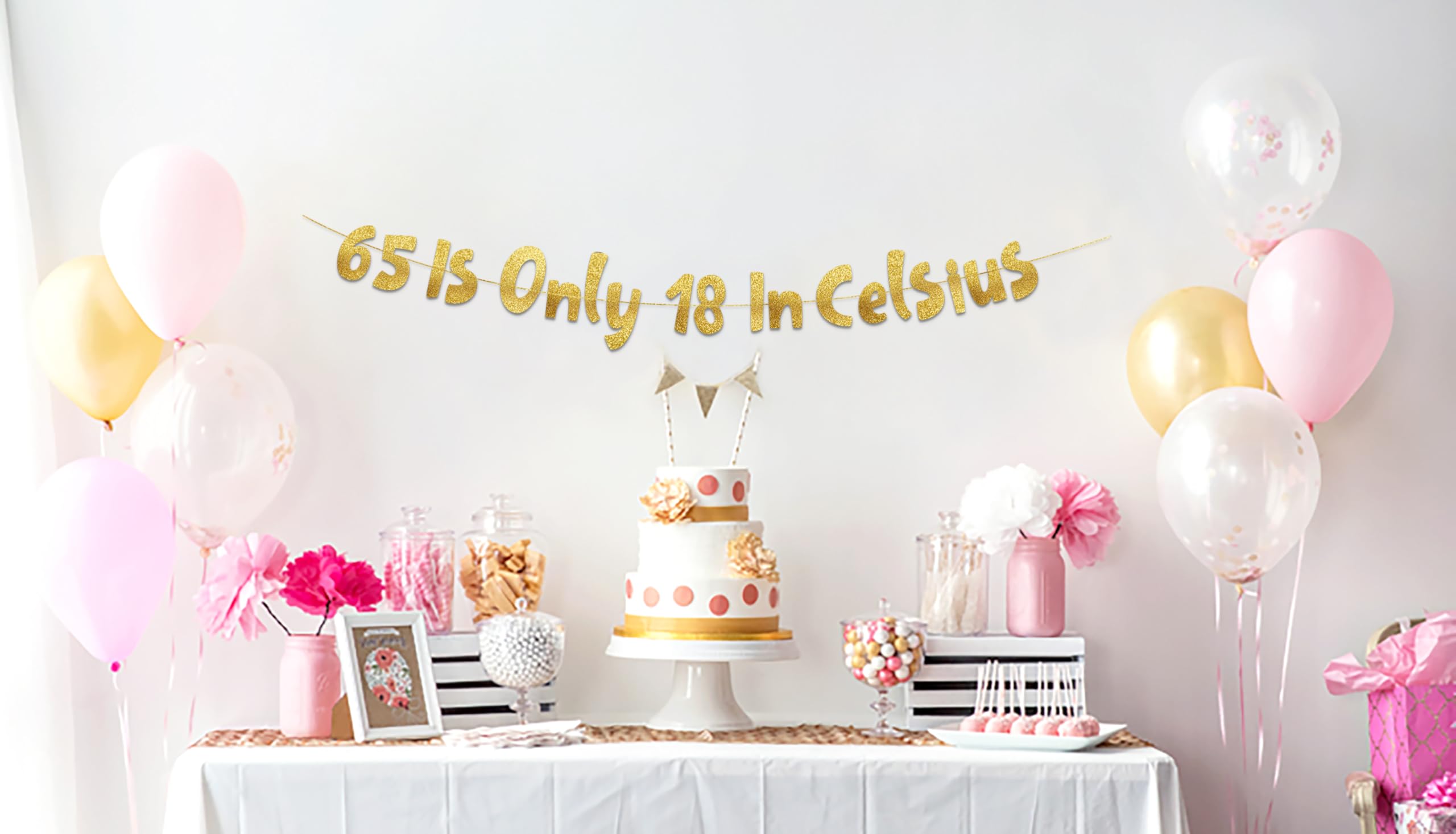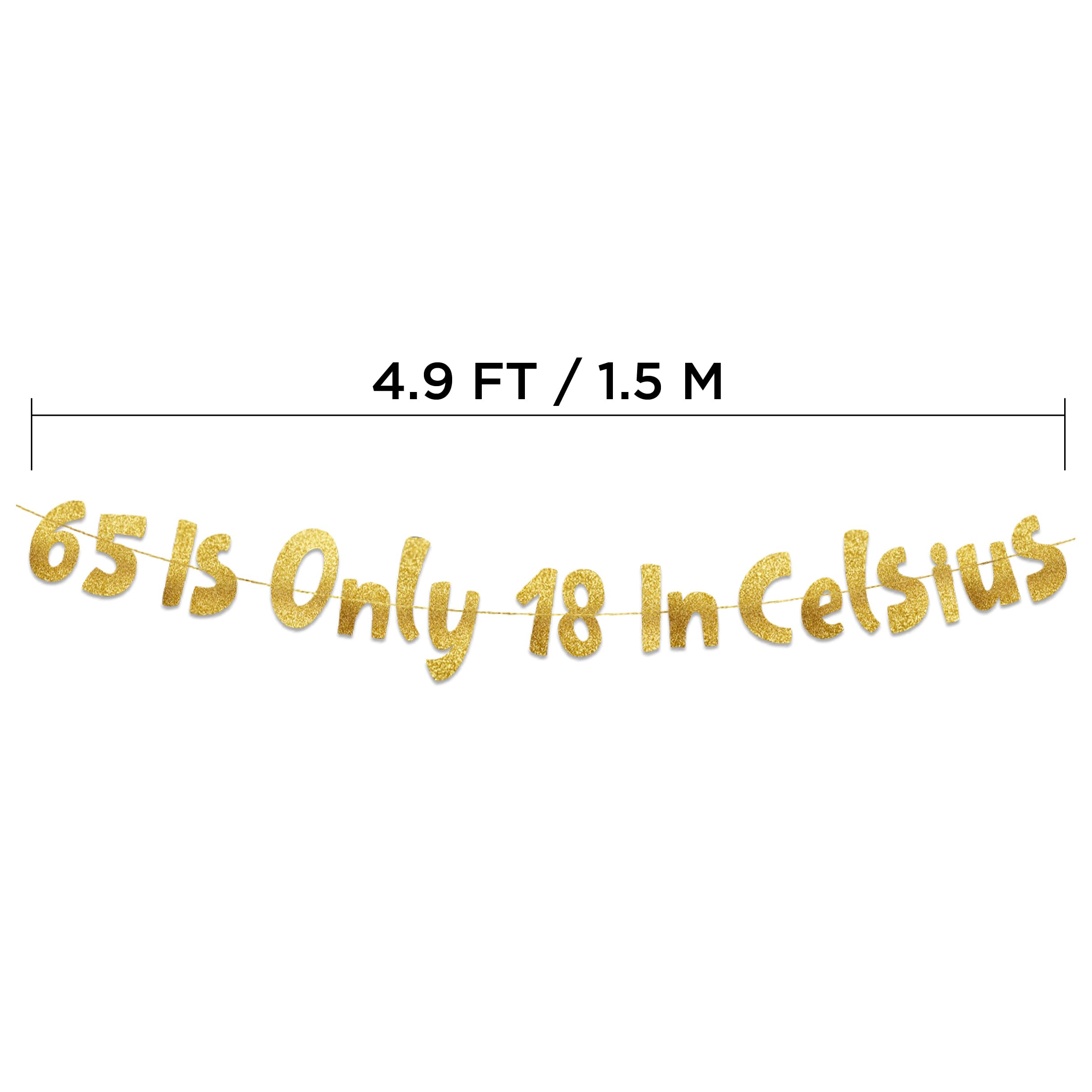 Happy 65th! What better way to celebrate than with our premium quality “65 is Only 18 in Celsius” gold glitter banner. This is the perfect decoration to add a touch of classy decor and welcome your guests to the occasion.