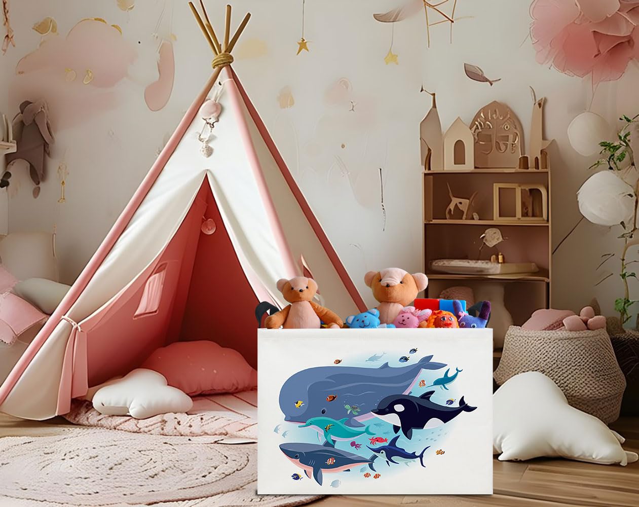 FOLDABLE BASKET SIZE: 14.9”L×10.2”W×9.8”H inches. Save on space when not in use and fold flat for easy storage, Perfect for baby shower gifts, toys, books, clothes, games, baby doll accessories, or match-box cars.