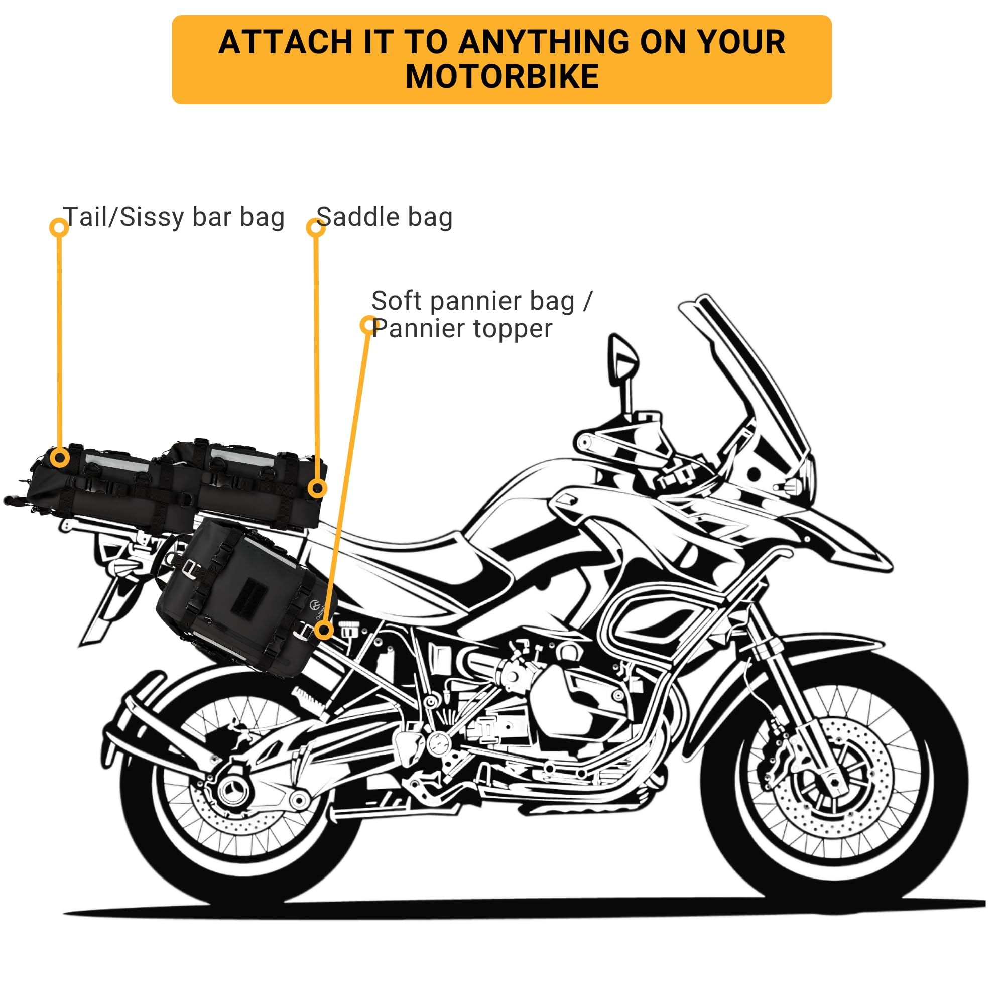 [UNIVERSAL & MULTIPURPOSE] The motorcycle side bags waterproof fits almost anywhere on any motorcycle, bicycle, ebike or ATV E.g. as bicycle panniers, rear bike bag, motorcycle saddle bag, sissy bar bags for motorcycles, tail bags for motorcycles, dirt bike bag