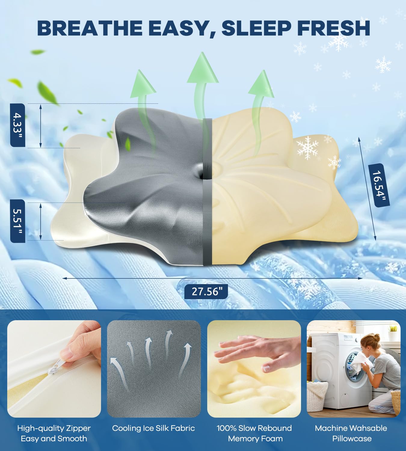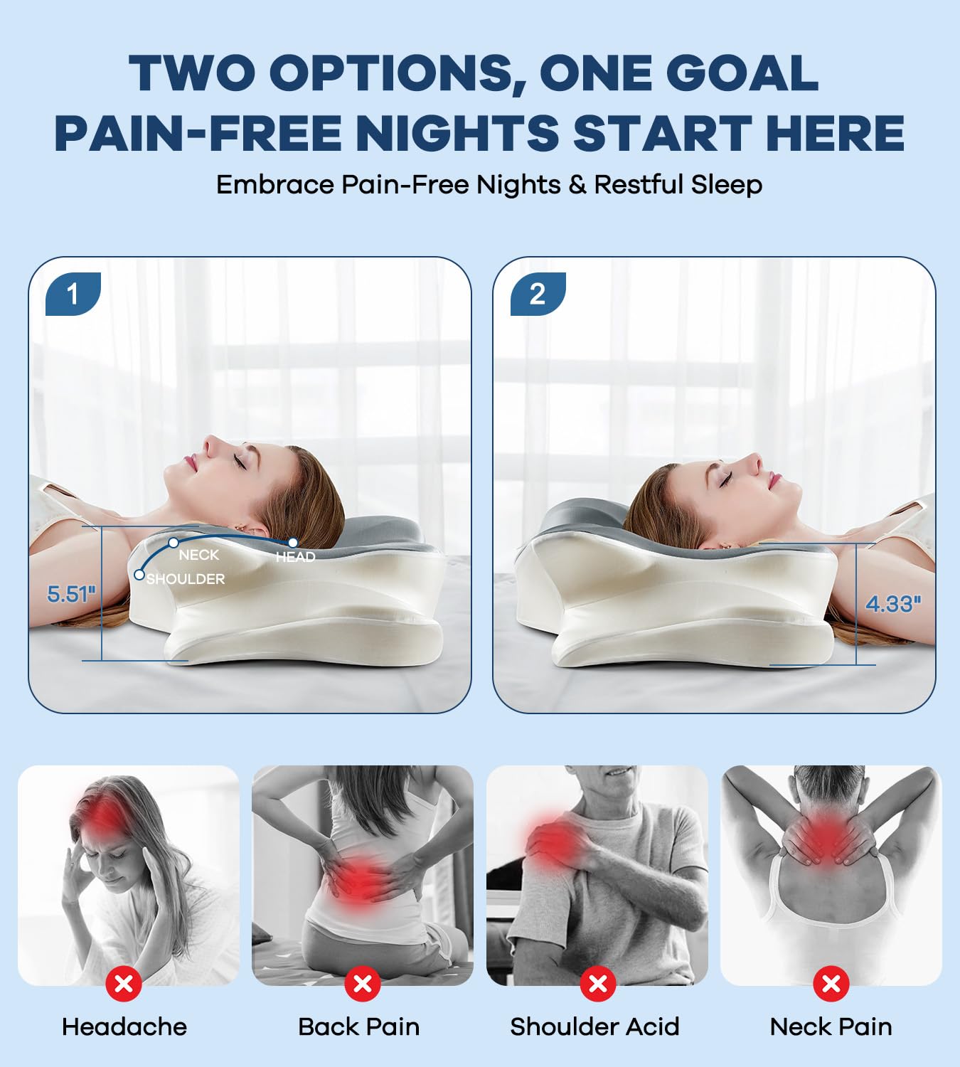 【QUALITY SLEEP STARTS WITH A GOOD PILLOW】Are you always waking up with neck cramps or back pain? Our proven ergonomically designed, contoured memory foam pillow supports your head, neck, shoulders and back perfectly. The innovative design allows our pillows to naturally fit your curved spine perfectly, providing proper support for spinal alignment,makes you to shift between positions comfortably.So you will wake up relaxed and start a more energetic day.