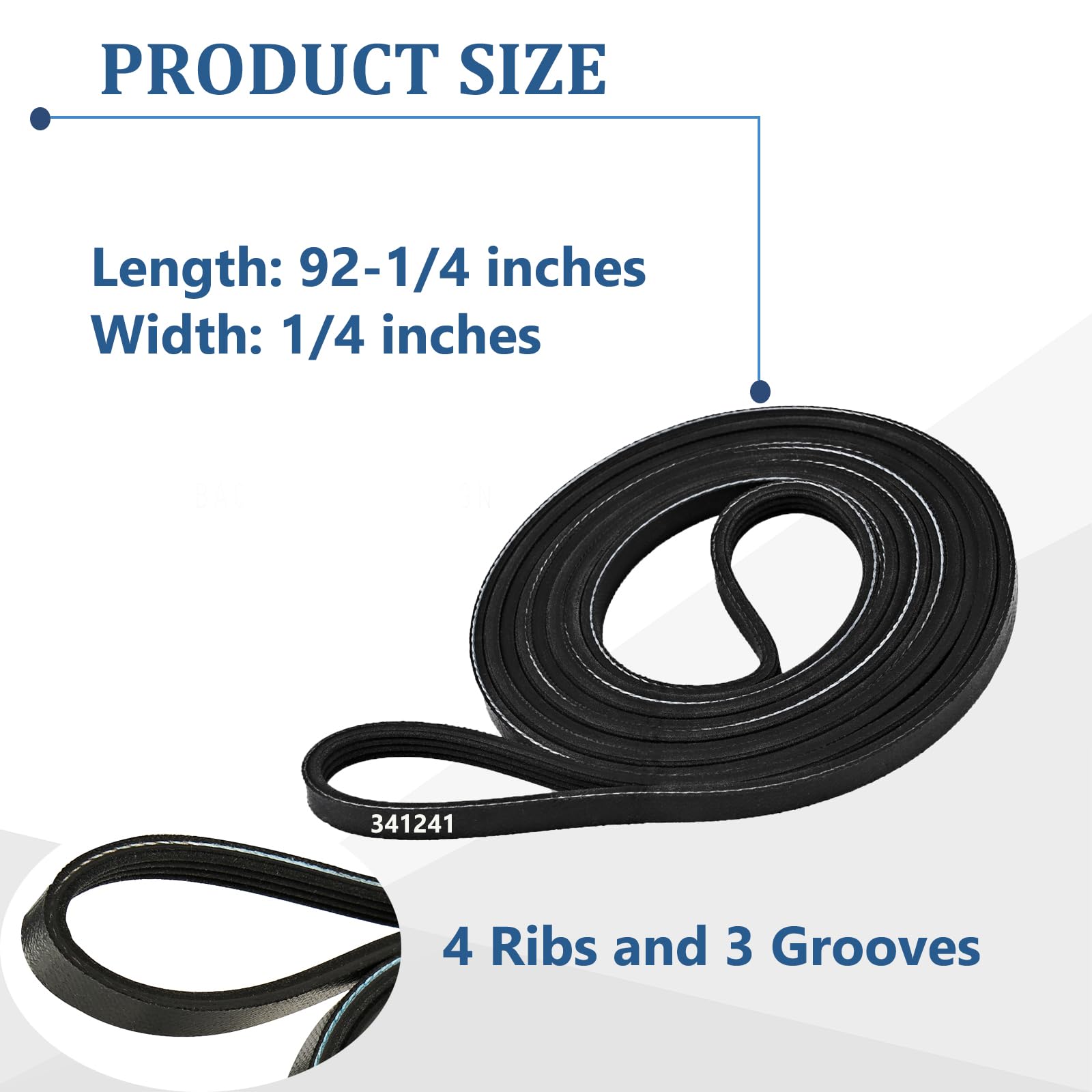 Features-- The drum belt features 4 ribs and 3 grooves,approximately 1/4" wide x 92-1/4" long,wrapping around the motor and pulley.When installing this part make sure the grooves are facing down, against the drum