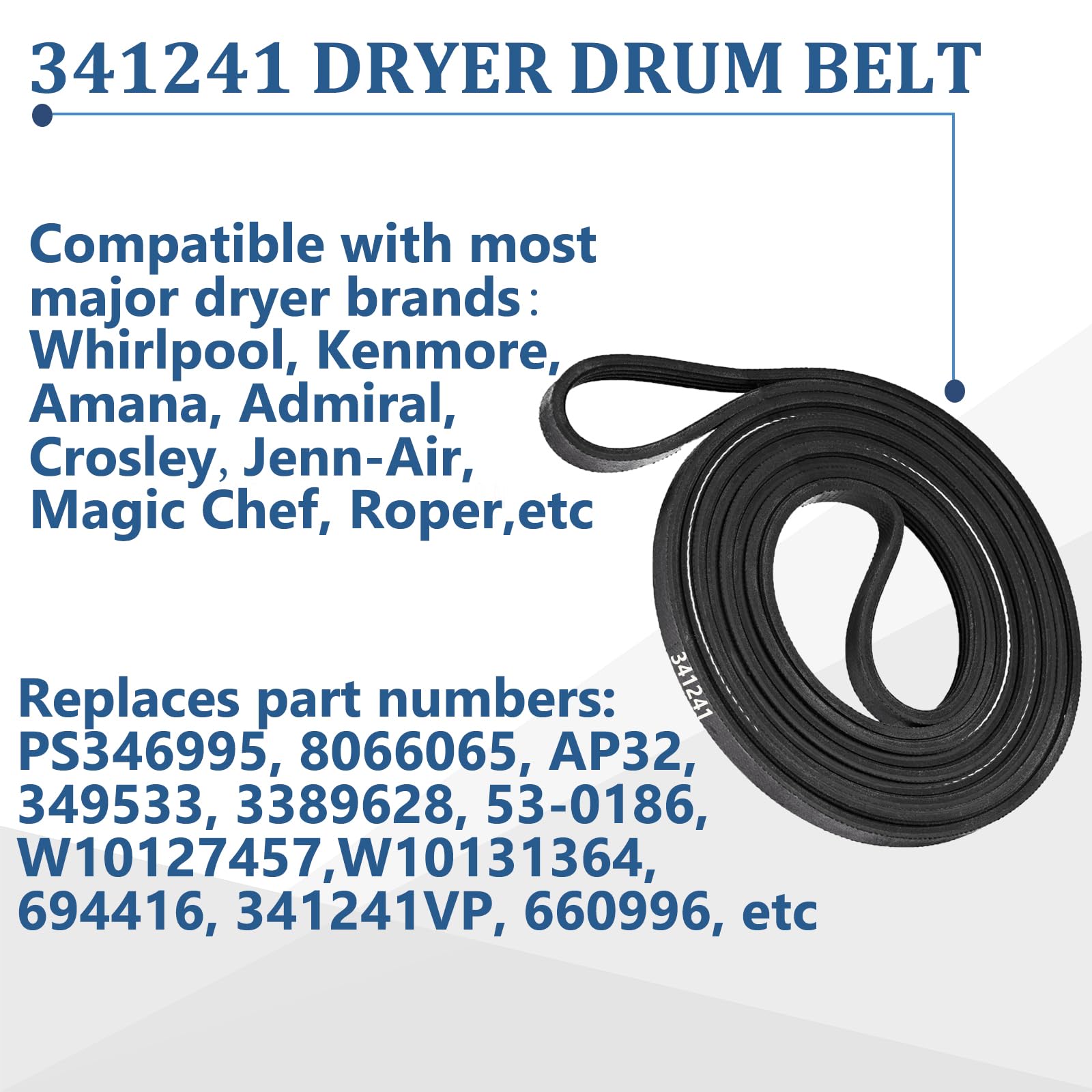 Replacement Part Number-- The 341241 Dryer Drum Belt replaces part numbers: PS346995, 14210003, 2008, 26000341241, 26000349533, 31001026, 31531589, 3389628, 3392665, 3394651, 3399844, 341241, 341241VP, 345473, 349533, 529597, 53-0186, 53-1080, 53-1528, 53-1589, 53-2671, 53-2910, 660996, 660997, 661561, 693306, 694088, 694416, 694868, 695055, 697388, 8066065, 8206, 8210, 99906951, 99989673, 99989674, AP2946843, AP32, FSP341241, P46-037, P46-149, W10127457, W10131364