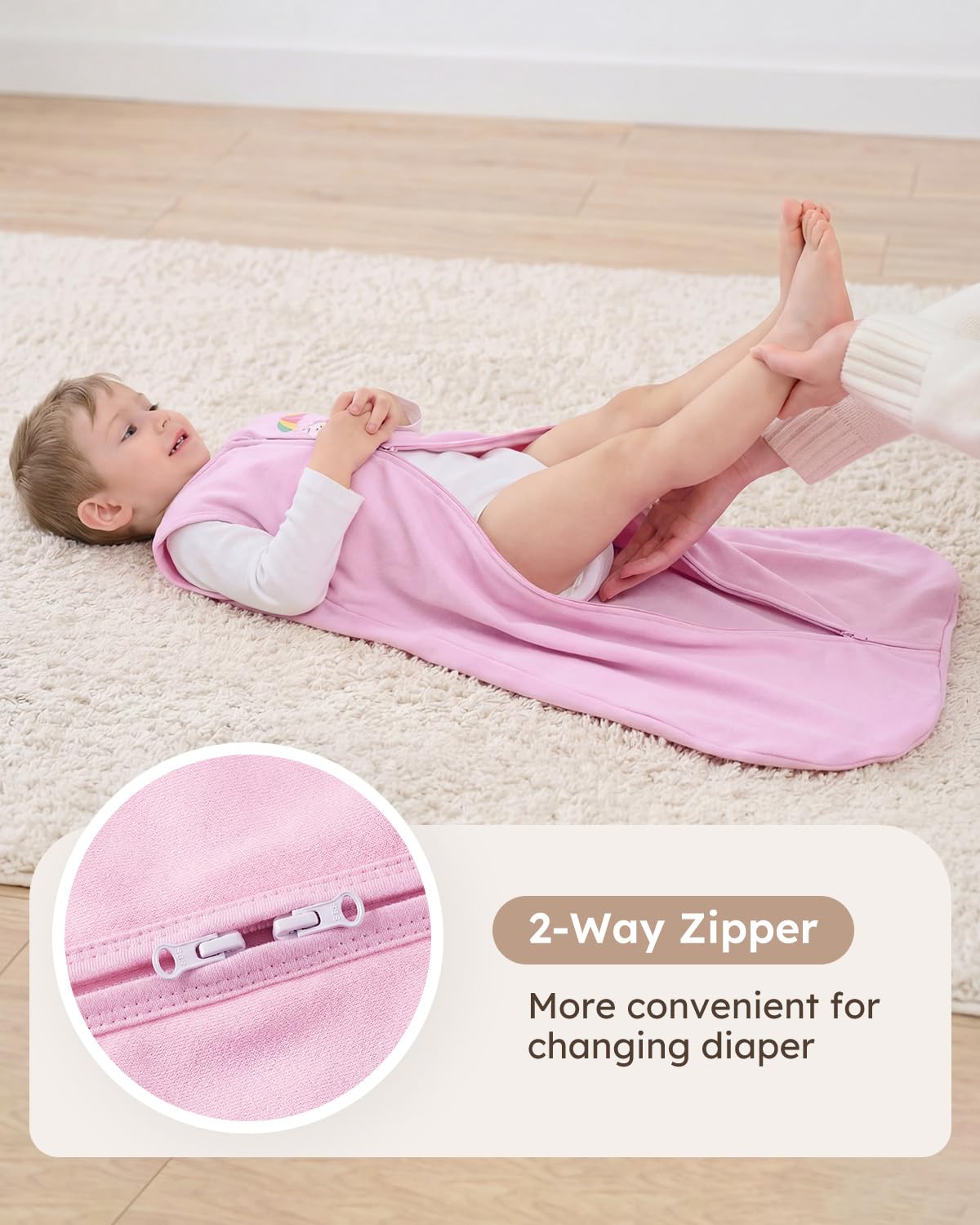 Smooth 2-Way Zipper: Our sleep sack double zipper makes midnight diaper change easily. The interior zipper guard and top zipper cover protect any scratches or discomfort from baby's delicate skins, ensuring the safety of your beloved baby.