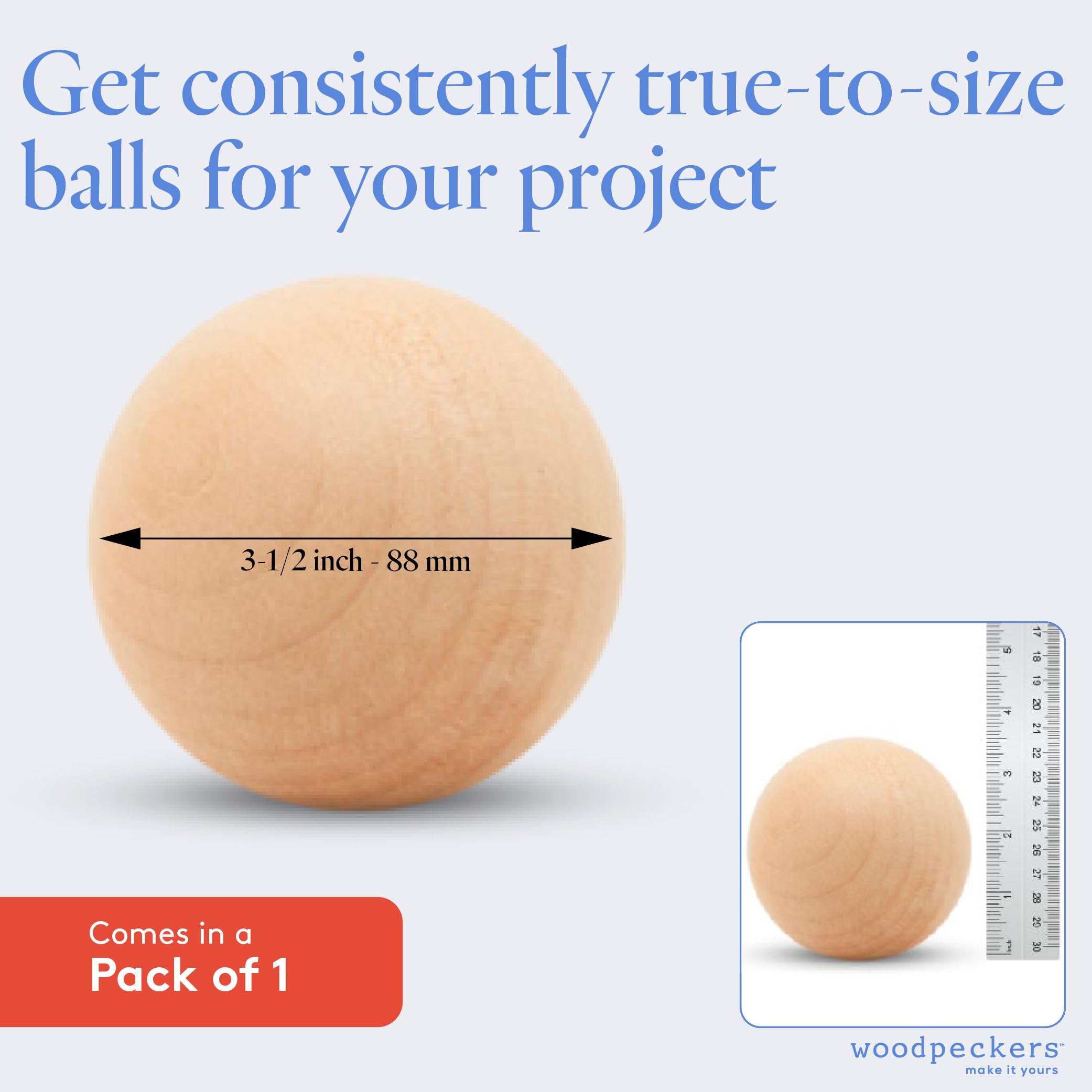 Serious Crafts Need Serious Quality "Best wood ball on the market" might seem like just a claim, but when you're a serious wood crafter, quality just matters. Woodpeckers' 3-1/2" wood spheres for crafts are made of one piece of premium birch and have a smooth and perfectly round finish so you can get crafting right away.Make-Them-Anything Wood BallsPut these versatile wood balls to a thousand uses. Need some ideas? How 'bout finial-like toppers for gate or lamp posts or embellishments or decorative wood ball ornaments for any home décor project? So get your hands on this classic craft ball, and run with it!Always Fits Your CraftUnfinished wood balls mean you can craft them exactly the way you'd like and to match any project. Stain? Paint? Wood burning? Engraving? They're all perfect for our smooth and easy to decorate crafts balls, so… you choose!