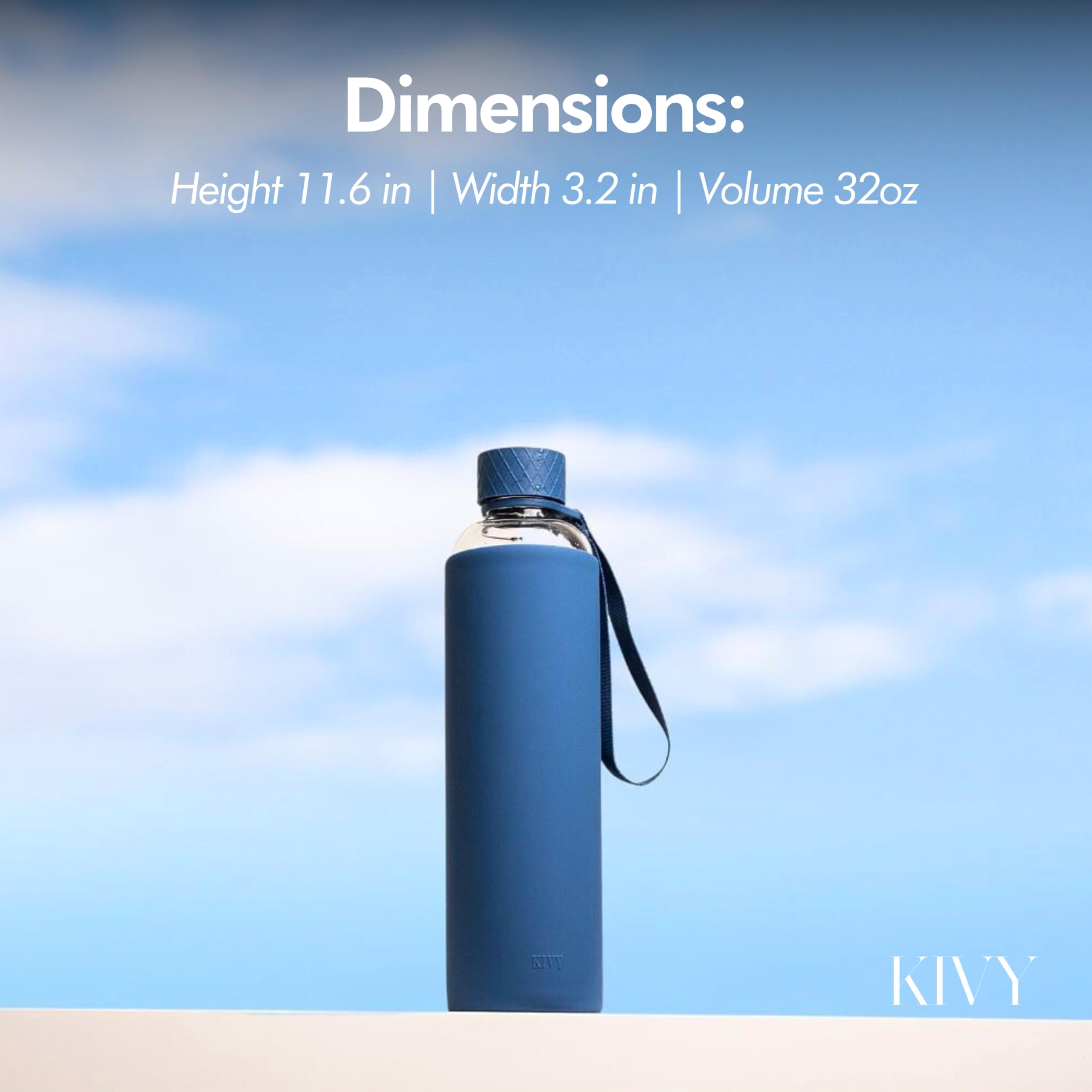 DETAILS: Borosilicate Glass water bottle with screw top and handle strap: V 32 oz | H 11.6 in | W 3.2 in| Comes in a minimalist and secure packaging.
