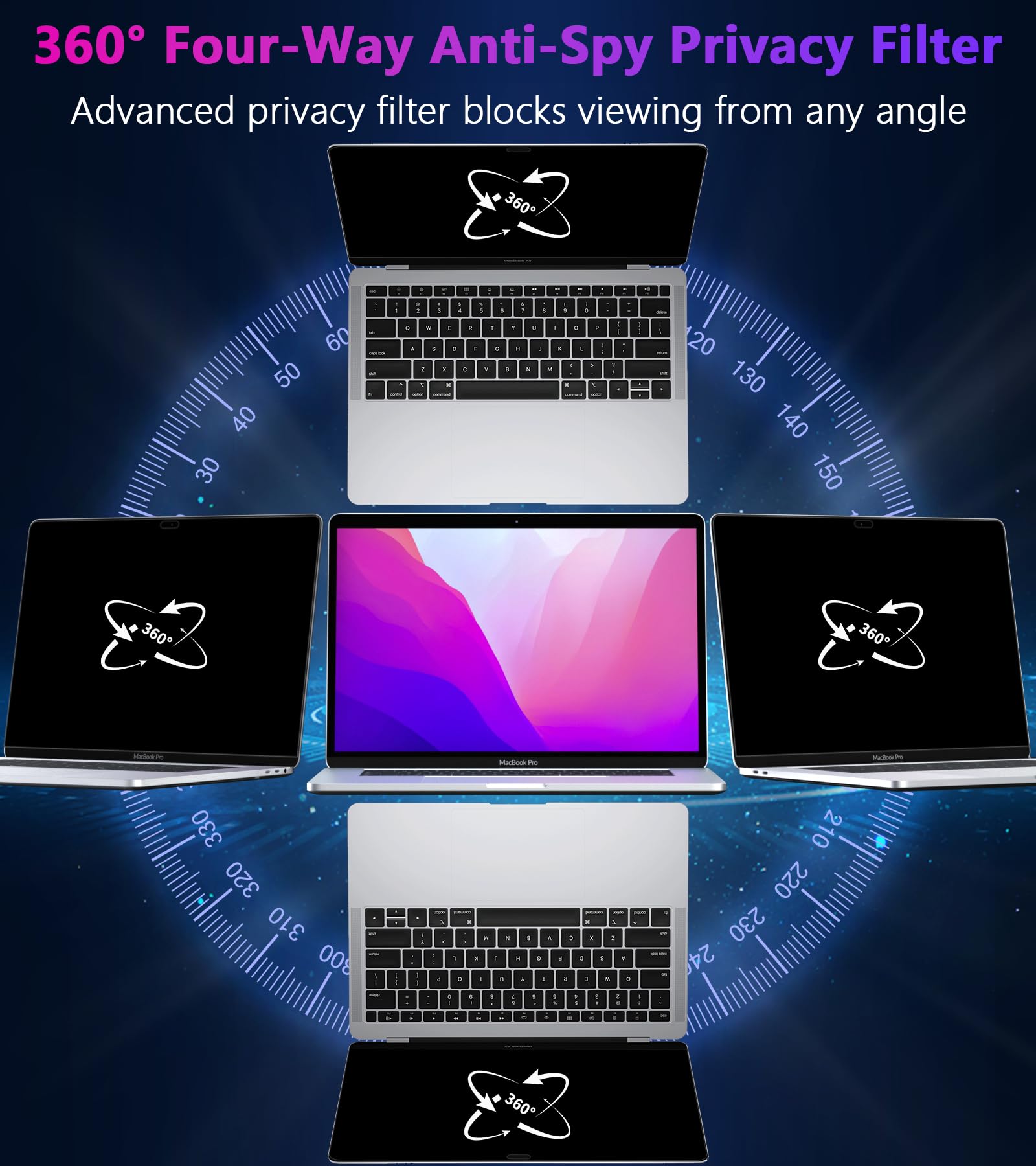 【Unmatched 4-Way 360° Privacy Protection】 Experience the ultimate in privacy with our innovative 360° design. This advanced technology effectively restricts viewing angles from all sides, allowing only the user in front to see the screen. Perfect for open offices, cafes, and public spaces, it safeguards your sensitive information from prying eyes.