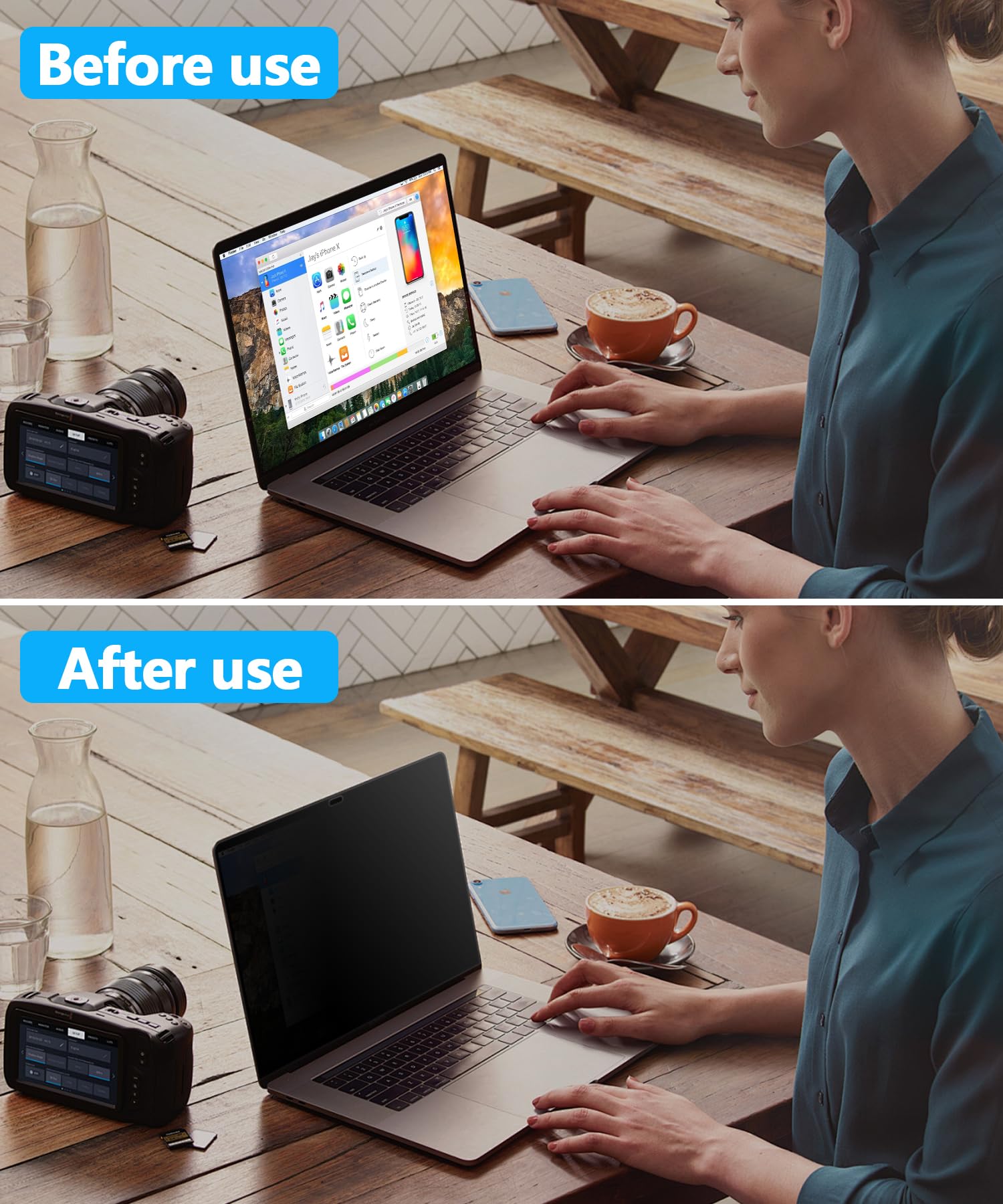 【PLEASE NOTE】The privacy screen features microfine louvre optics. After applying the anti-privacy film, the screen brightness will decrease and the vivid colours of the display will be reduced to a certain extent. If you need to achieve the original visual effect, it is recommended to turn up the brightness of the bright screen.