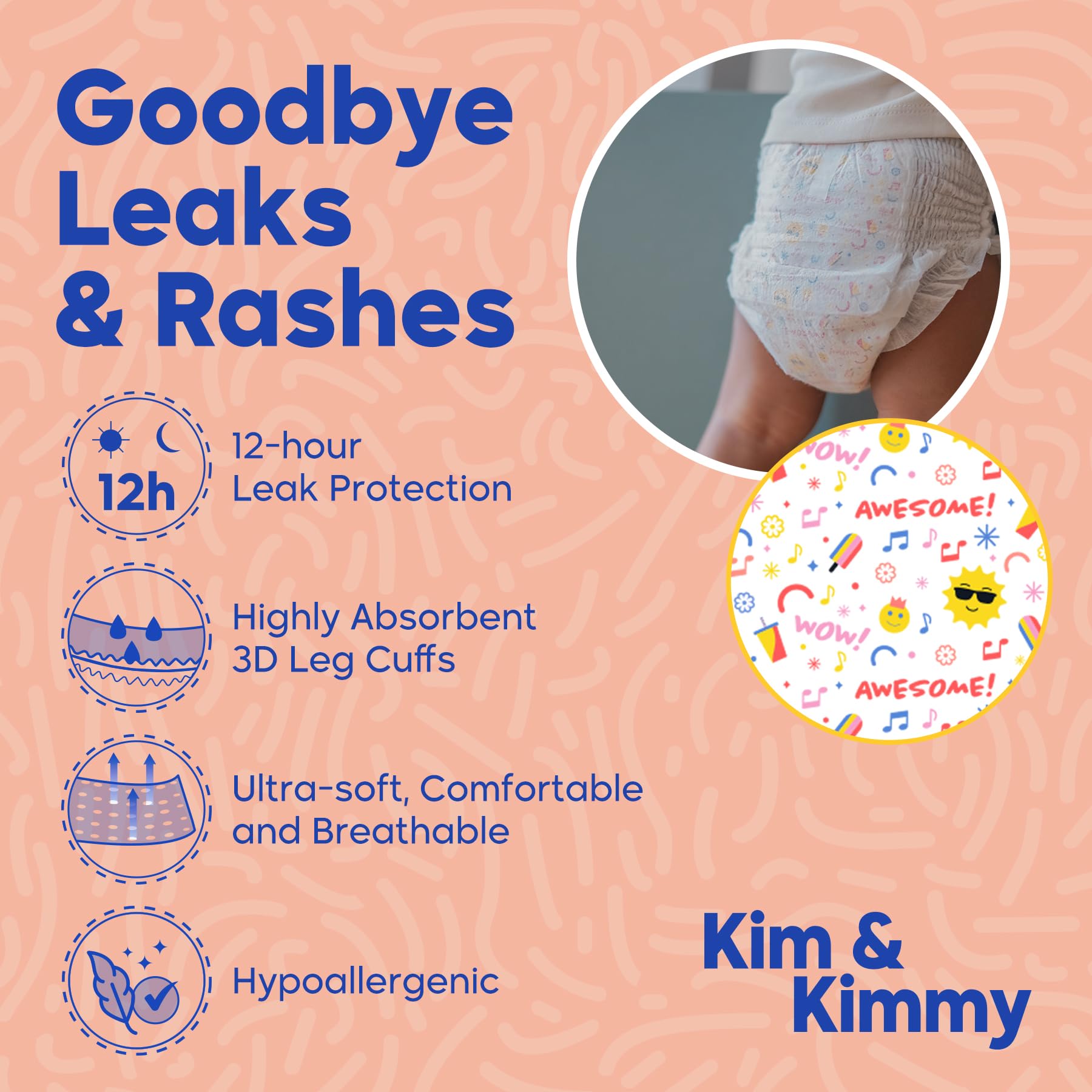 NO LEAKS! 12-HOUR LEAKPROOF PROTECTION - Kim & Kimmy diaper pants guarantee up to 12 hours of leak-free protection. Our 3D magic leg-cuffs ensure maximum absorption with absolutely no leaking, so you and your baby can enjoy a stress-free night.