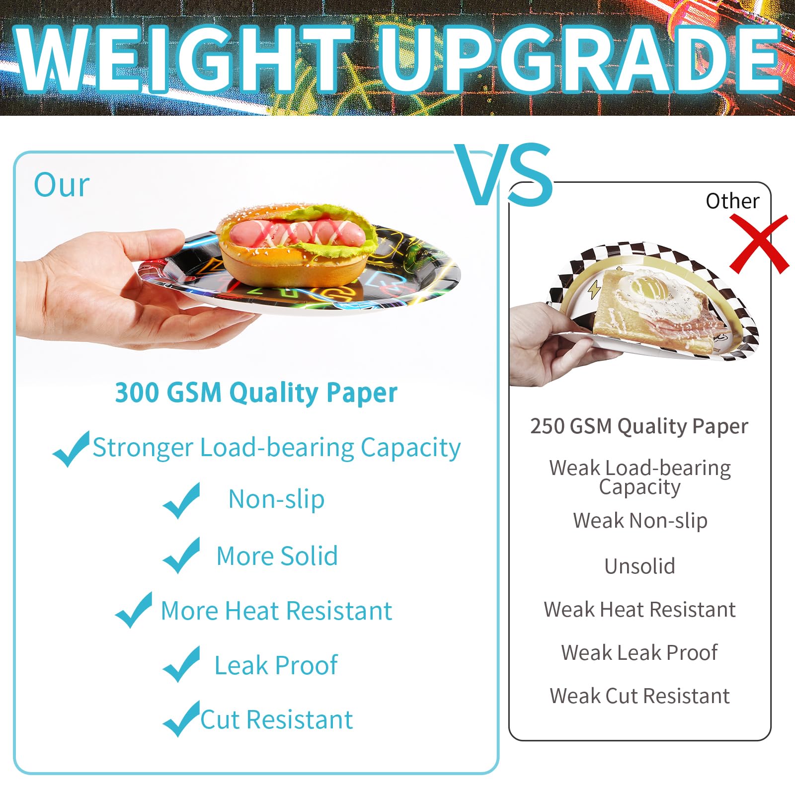 【High Quality】Our neon plates are made of high quality paper, 300g weight bearing, can easily carry a variety of food, solid and durable cut resistant. The napkin is 3-ply, soft and absorbent, not easy to tear. The fork is made of high quality plastic, not easy to break. Laser patterns and colors are beautifully printed and not easy to fade. High-quality material ensures you enjoy the party smoothly and hassle-free! (Tip: Please do not microwave the plates.)