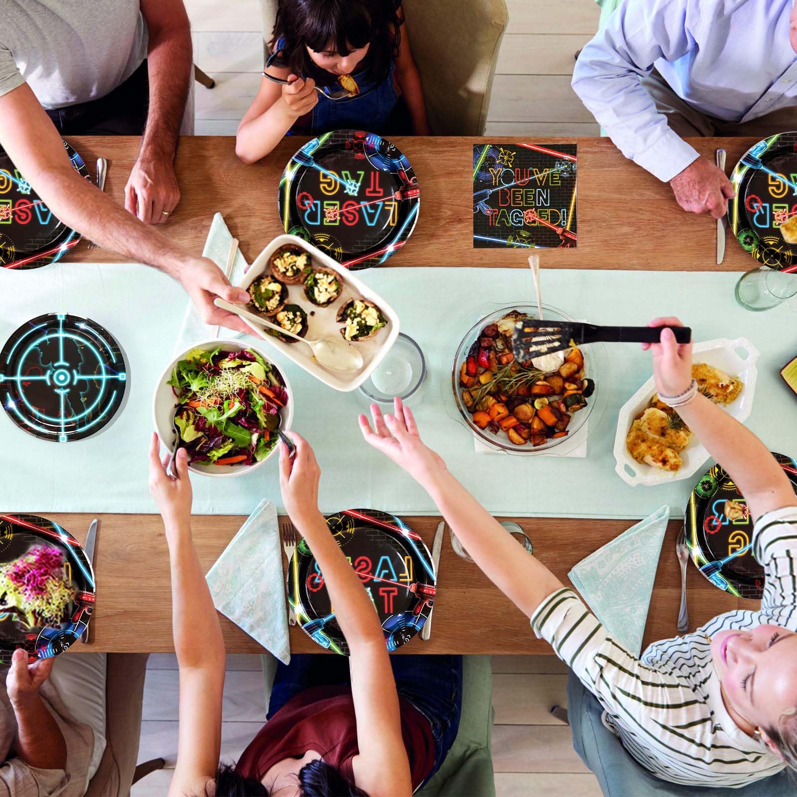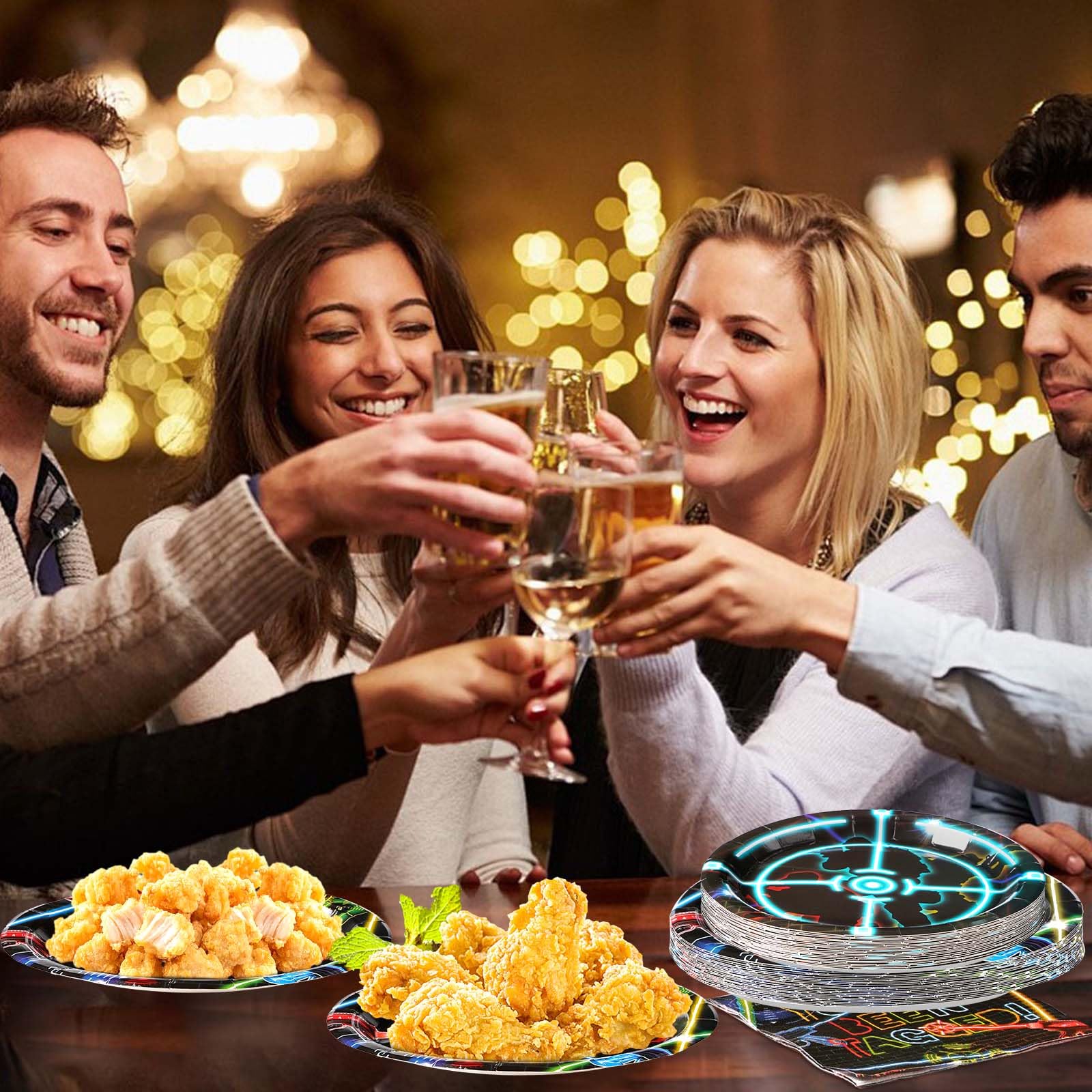 【Laser Tag Party Supplies】Get ready to light up your fabulous party with our 96 pcs laser tag tableware set! Each set includes 24 9" laser tag dinner plates, 24 7" laser tag dessert plates, 24 laser tag napkins and 24 forks for up to 24 guests, ensuring everyone is equipped for an epic laser tag battle. Get ready to glow and conquer!